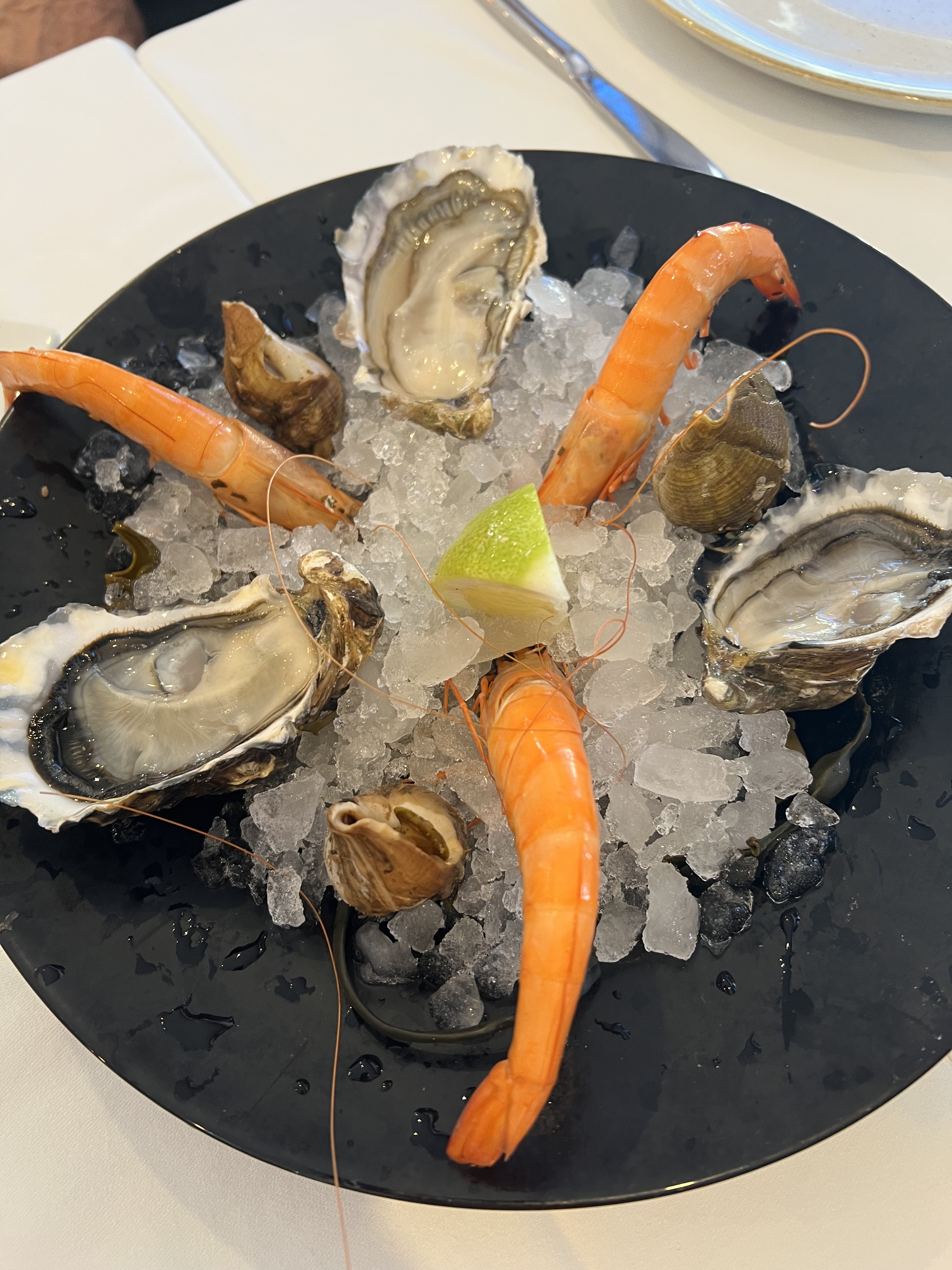depuis le temps que nous passons devant ce restaurant nous avons fait une tentative un dimanche soir et avons commandé un plateau de fruit de mer (le royal) et des sashimi. mais le serveur oublie quelque chose d'important: les assiettes! rien de grave cependant:) nous avons été plutôt déçus par les fruits de mer pas formidables, les crevettes et langoustines etaient pleines d'eau par exemple. on a vu beaucoup mieux comme plateau de fruit de mer. Le pain de seigle était rassis. je demande du pain blanc, ce n'était guère mieux, il ne sortait pas d'une boulangerie. . Le vin était lui excellent. bref du laisser aller, c'est dommage.