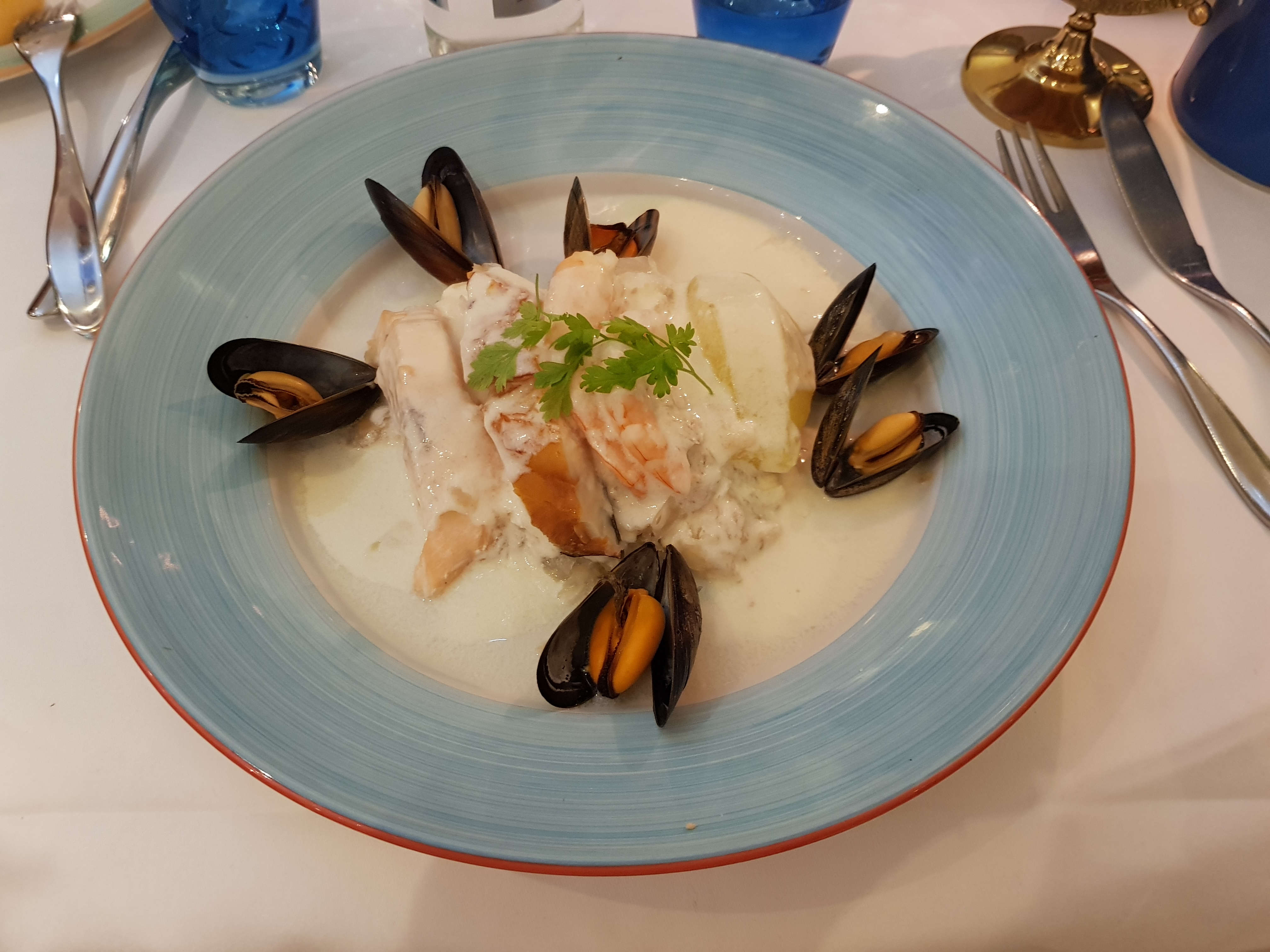 Une belle vue sur la mer ! Le restaurant est agréable, la luminosité est très bonne, les recettes sont classiques et les prix sont élevés. Le service est professionnel, la clientèle est âgée.