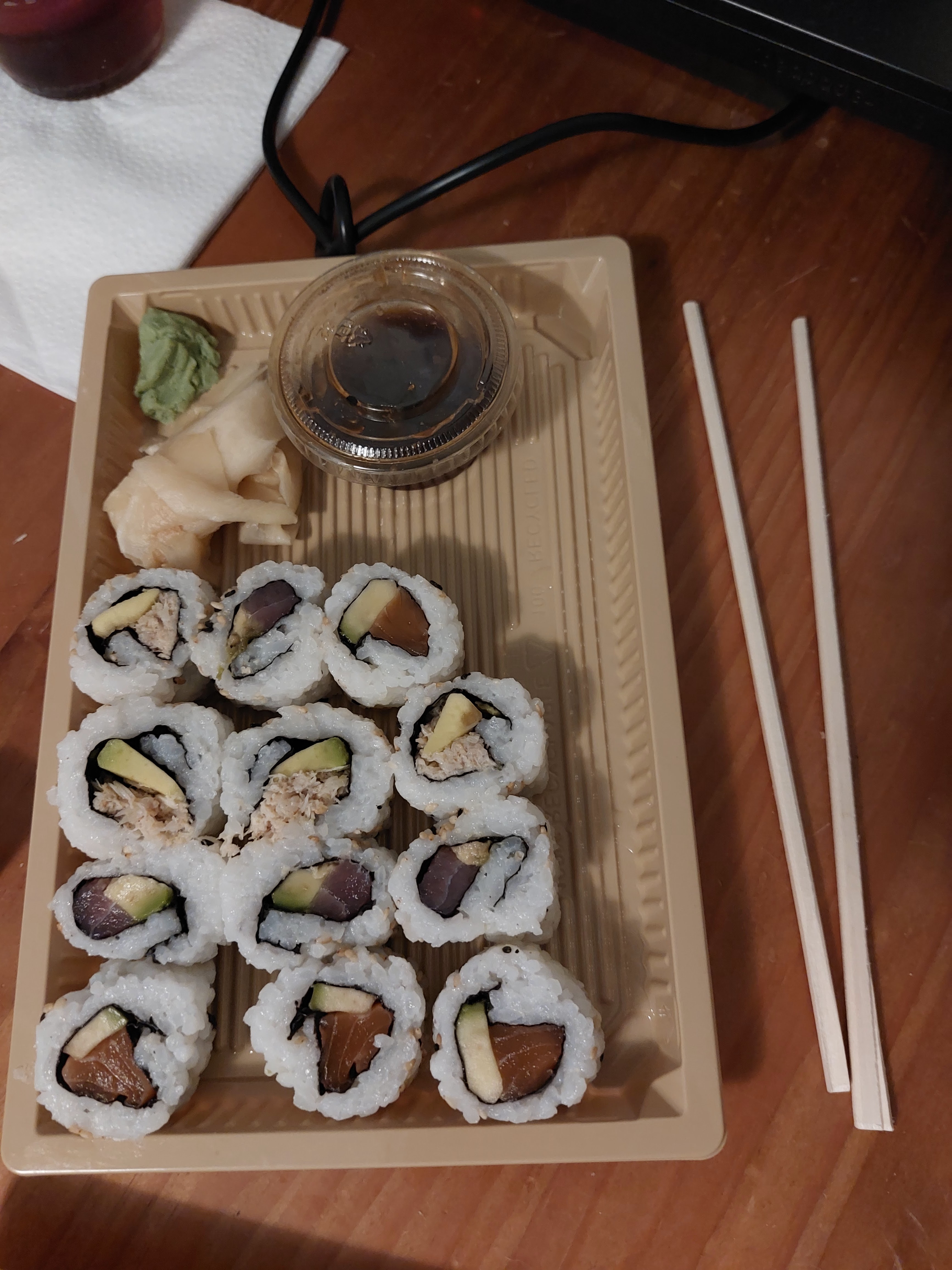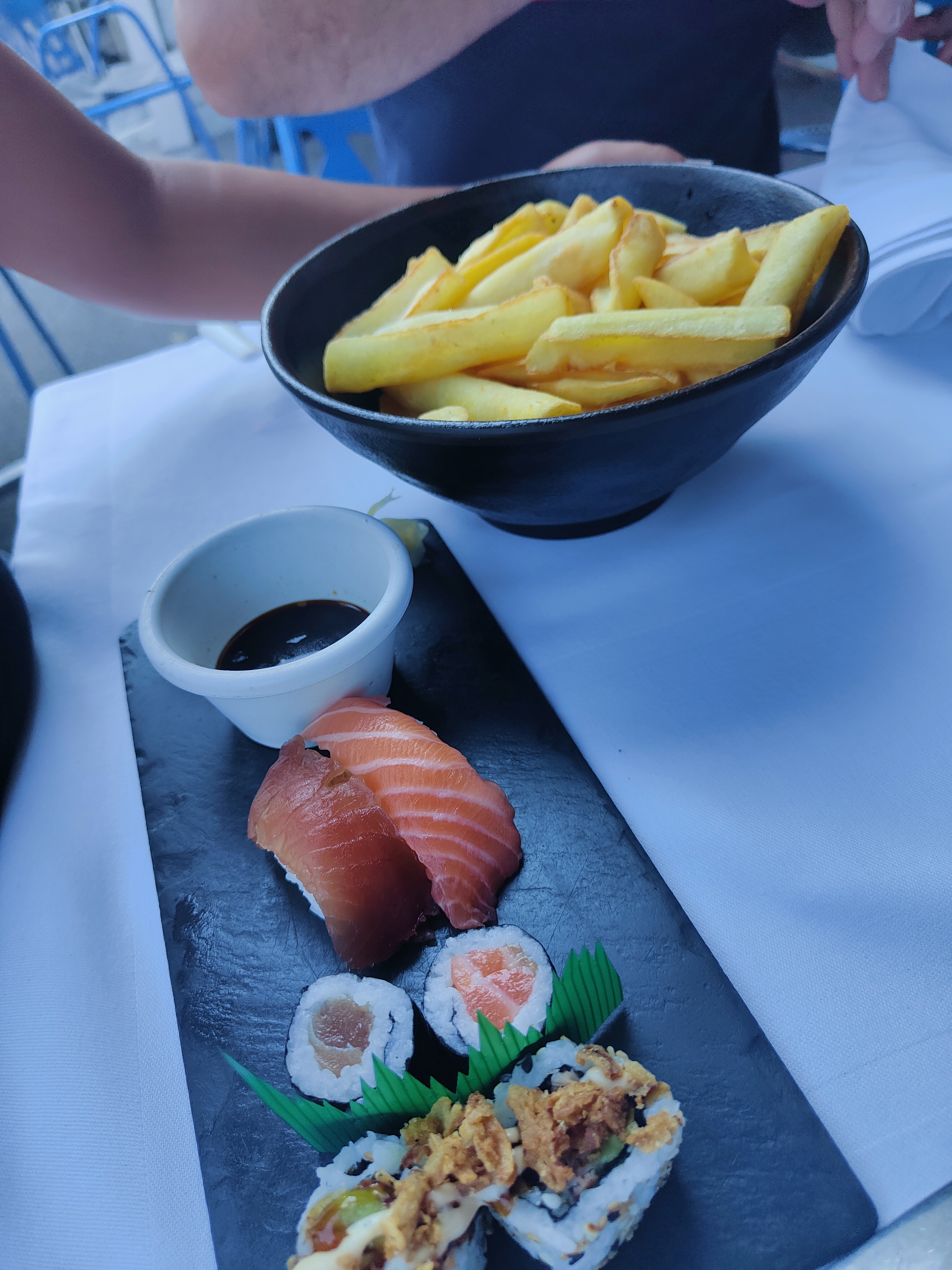 J’ai opté pour le menu, plat +dessert, café et eau. Le plat du jour était un filet de merlan sauce hollandaise et sa purée de patate douce et légumes. Excellent. En dessert une crème brûlée légère et succulente. On a également pris un assortiment de Maki et sushi, succulent. Accueil agréable, je recommande vivement.