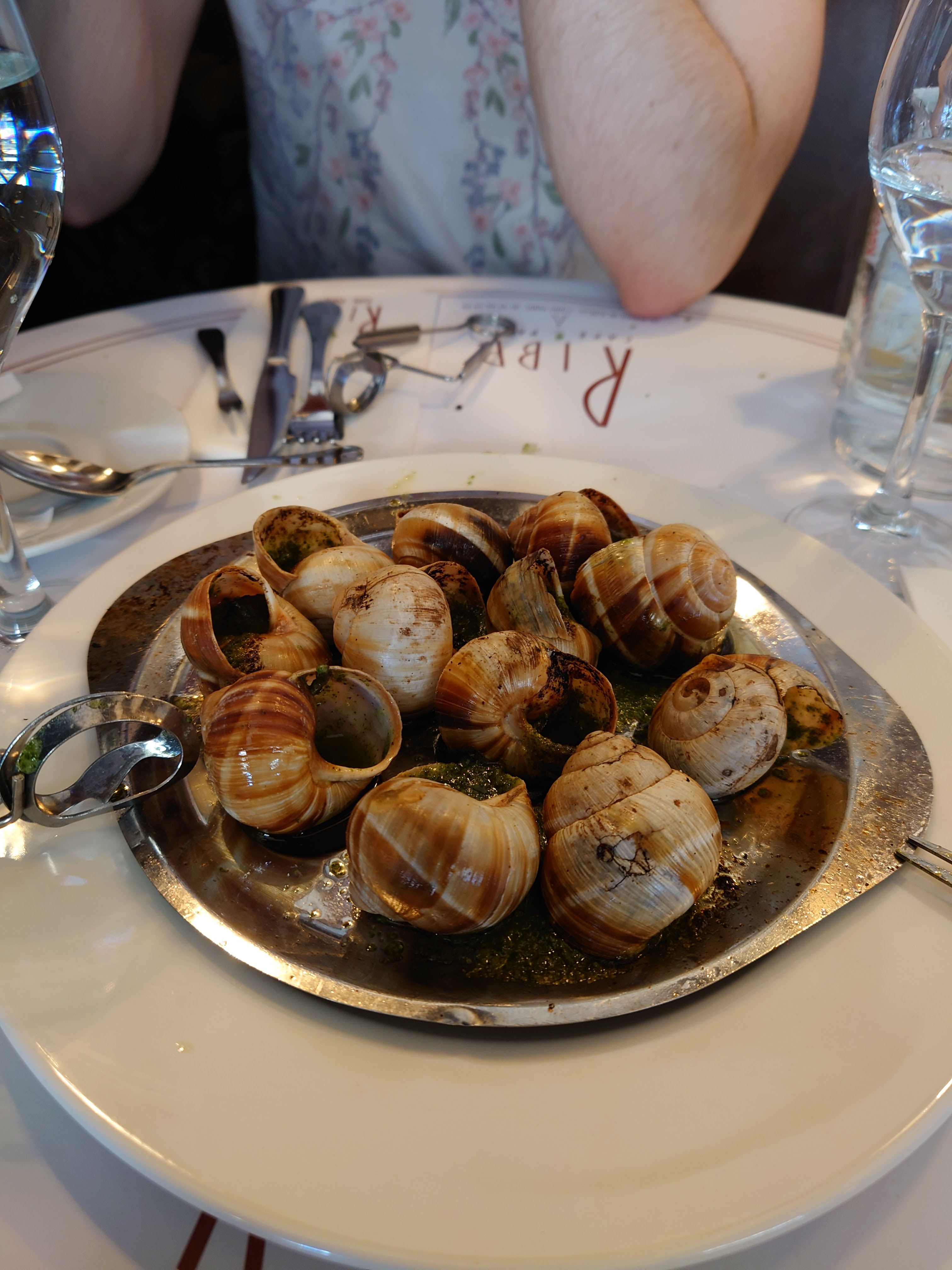 Nous nous sommes assis dehors avec le chauffage allumé pour nous garder au chaud. Nous adorons les escargots mais la soupe à l'oignon était peu salée. Le cheeseburger était ok. C'était sympa, c'était près de la Tour Eiffel.