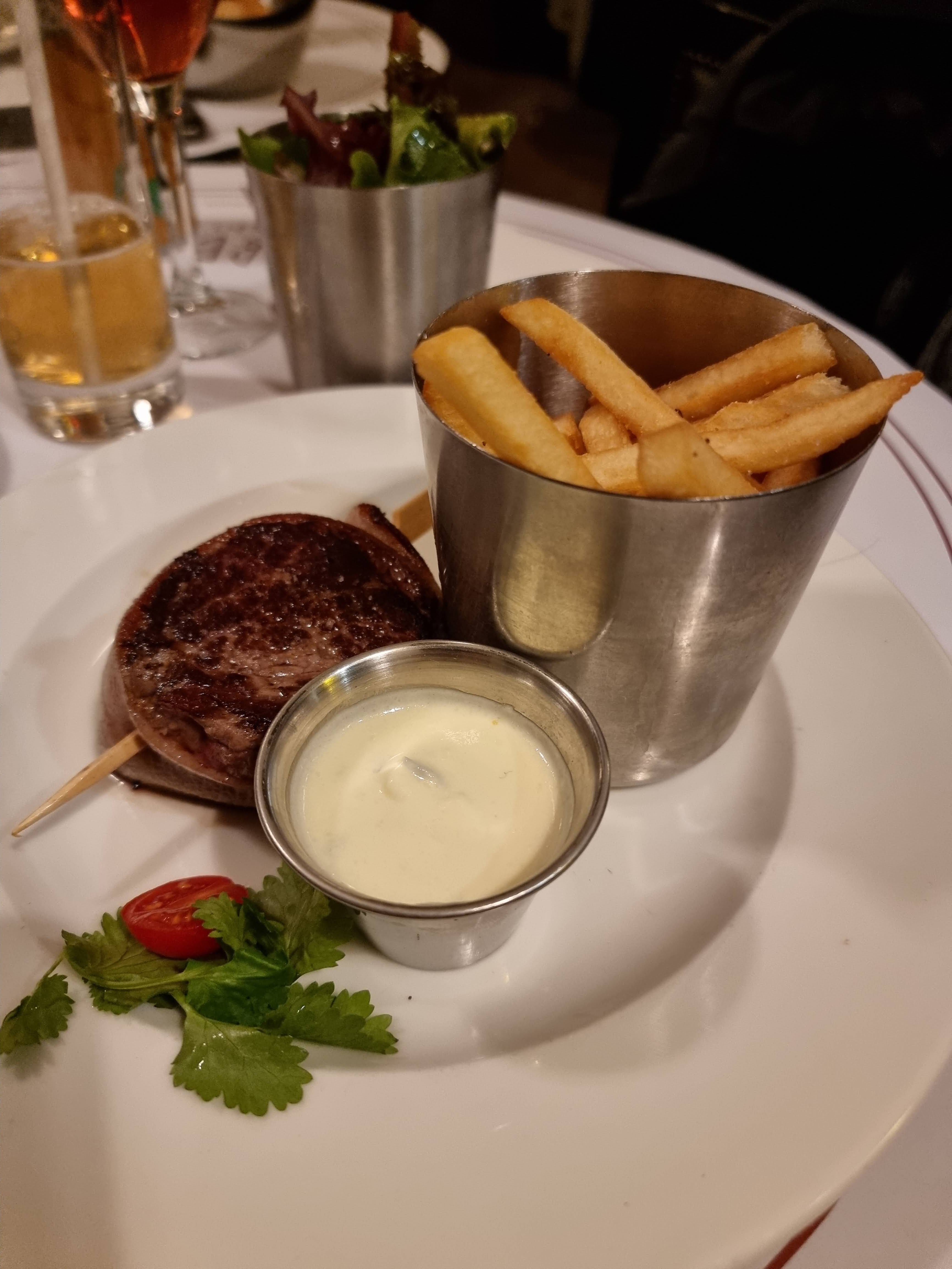Ce restaurant est juste au coin de la Tour Eiffel, donc nous ne nous attendions pas à grand chose, cependant nous avons été agréablement surpris, le Bœuf Bourgogne était excellent avec une sauce très savoureuse et un bœuf tendre. Le steak choisi par les bouchers était plein de saveur, tendre et cuit à la commande, moyennement rare. Nous avons eu une bouteille de Merlot qui à 30 € était très acceptable. La crêpe suzette était un peu trop alcoolisée et pas assez sucrée à notre goût, mais notre serveur Caleb était sympathique et efficace, donc ça vaut globalement le détour. Le vin est de bonne qualité et se compare bien aux prix de Dublin. La bière et les spiritueux sont des prix touristiques typiques de Paris : 10 € pour un demi-litre de bière + 20 € pour un gin tonic. Mon conseil, buvez le vin.