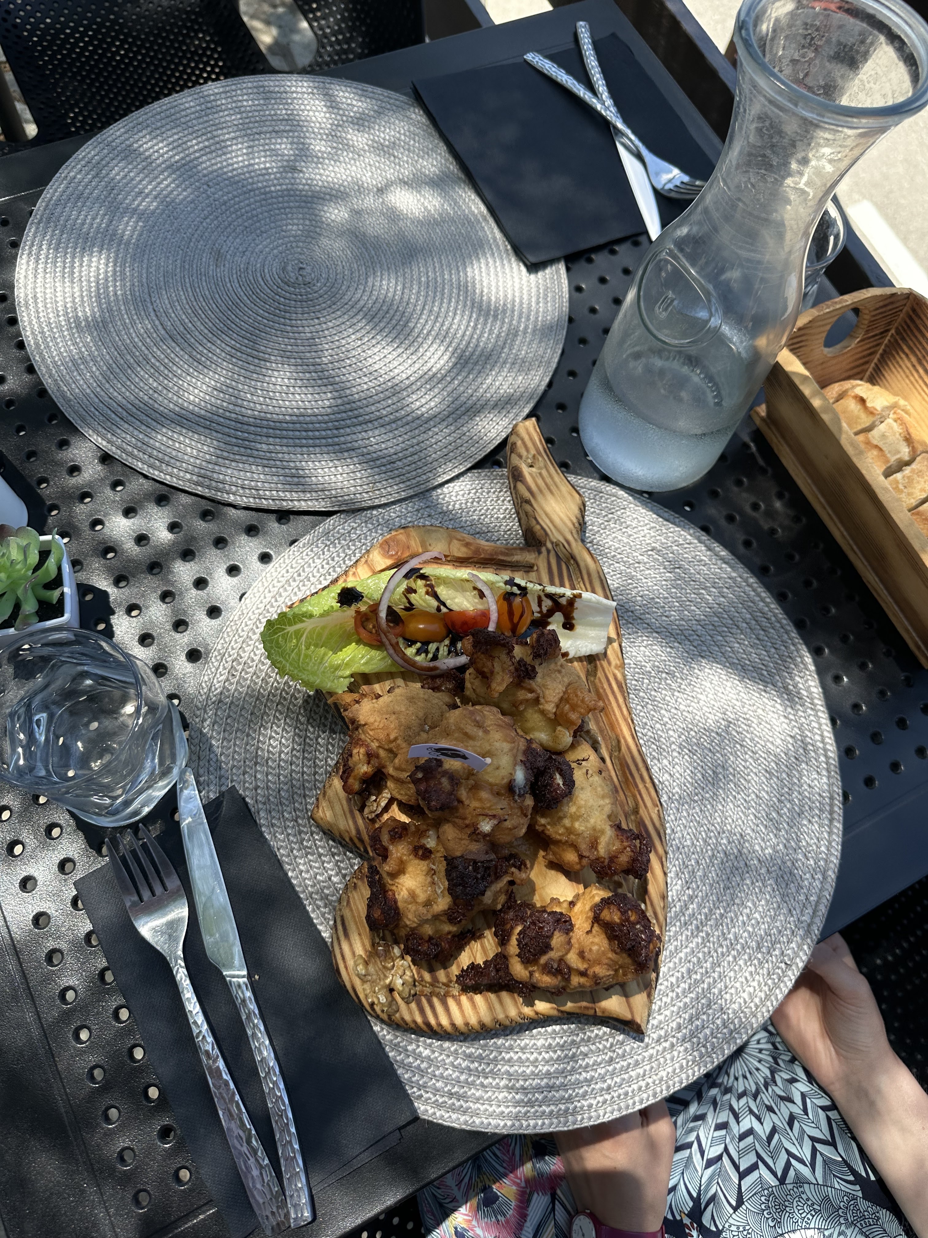 Bien située un peu à l'extérieur du port. Terrasse ombragée agréable. Service sympa. Il vaut mieux réserver. Les burgers sont beaux et bons. J'ai pris la salade Caesar. Copieuse !