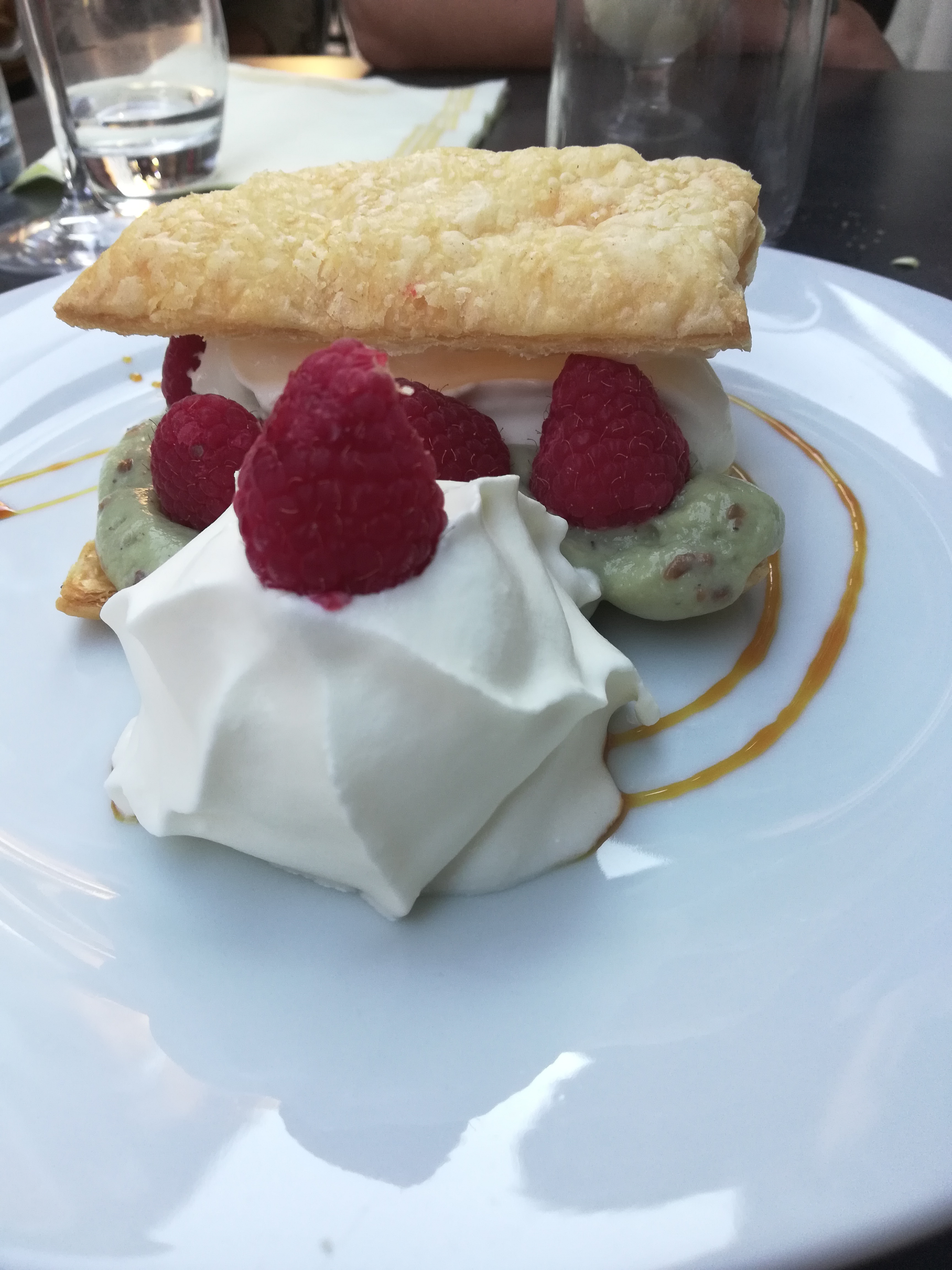 Repas ce midi avec ma mère et mon mari, juste après le marché de Nyons. C'était très très bon, parfait. Le mille feuille avec une crème pistache, des framboises fraiches, le croustillant de la pâte. Mon mari a adoré le filet de boeuf, cuisson parfaite. Et un accueil super sympa. Il faut y aller