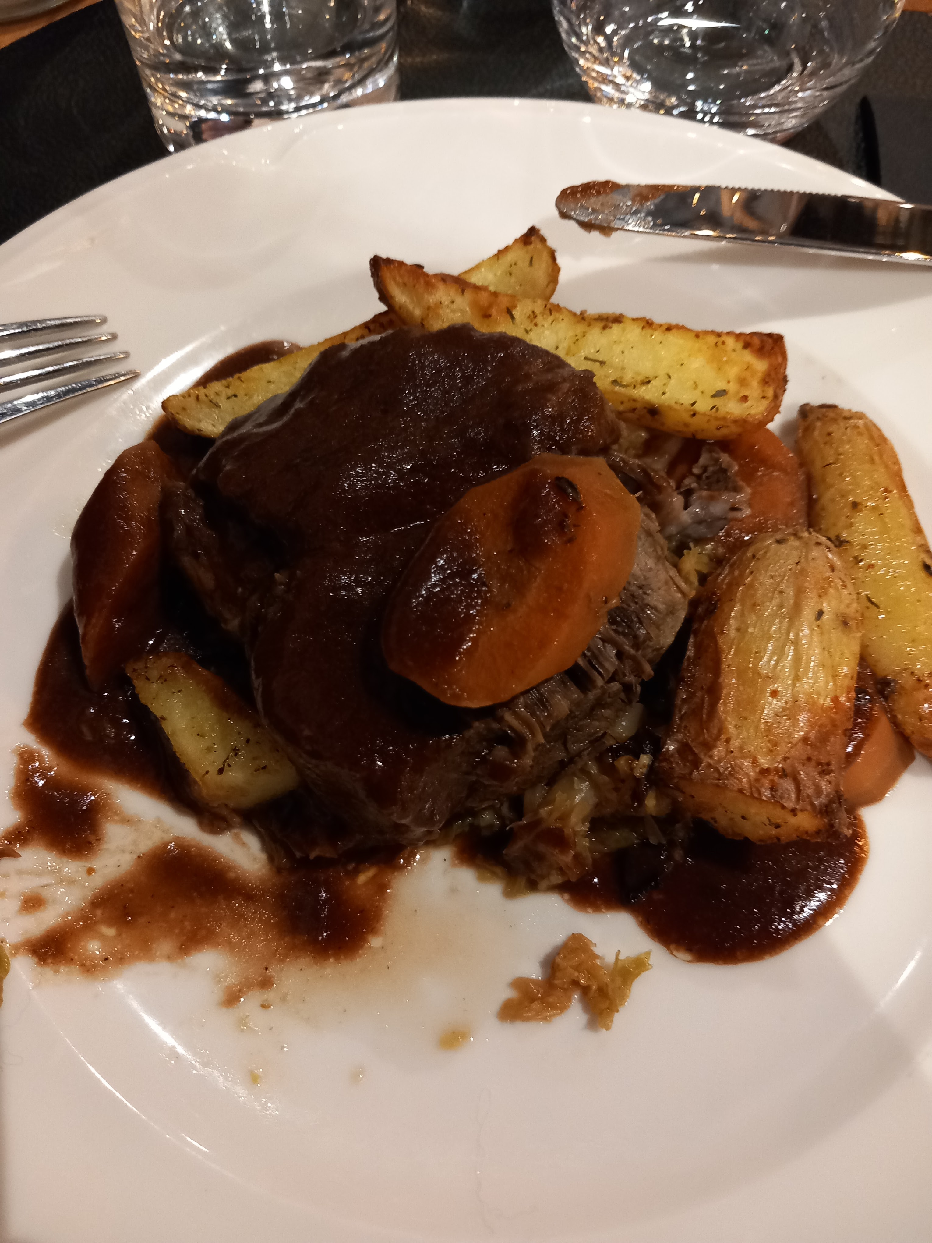 Déçu par la carte, ou comme proposition le choix entre deux menus, pas de plats à la carte. Quelques plats sans prétention, rien de particulier. Épaule d'agneau avec une consistance particulière, hachée, très particulier. Parmi les deux desserts, une crème brûlée, trop brûlée.