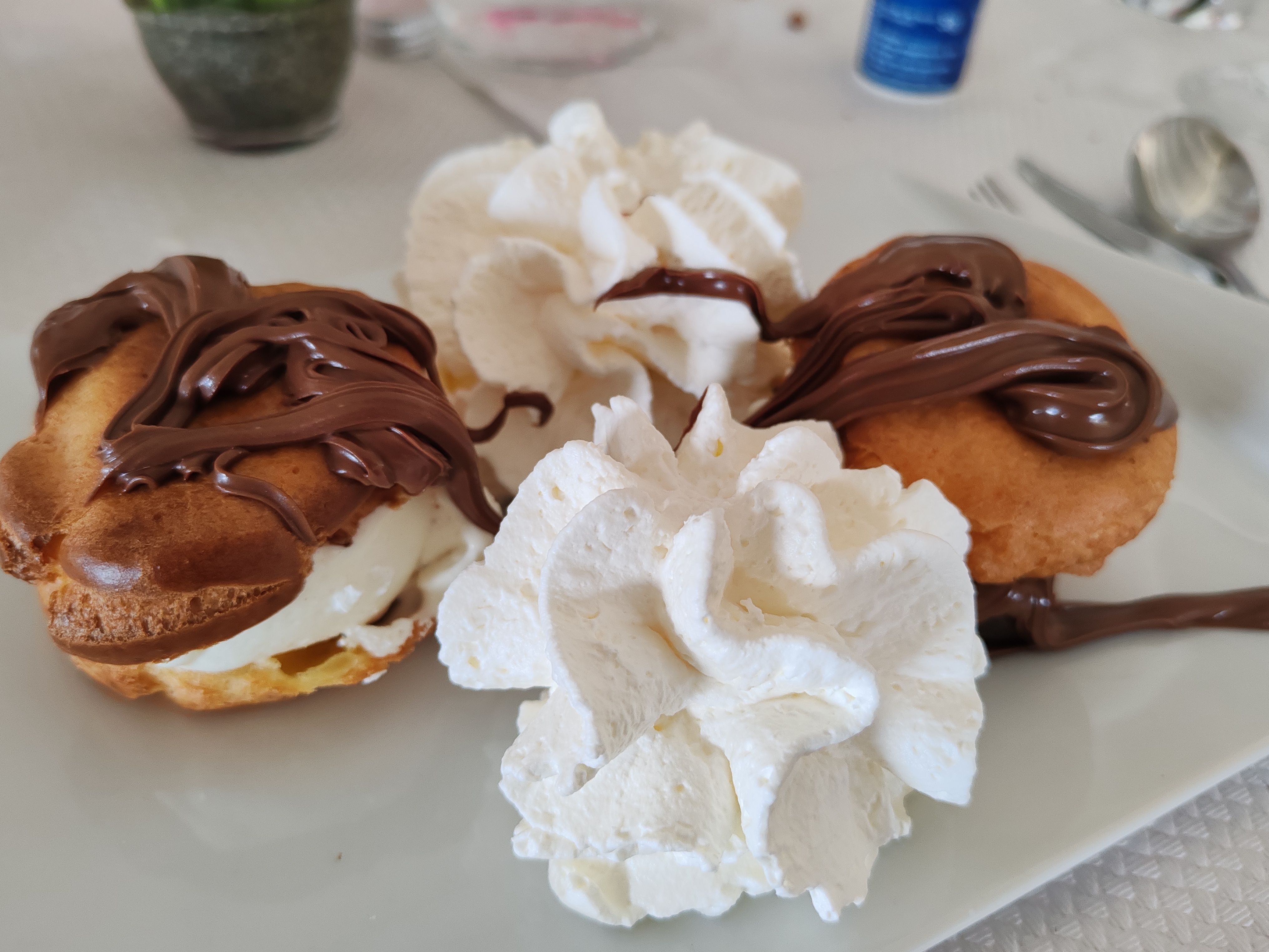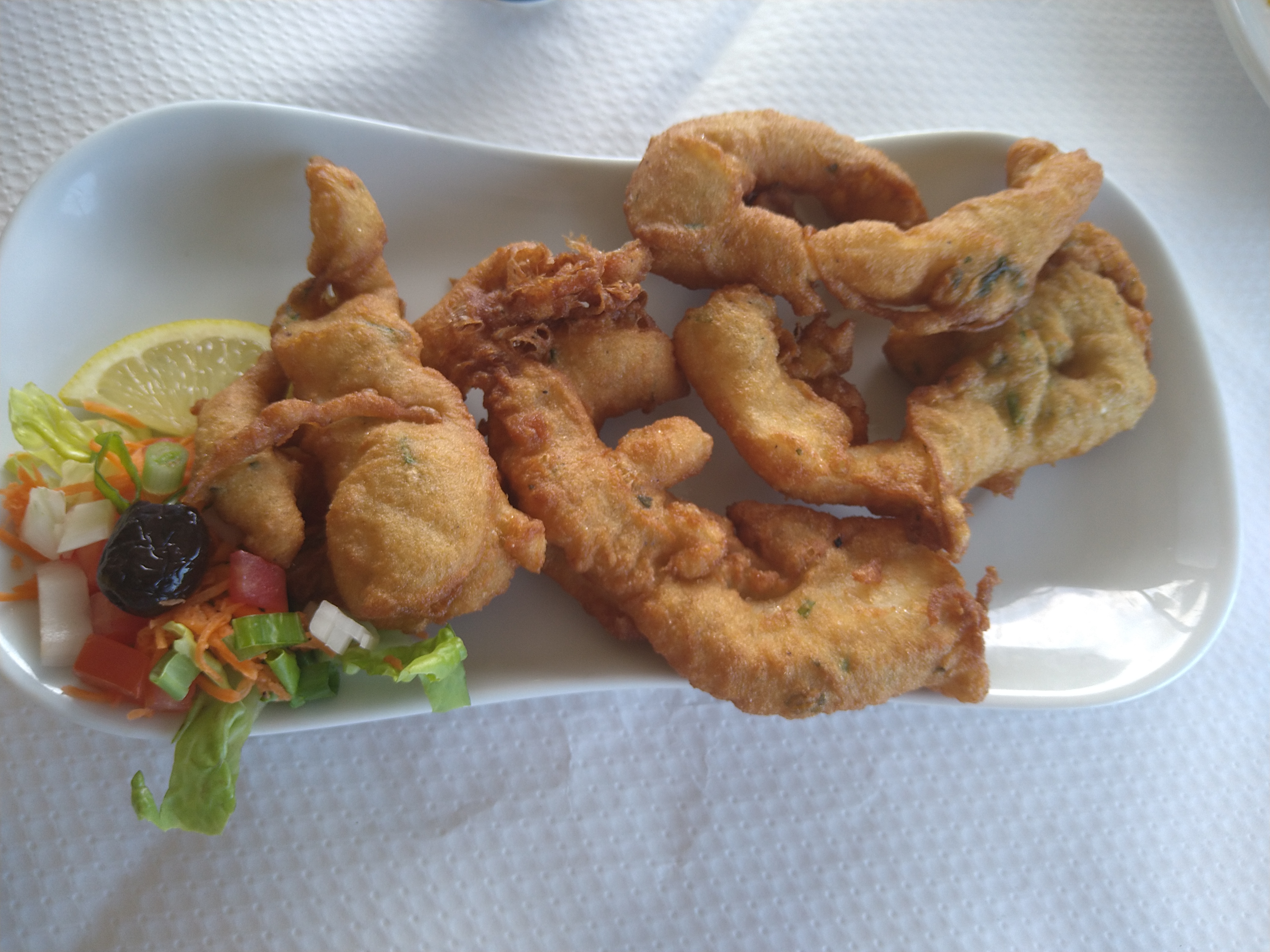 Beignets de calamars: beaucoup plus de pâte à beignets que de calamars et beignets mous. Profiterolles maison très copieux. Ils auraient pu être délicieux si le petit chou n'avait pas été mou.