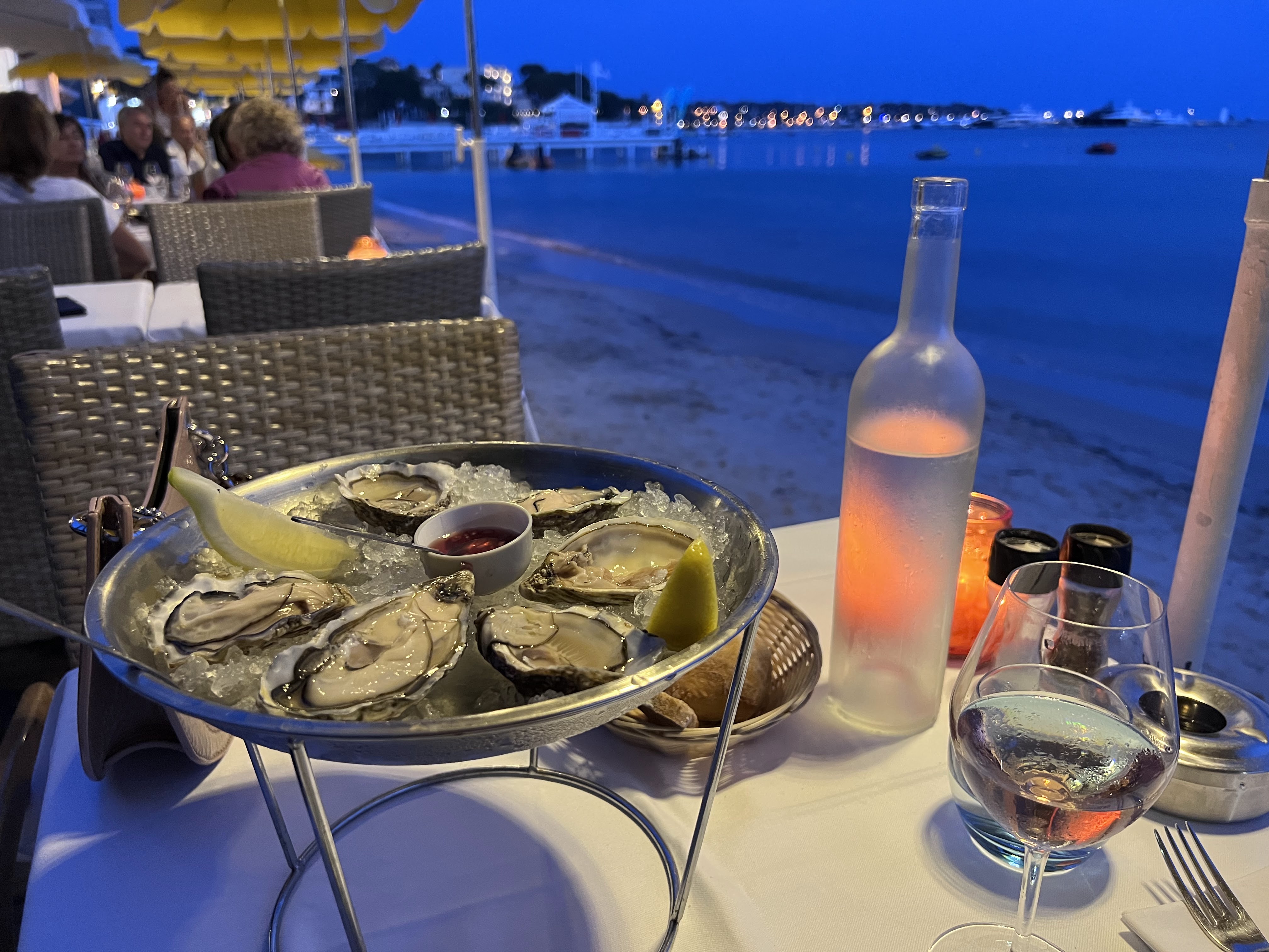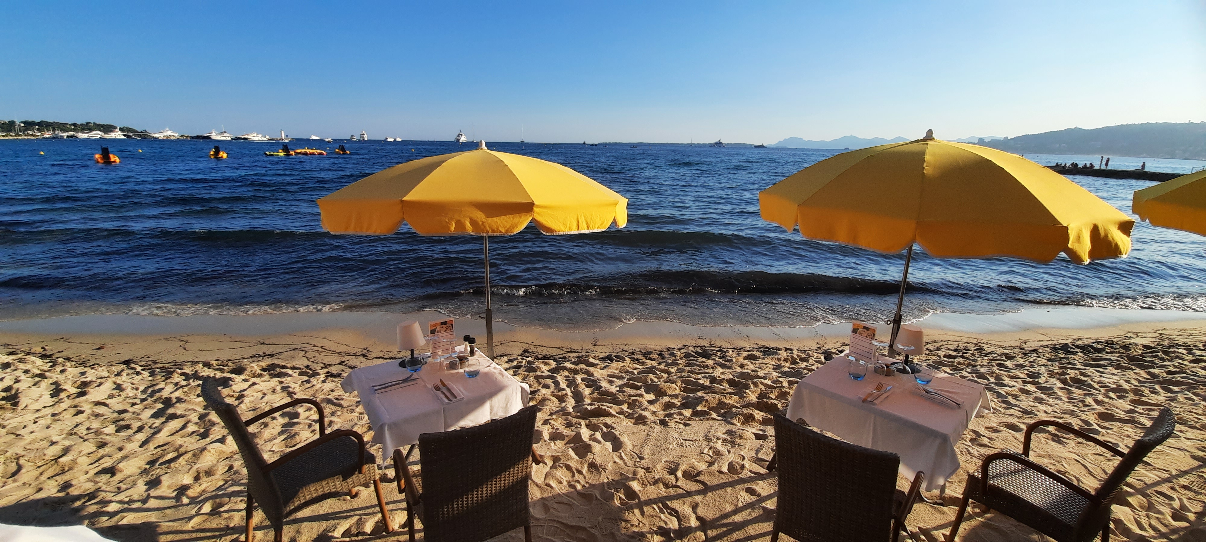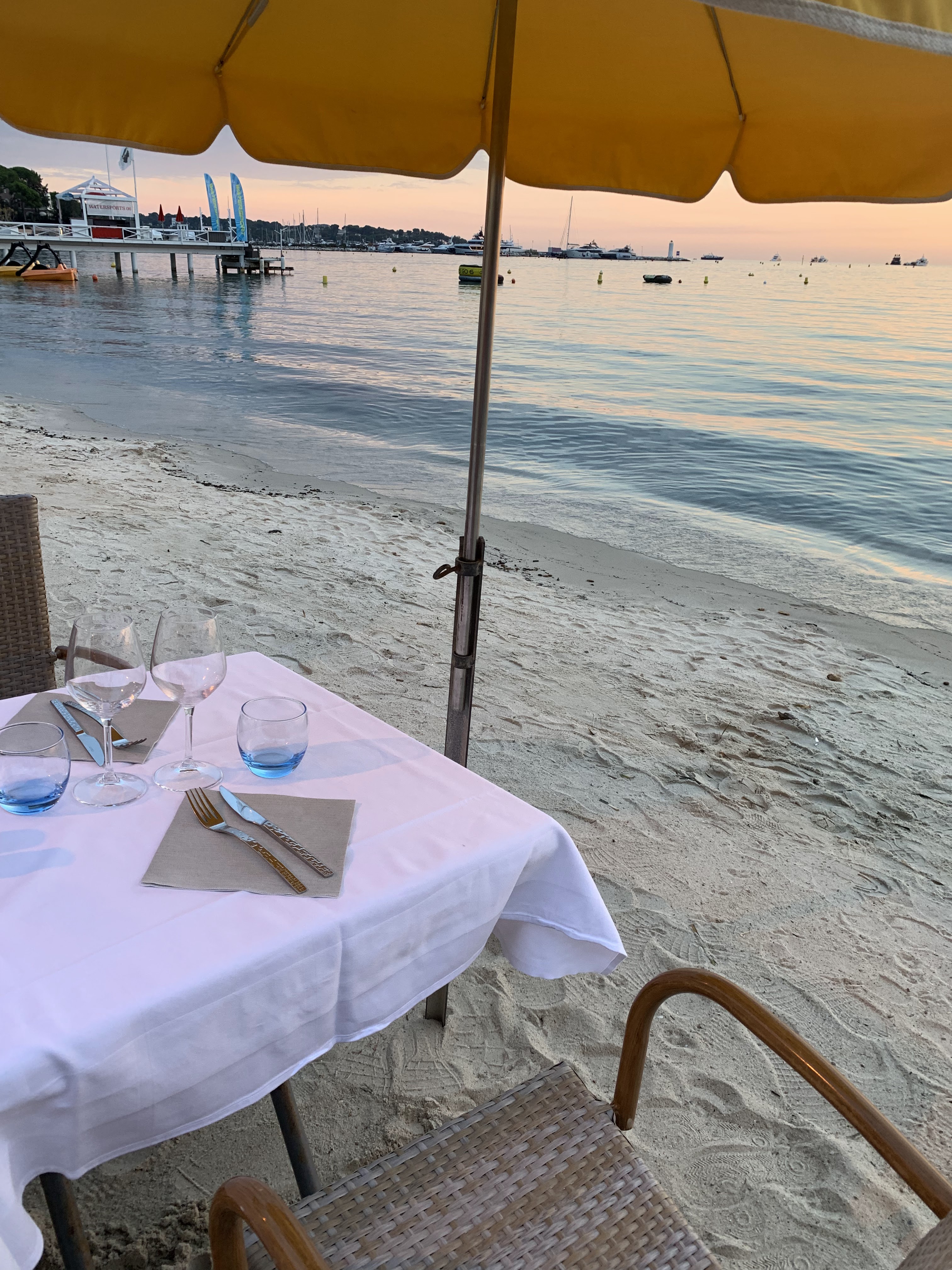 Sur la plage, les pieds dans le sable, nappes blanches, ambiance simple, très bons plats de poissons, service un peu long parfois mais personnel agréable. L'un de nos incontournables à Juan-les-Pins ! A tenter!