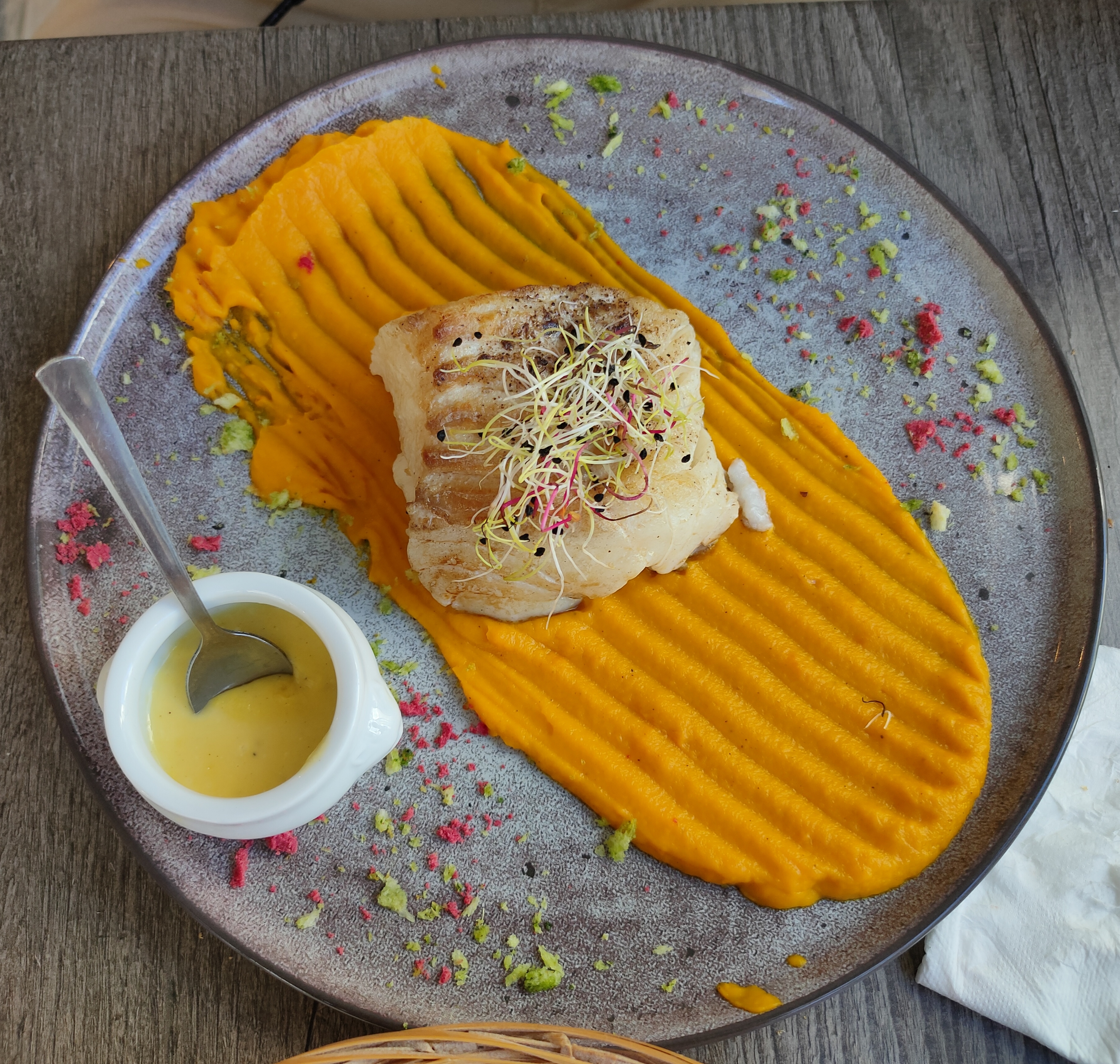 Très bon déjeuner chez yoyo. Nous avons tous les deux pris un filet de merlu sauce poivron et mousseline de patate douce. Excellent. Il y a de l'espace dans le restaurant. Nous n sommes pas les uns sur les autres. Le service est efficace et souriant!
