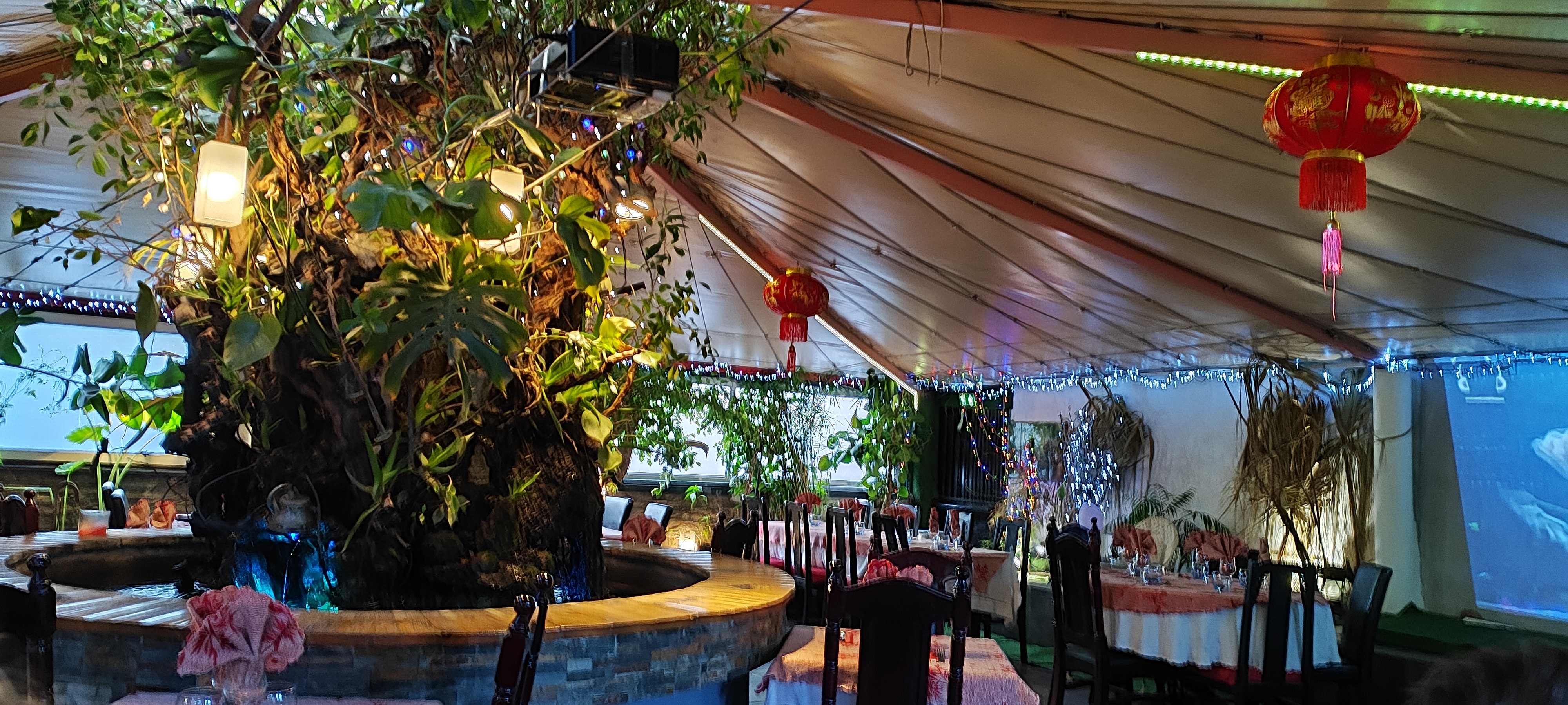 Passez la première salle .Marchez sur un aquarium, et découvrez un voyage en Asie dans un jardin d'hiver, au centre un puits fermé avec des plantes tropicales et de énorme poissons qui nage paisiblement. La cuisine est bonne et le patron atypique 😉 je recommande