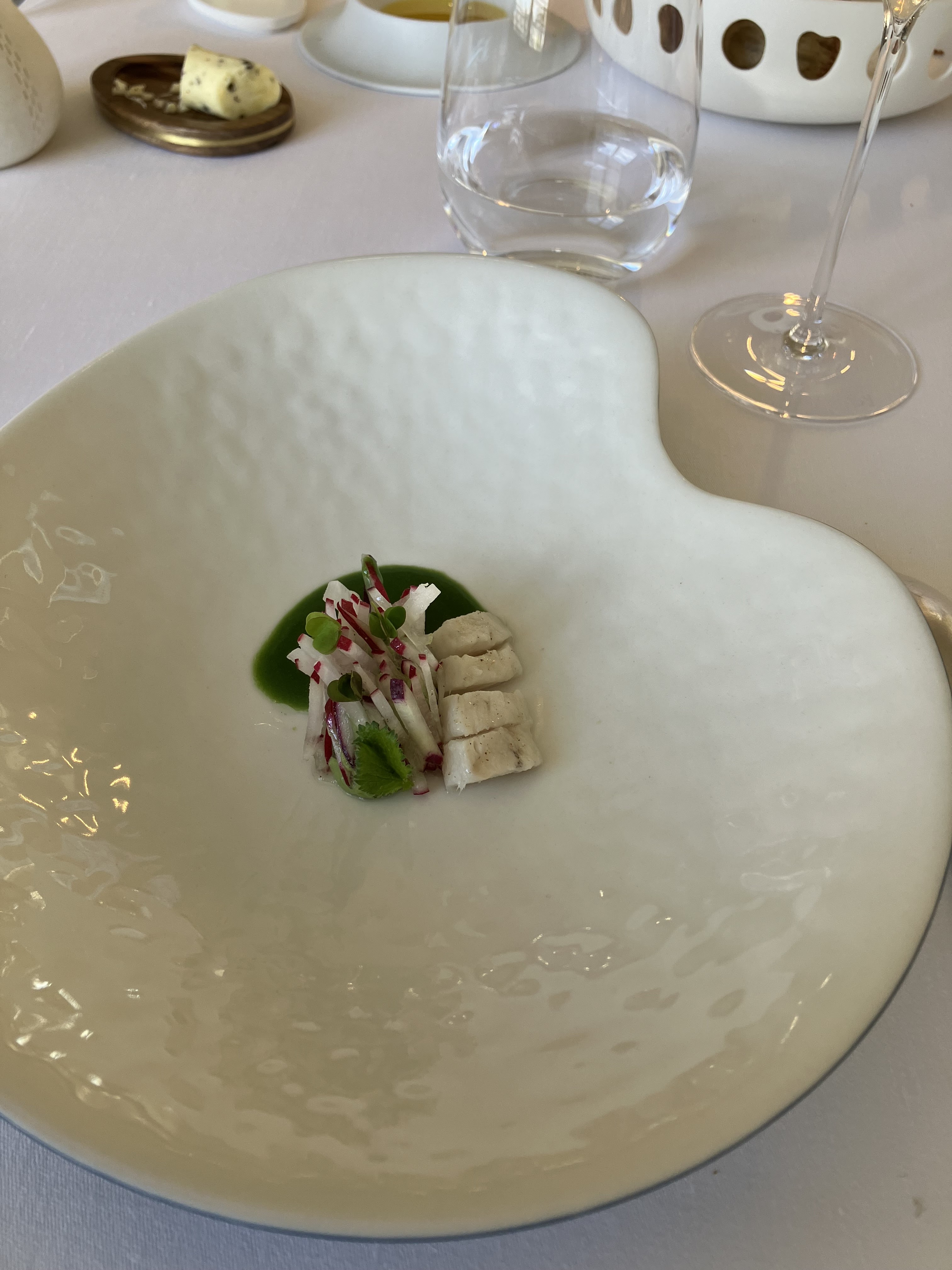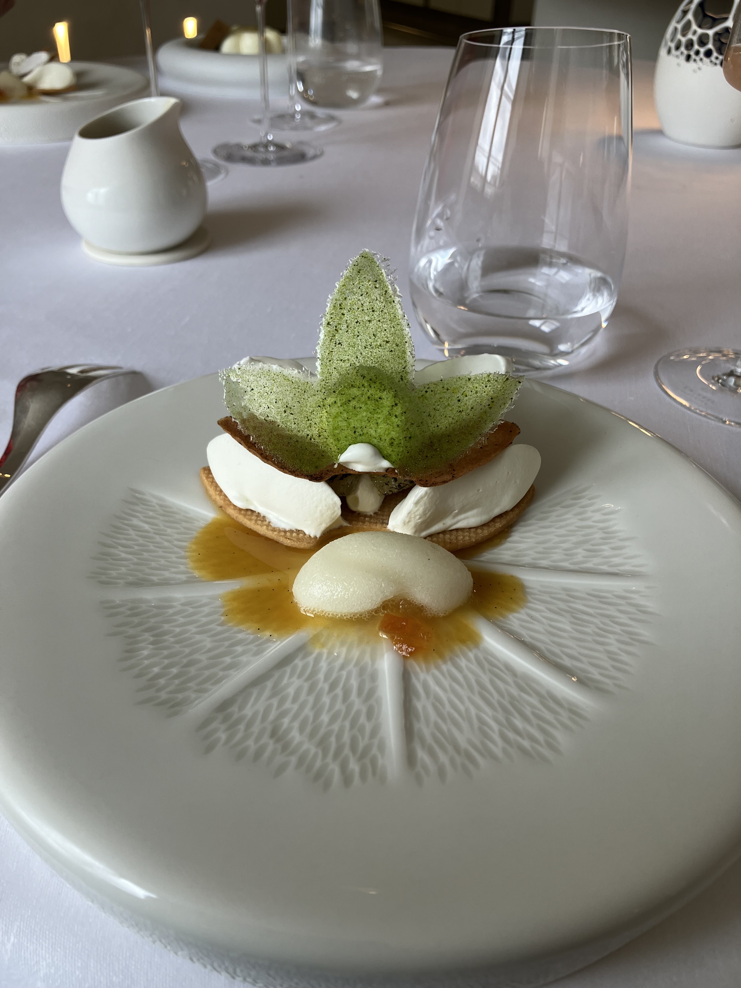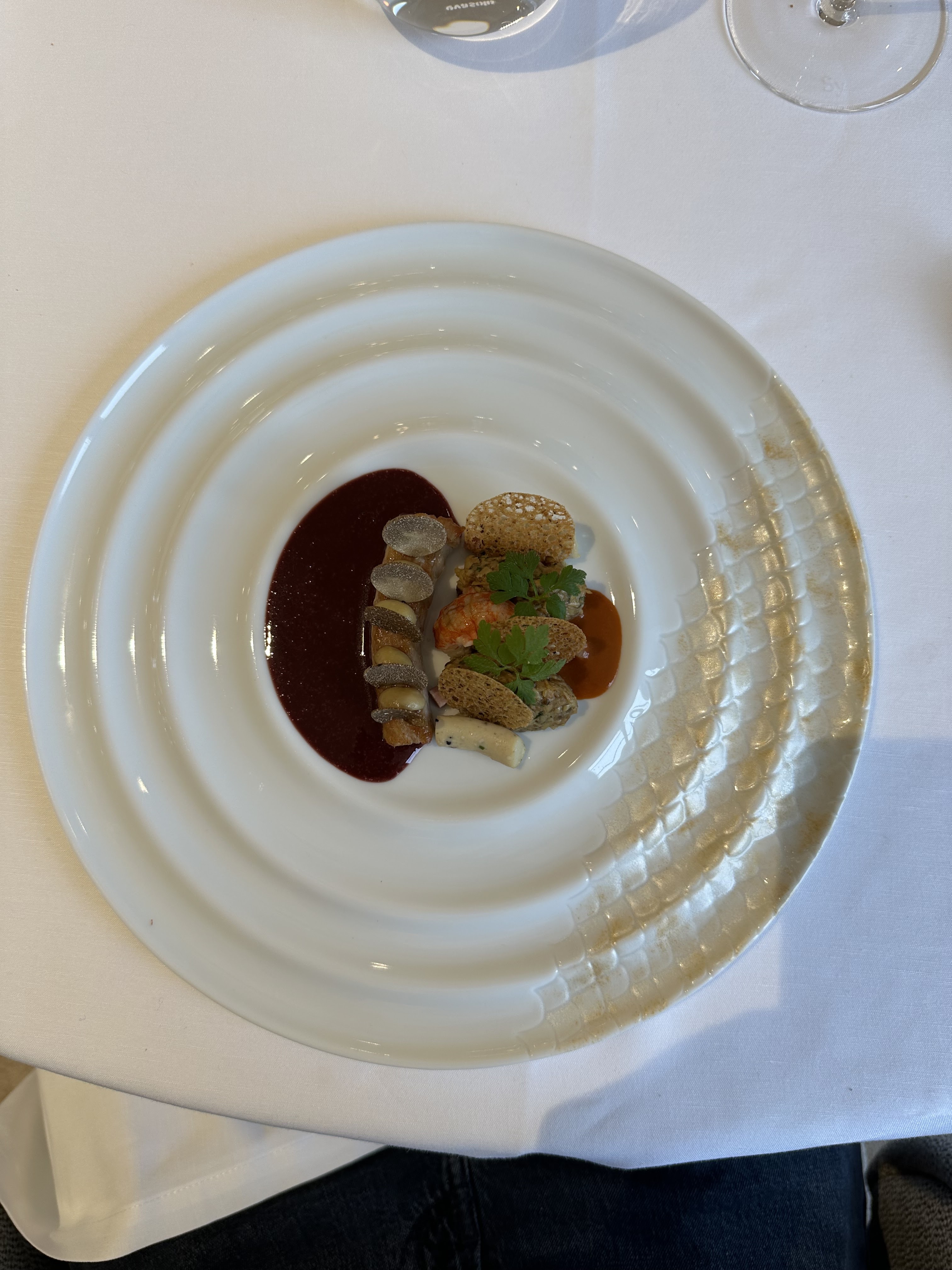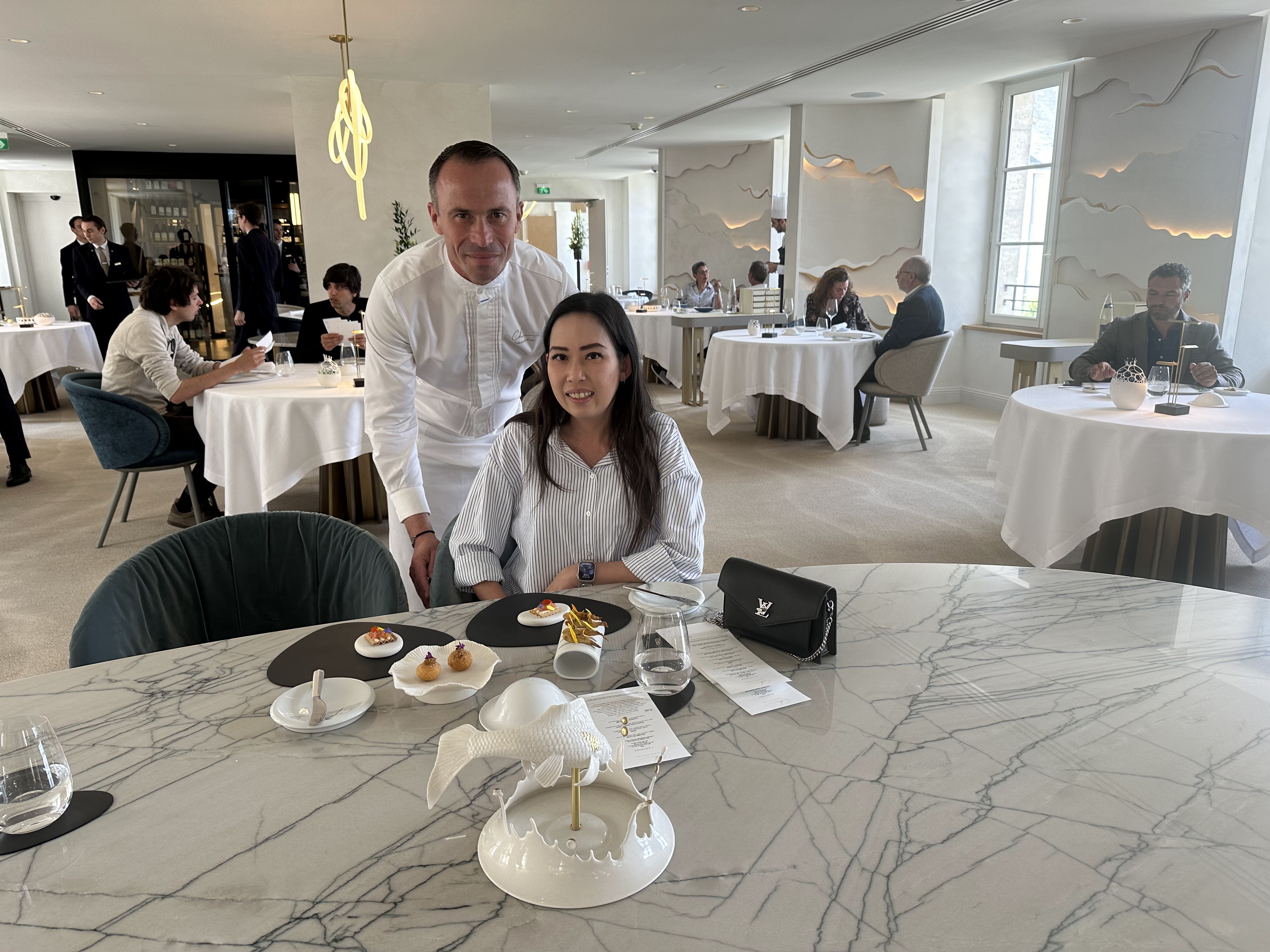 Qu'en dire ? Nous nous faisions une joie d'expérimenter ce 2 étoiles. Nous en ressortons mitigés. Il nous aura fallu attendre 30' avant de pouvoir faite part de notre choix au chef et recevoir un peu de pain et au final, 4 heures pour venir à bout du menu 6 services. Trop long malgré la myriade de serveurs s'occupant de notre table. Rien à dire sur l'association mets vins. Après 3 remarques à deux personnes différentes et une tâche sur mon pantalon, nous aurons l'explication au fait que la nappe et les serviettes étaient humides. Problème de blanchisserie. Chaque plat est extrêmement travaillé et visuellement très beau mais aucun n'explose en bouche au point de pouvoir se dire wow, quelle expérience gustative. Certains éléments sont réellement savoureux mais aucun ne nous laissera un souvenir inoubliable comme cela nous est déjà arrivé dans des restaurants moins prétentieux. En conclusion, pas à la hauteur de l'addition selon nous et surtout, pas à la hauteur de nos attentes et de tout ce que le décorum pouvait laisser présager. Dommage.