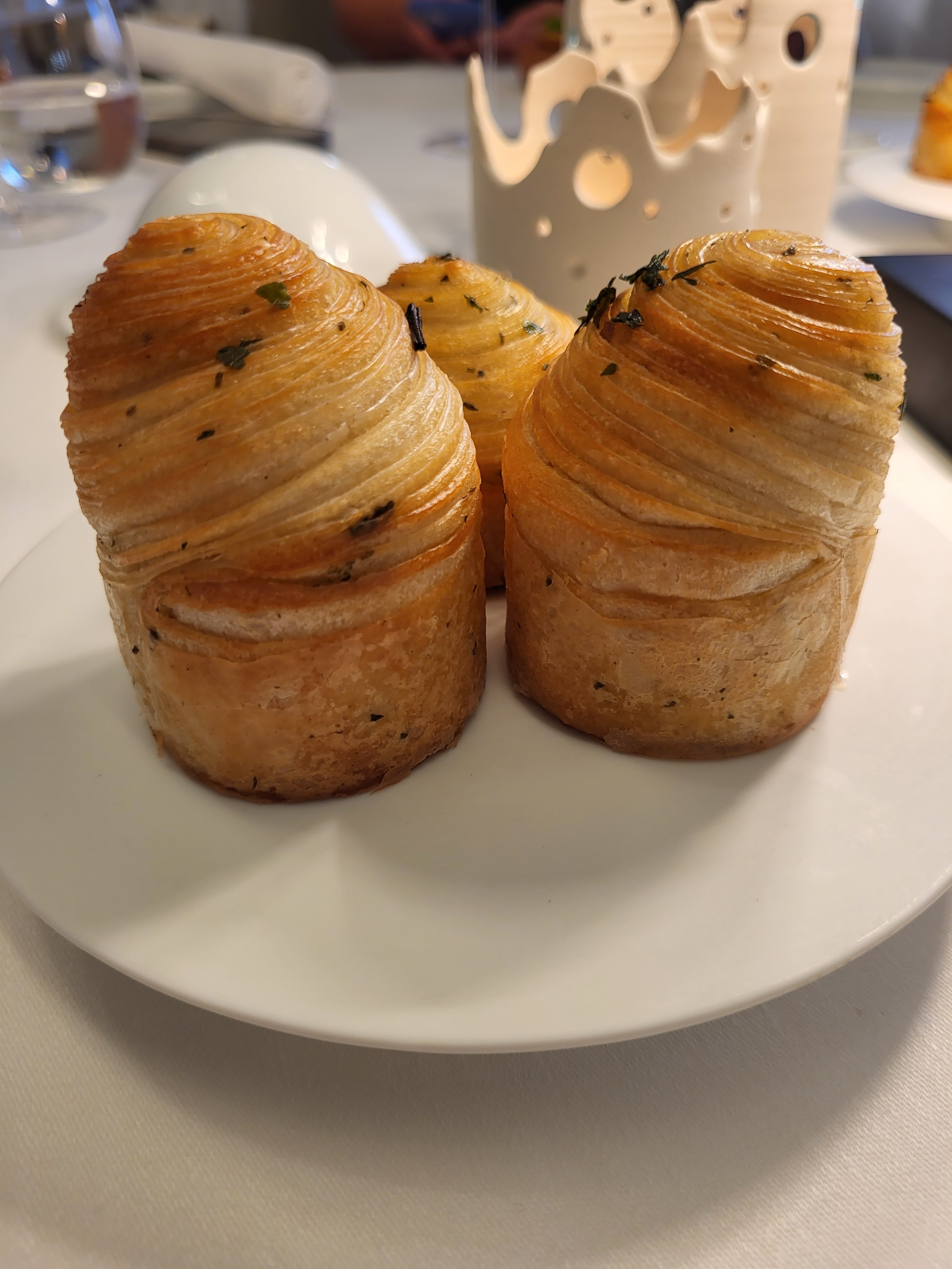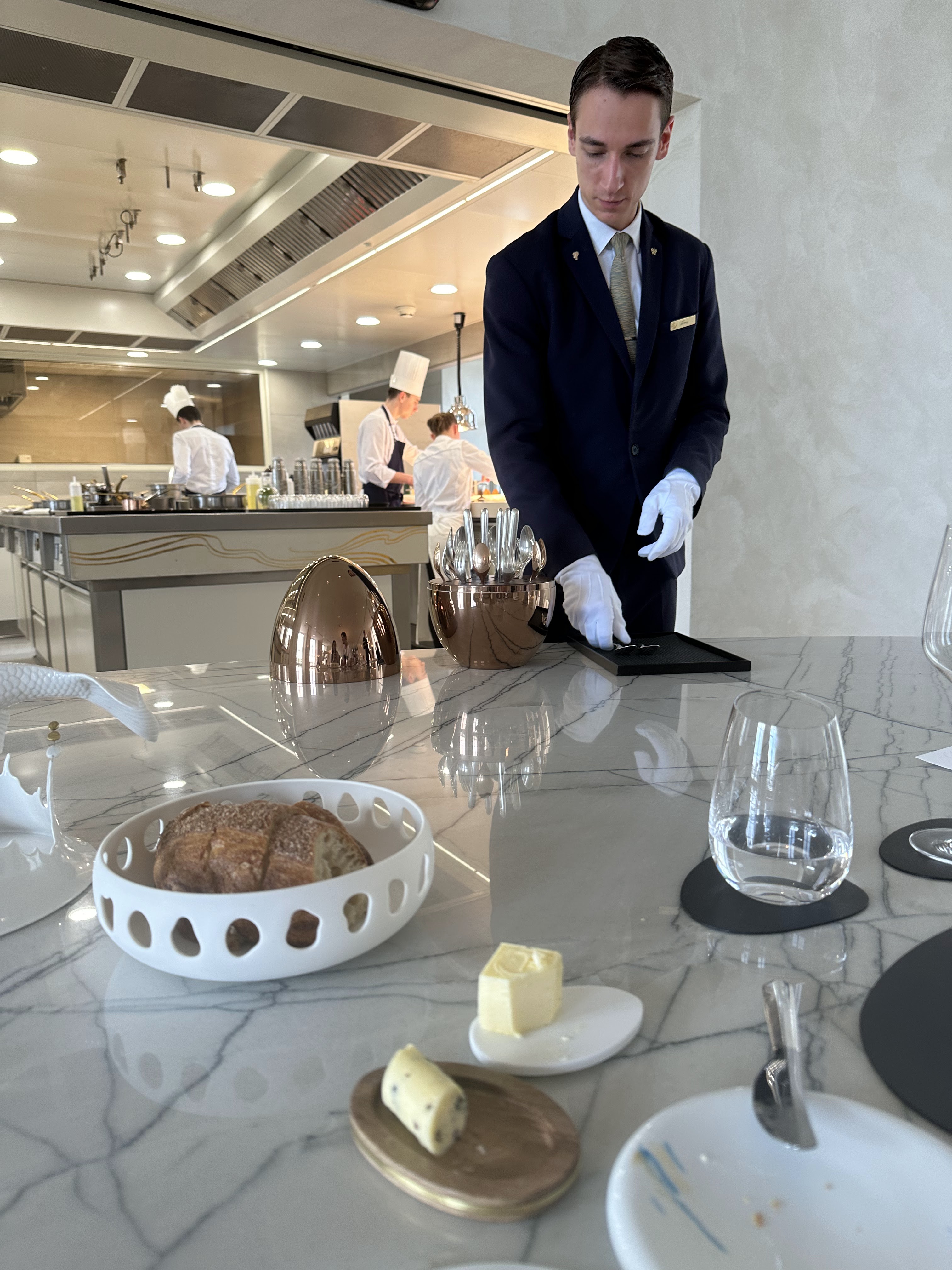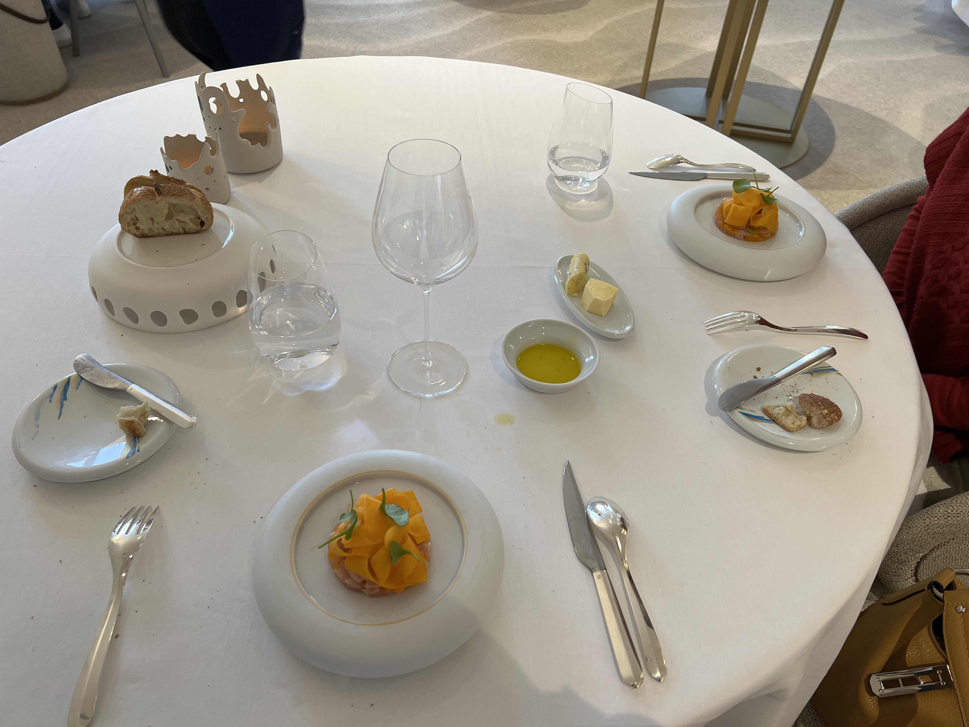 Très bon repas (9services) mais un peu déçu de la fin de repas car le personnel était plus trop présent . Par ailleurs , on n’a pas eu la café moulu devant nous comme les autres on eu , car il fallait libérer la salle pour le service du soir ce qui est compréhensible (je suis serveur donc je comprends) c’est dommage de ne pas avoir eu le même service en bas (café pas très chaud )