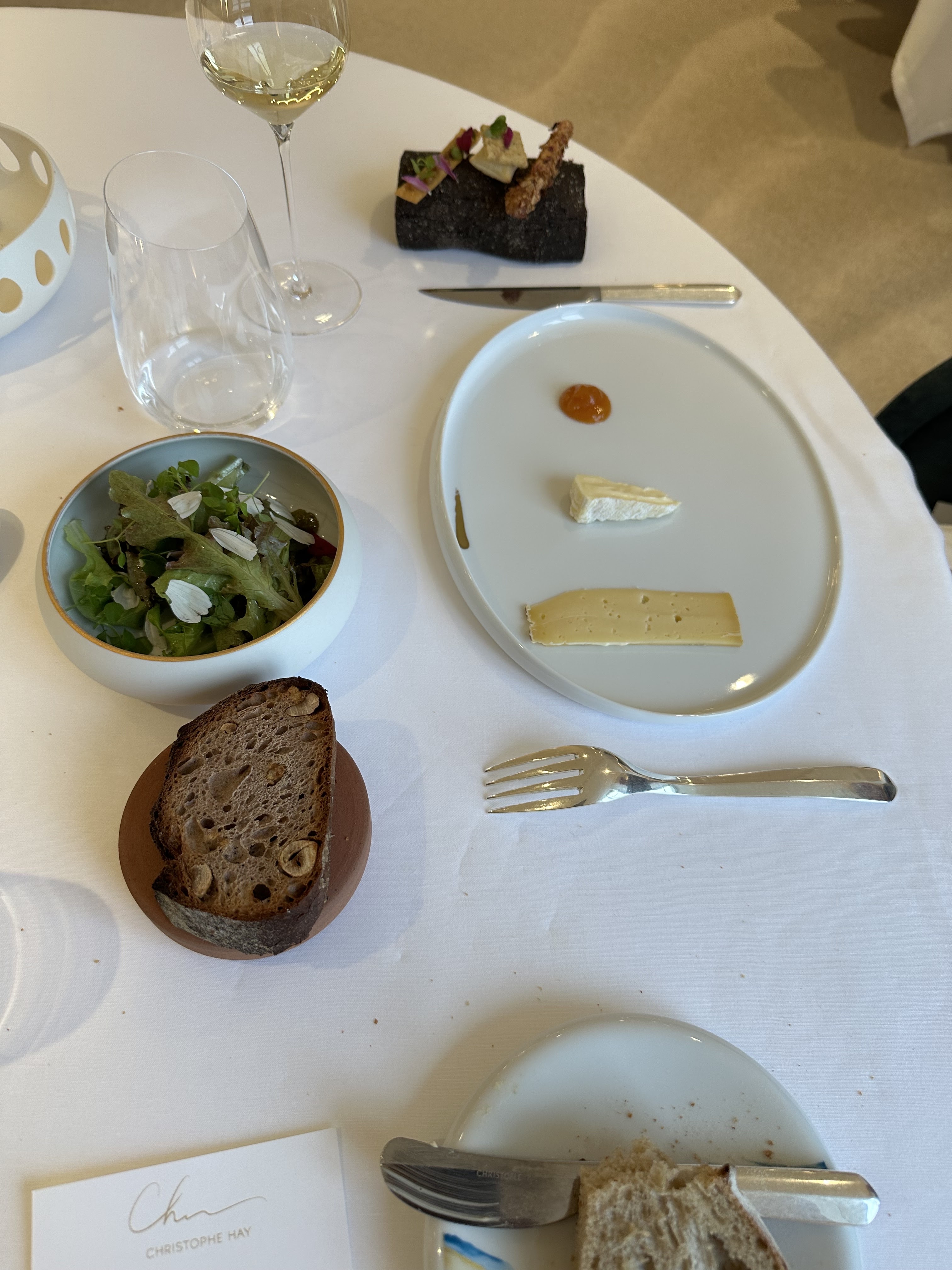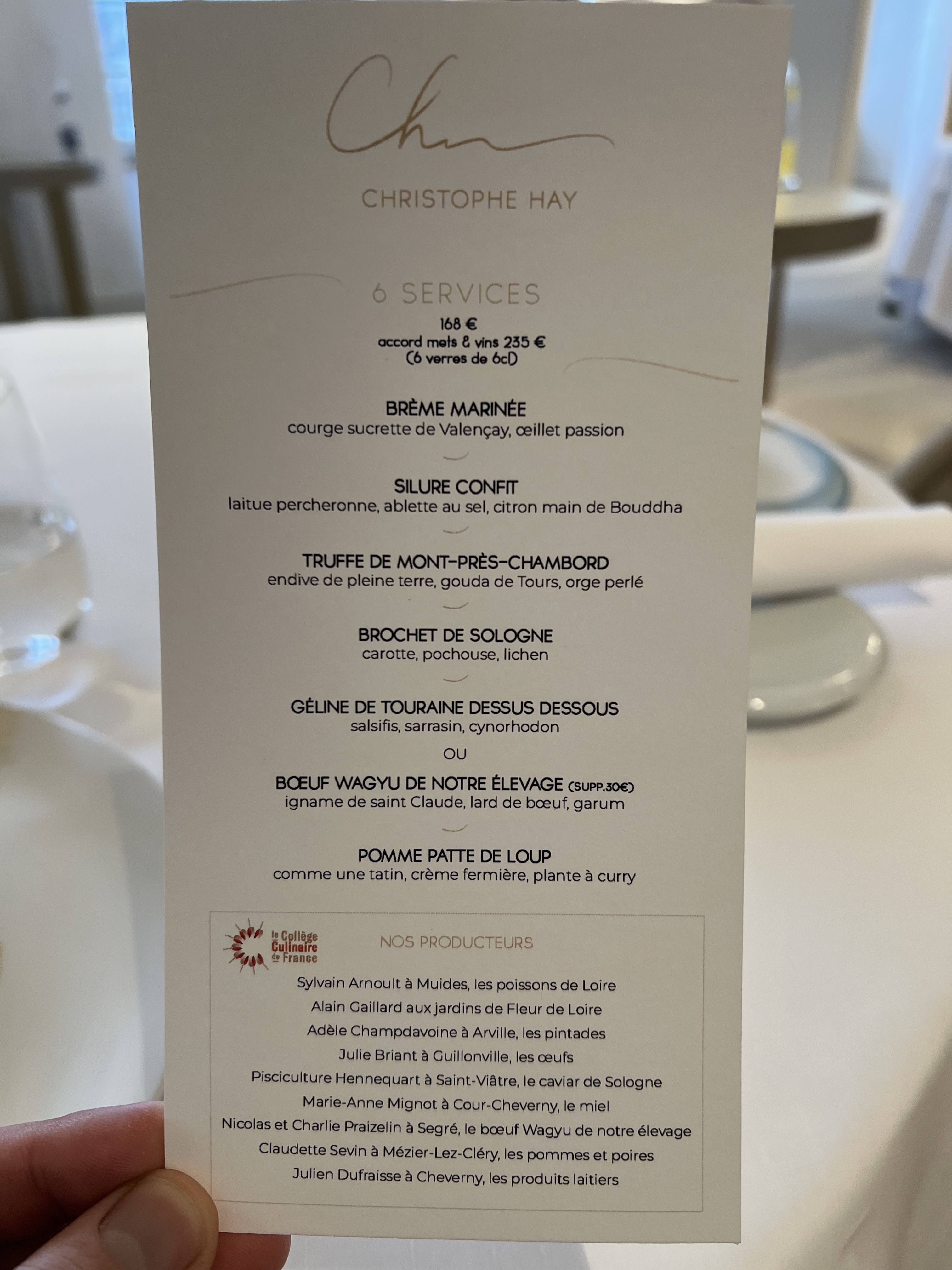 Aout 2023, Nous avons pris le menu 9 temps, avec les vins choisis par le chef pour accompagner notre dîner. L’expérience est tout simplement incroyable du début à la fin, des amuses bouches aux gourmandises finales, en passant par le choix des vins, le pain avec le beurre de caviar est déroutant. Les touches et petits détails subtils du Mexique sont innovant, tout en s’intégrant dans la cuisine traditionnelle Française, chapeau bas. Tout est absolument parfait, le service est original, les différents chefs qui apportent tout à tour leurs merveilleuses œuvres d’arts, dans un ballet parfaitement organisé par le maître de cérémonie, Christophe Hay, la carpe « à la Chambord » sort du système solaire, on ne parle plus en étoile… Pas une mauvaise note, comme tout bon Français, j’ai essayé de trouver une faille, un raté, rien du tout, j’en suis presque déçu… rien à redire. Nous sommes arrivés à 20h, sortie à 00h45 avec une dernière infusion faite avec les herbes du jardin, c’est un spectacle, le temps est passé tellement vite que nous étions les derniers dans la salle. Nous avons eu la chance de goûter plusieurs restaurants 3 étoiles Michelin, Christophe Hay est sur la route du Graal, où s’arrêtera t’il?