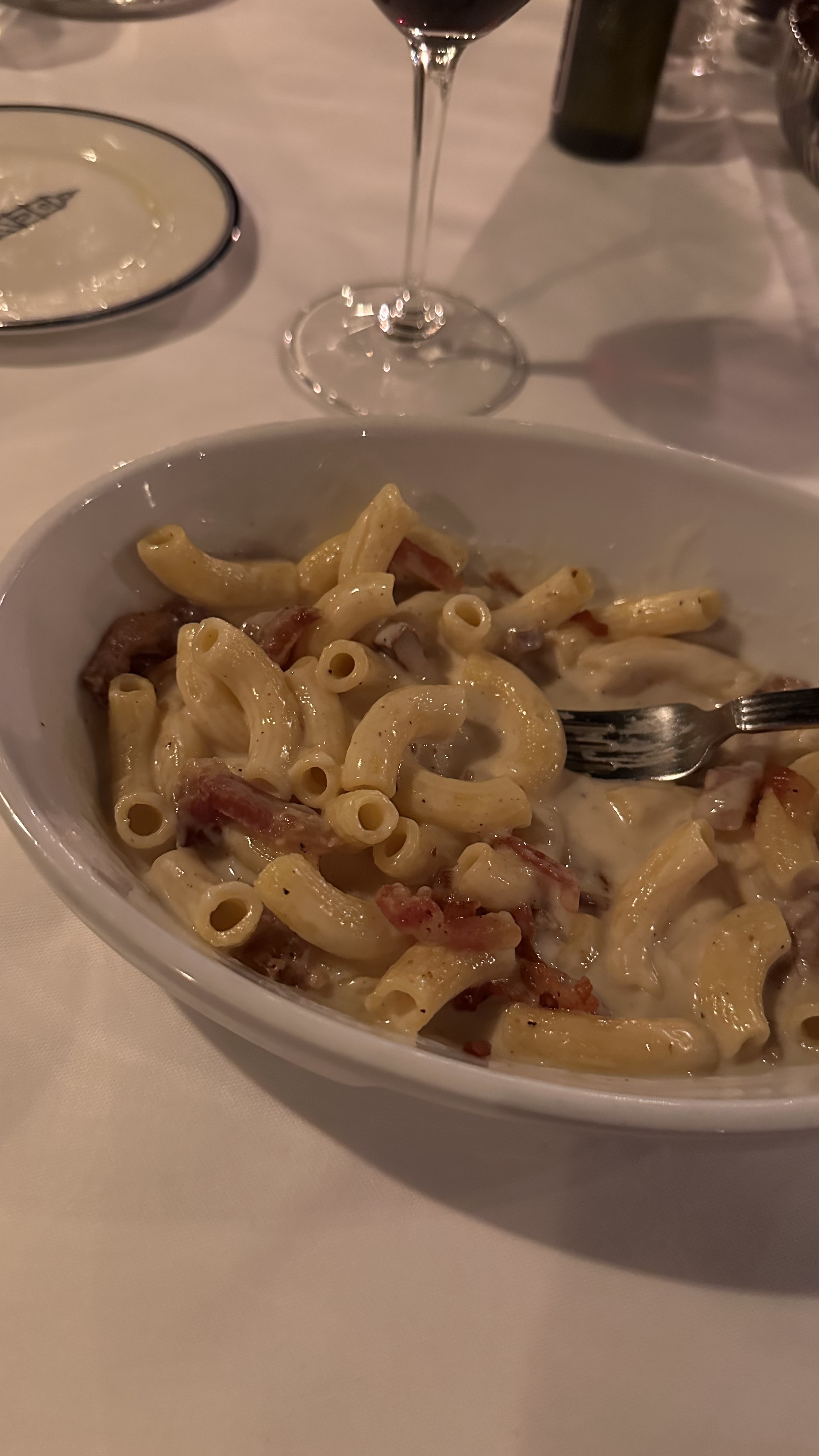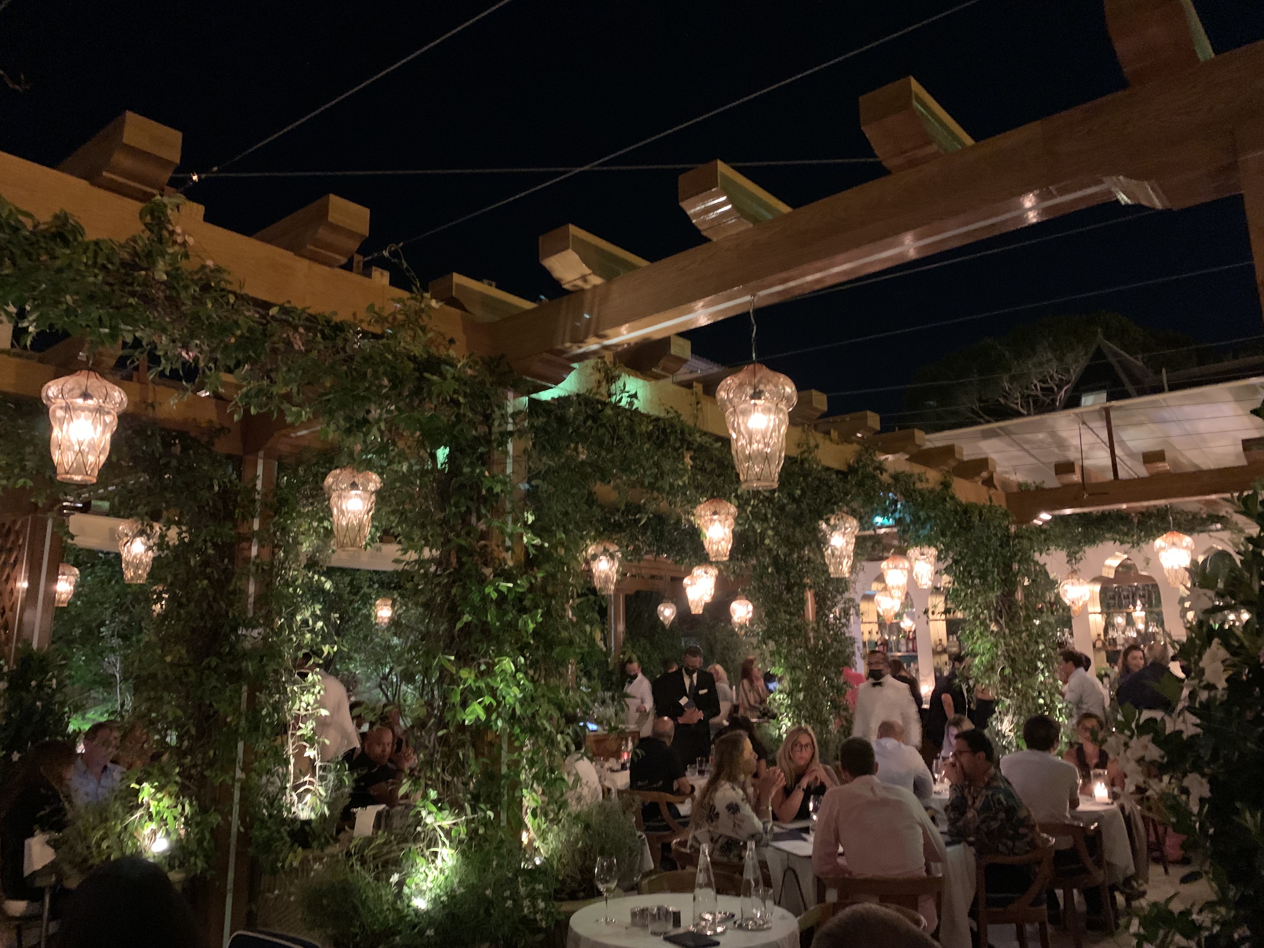 Découvert par surprise! Le nom nous a interpellé car nous aimons celui de Venise ou avant de NY . Personnel très accueillant . Nous explique que les plats sont copieux ( comme à Venise ) ils ne nous bousculent pas pour choisir un plat . Nos spaghettis étaient délicieux même si il manquait un peu de poivre . Comme nous avons eu une table qu’à 22:00 nous n avions pas très faim mais avons pris un dessert . Le seul faux pas pour nous c est le manque de tenue et la familiarité de certain membres du personnel avec un client certes riche mais dérangeant. Nous avons cependant aimé . Le cadre est magnifique et le soir avec les lampes dans le jardin c est très beau .