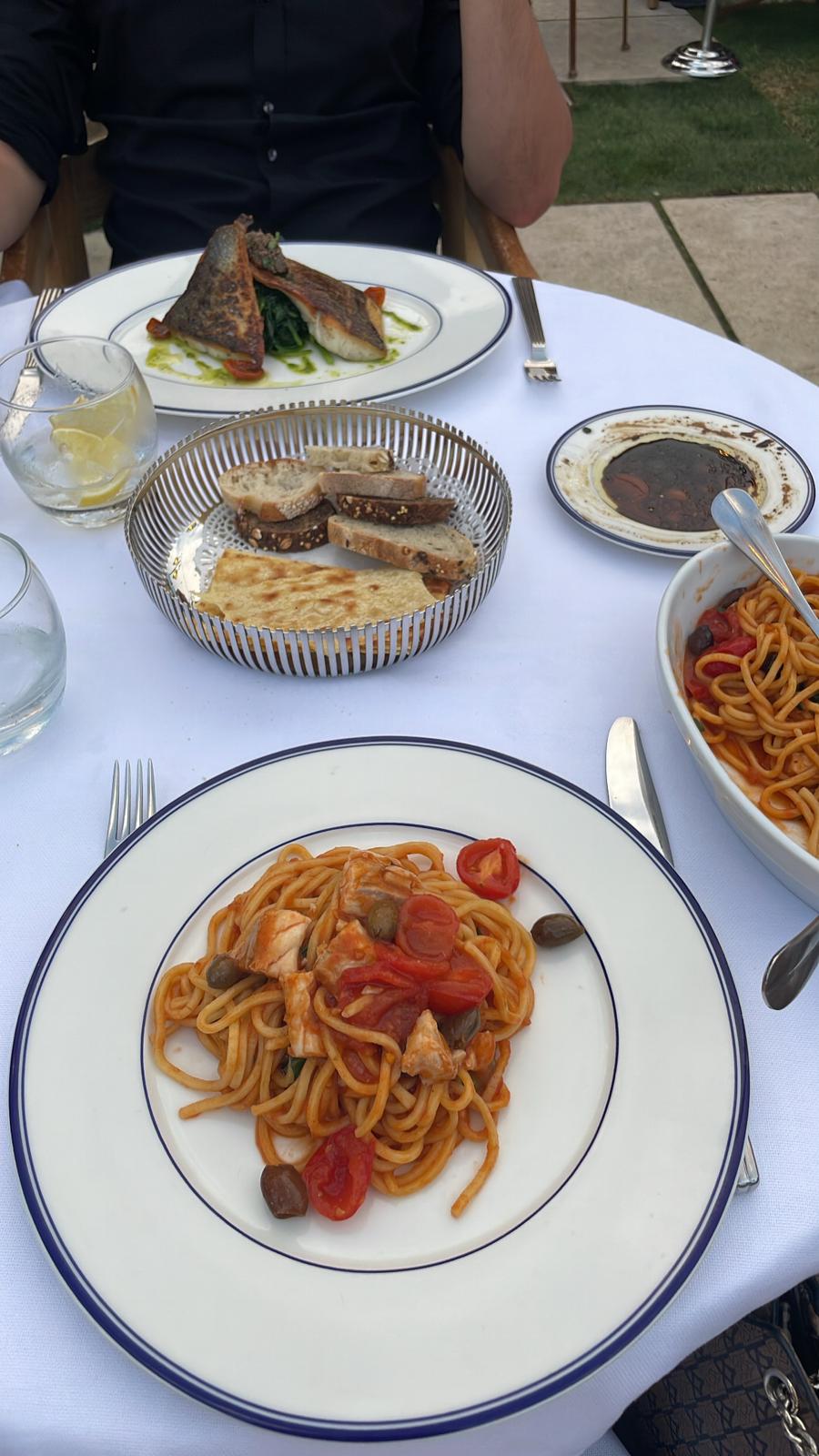 Je suis allé chez Cipriani sur invitation de la boutique Miu Miu de St-Tropez. Nous avions commandé la majeure partie du menu à partager, nous avons donc eu l'occasion d'essayer de nombreux plats différents. Je suis allé plusieurs fois au Cipriani à Monaco et la nourriture dans la rue Tropez est bien meilleure à mon avis, ainsi que l'ambiance. Parmi les entrées que nous avons essayées, la seule que je n'ai pas aimée était le tartare de thon (le poisson était bon mais il n'y avait pas de sauce et dans l'ensemble il manquait quelque chose. Le vitello tonnato était incroyable ! Et toutes les pâtes étaient délicieuses, nous J'ai essayé les tomates et le bar (parfait al dente), les gnocchis aux tomates et mon préféré les raviolis à la ricotta et aux épinards (la sauce au beurre était parfaite). Quant aux desserts, le fameux merengue à la vanille (le morceau géant) était identique à celui de Monaco, le tiramisu était un des meilleurs que j'ai jamais goûté (proportions crème/café/biscuit parfaites). L'ambiance est charmante et assez romantique ! Lumières tamisées, bonne musique (pas live), toit ouvert. Le service était correct, rien à redire ici (par rapport aux autres restaurants de SoF). Dans l'ensemble, nous avons eu une excellente expérience et nous reviendrons !