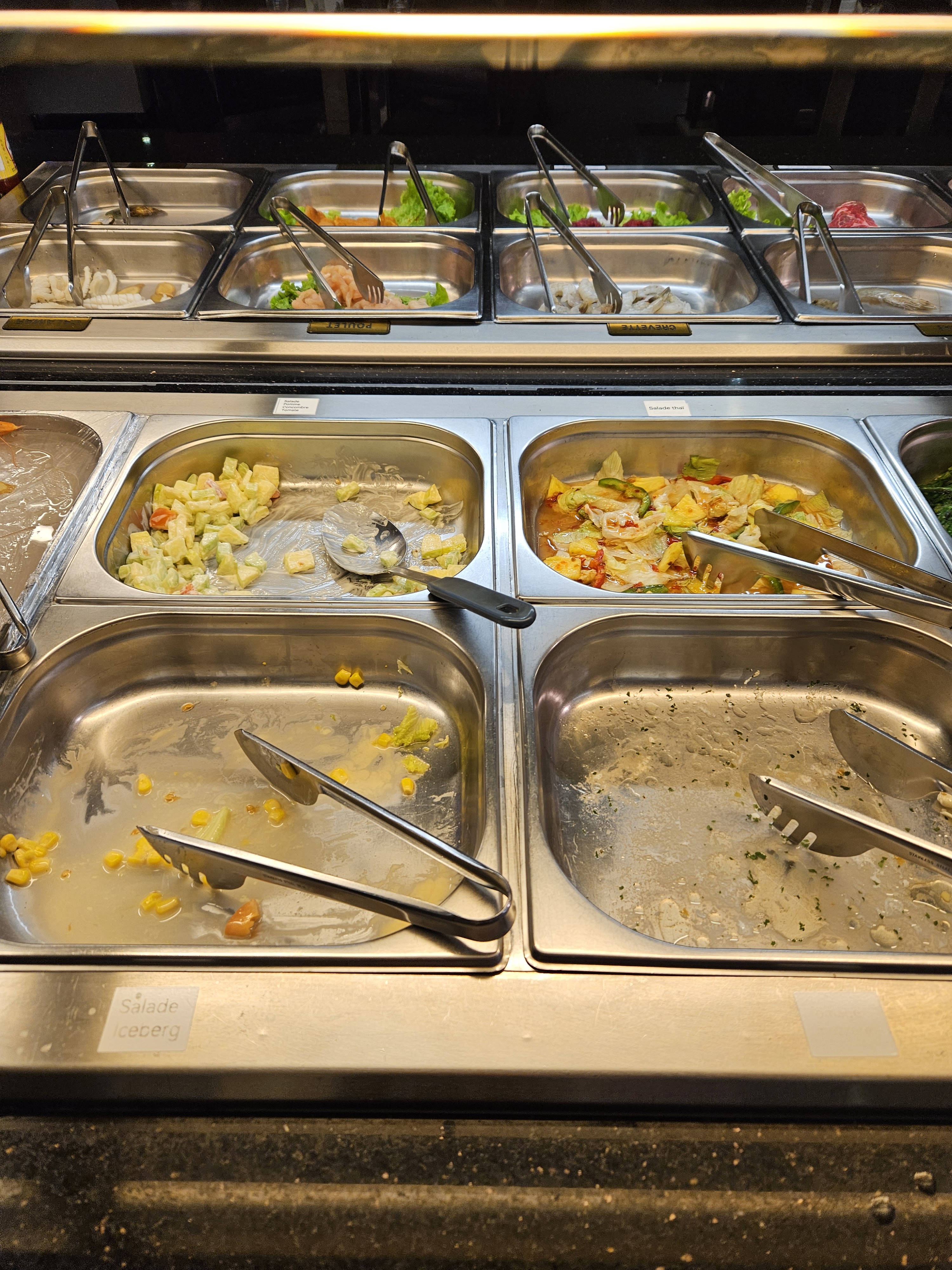 Large choix d aliments. J ai regretté que les plats n etaient pas assez chauds. C est dommage qu on mange presque froid.