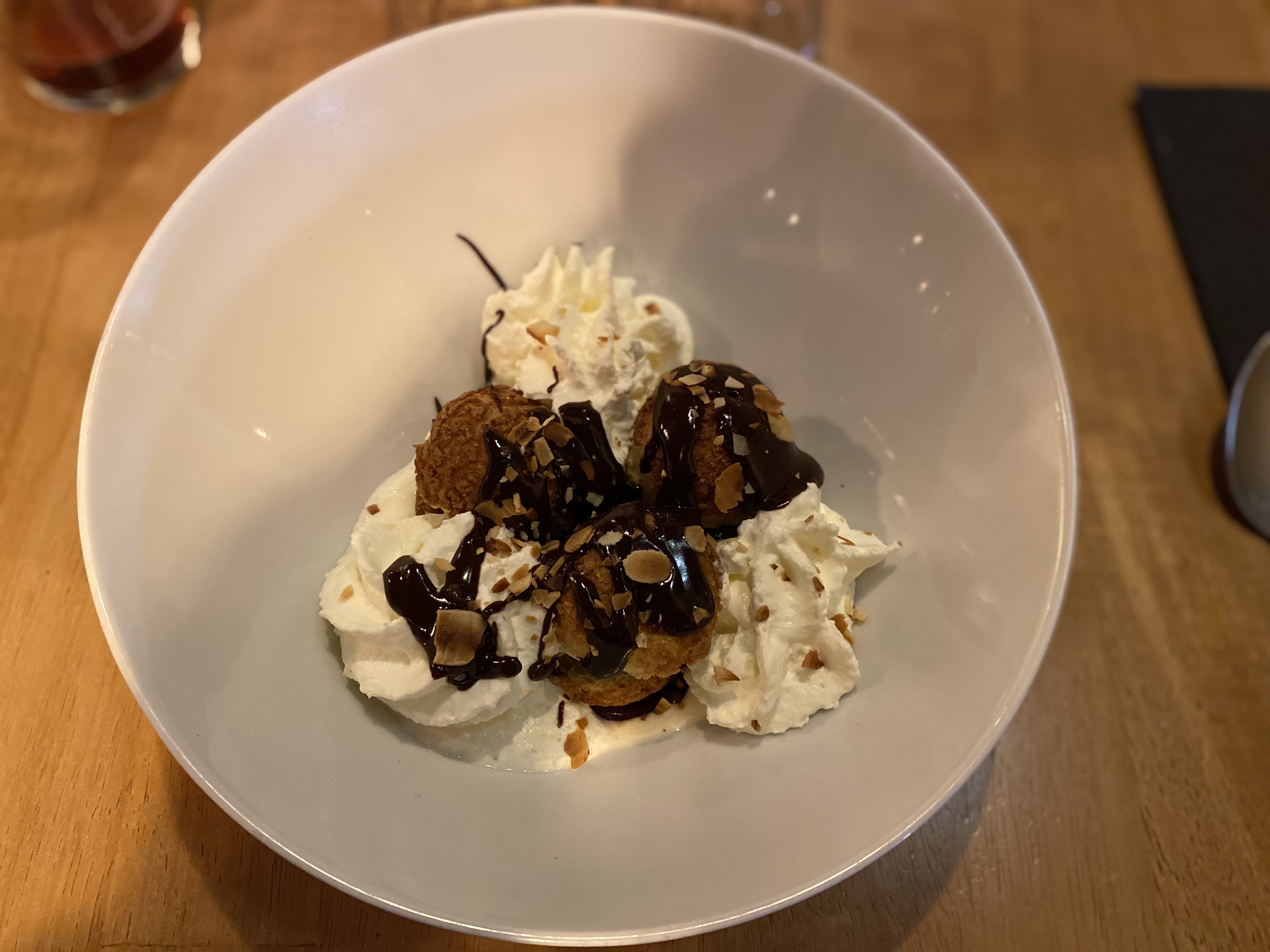 Cadre et accueil sympa. Stationnement super difficile à trouver. Service impeccable. Les pains étaient dur ( La crème brûlée hyper froide Les profiteroles pas top et pas du jour. Personnellement c’est moyen. « L’essayer c’est pas forcément l’adopter »