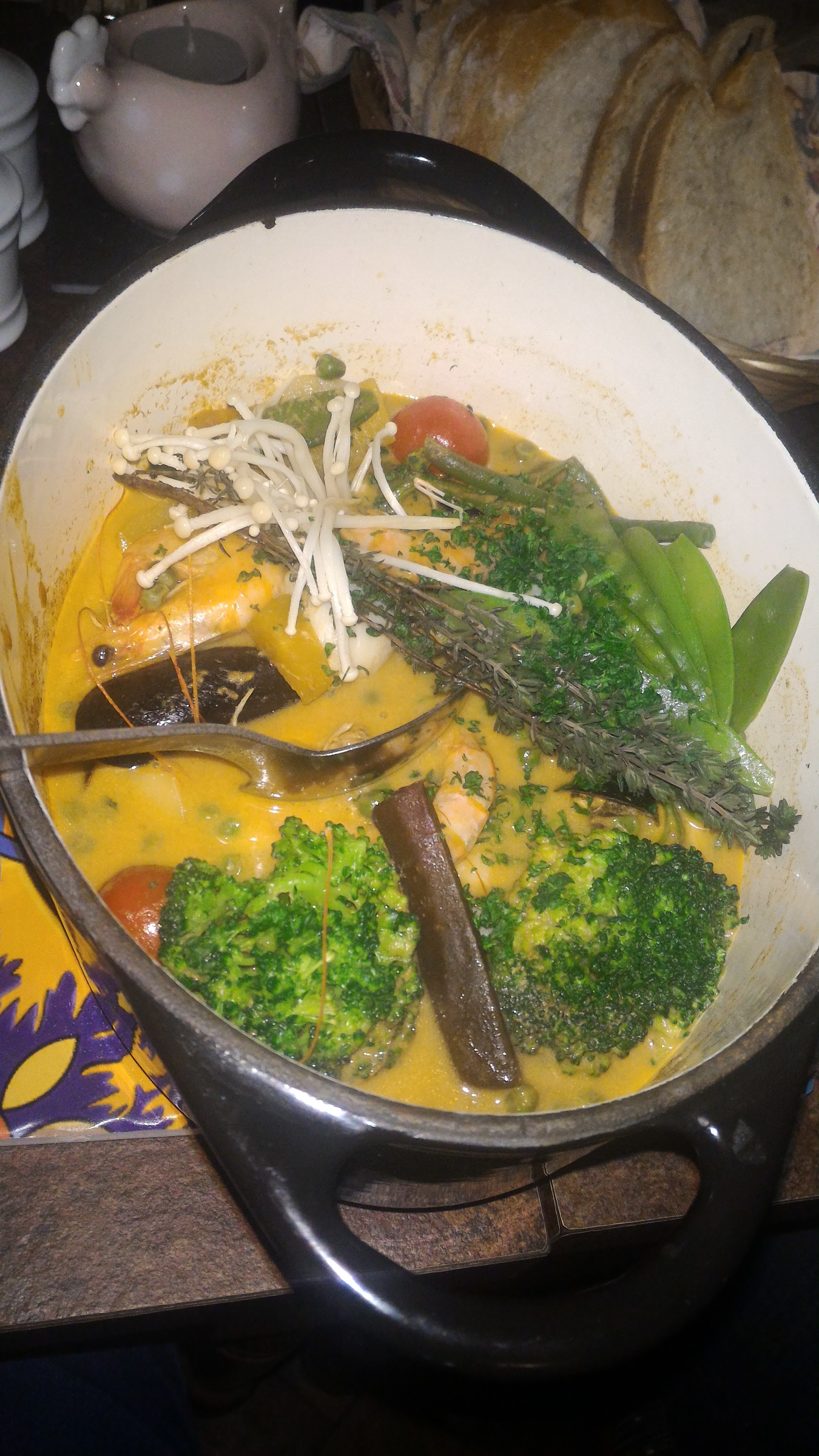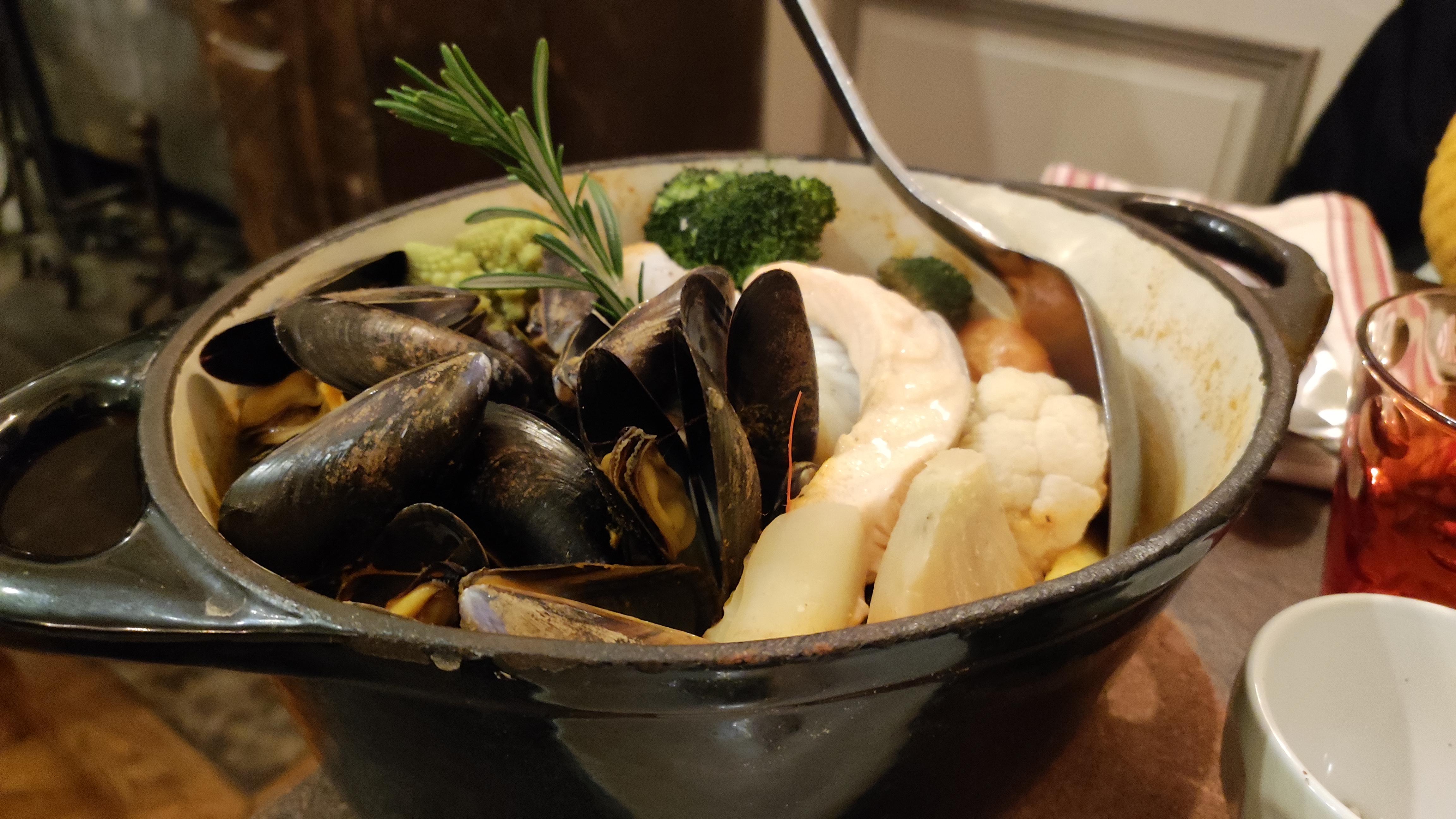 Un dîner avec des marmites excellentes et équilibrées (beaucoup de légumes et des proportions copieuses de viande et de poisson), des serveurs aux petits soins, le tout dans une ambiance tamisée et chaleureuse. Un bon moment de partage, je conseille !