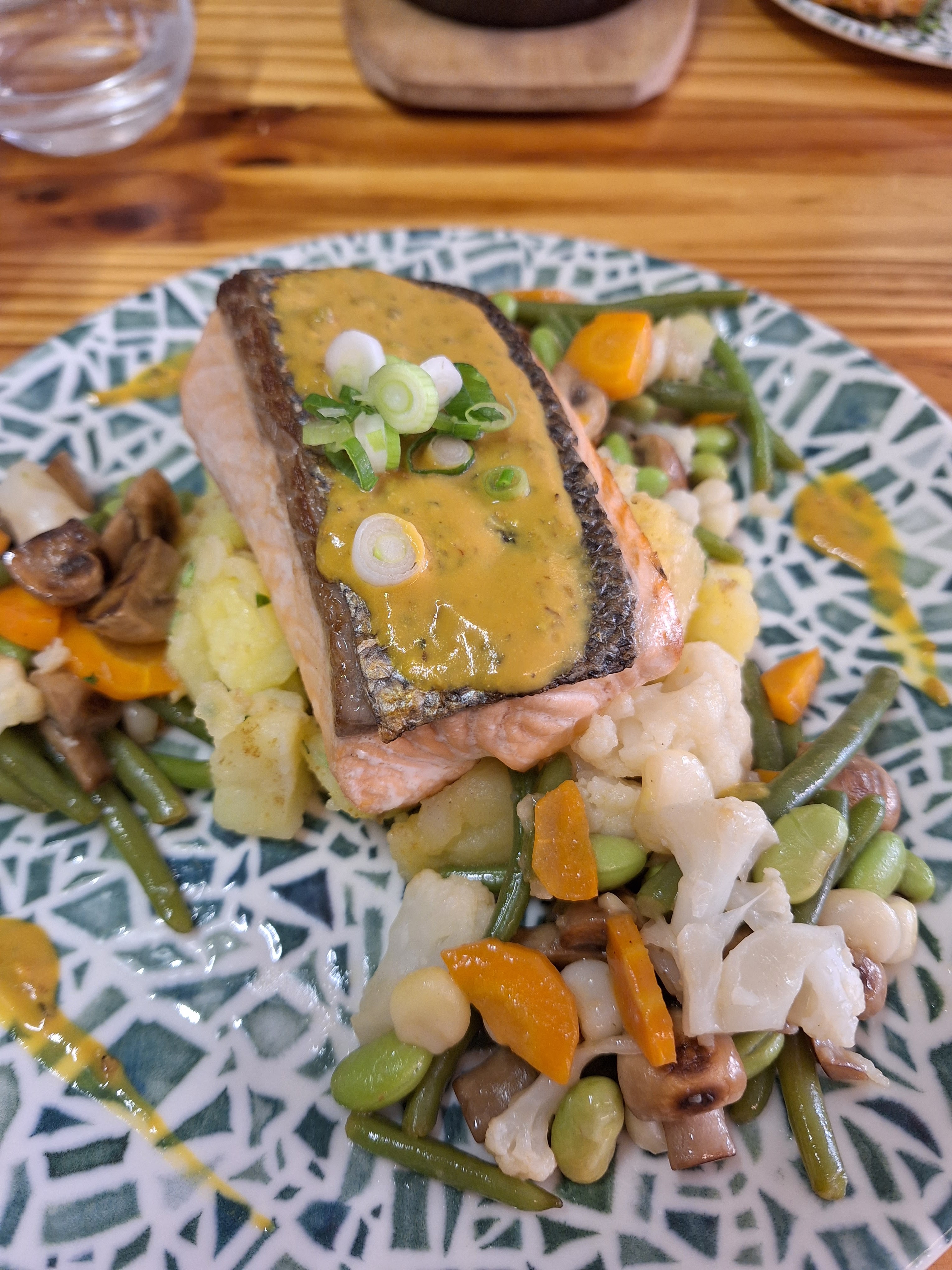 Restaurant très chaleureux Ambiance au top Cocktail excellent Entrée très bonne Plat de légume excellent Plat de poisson trop salé dommage Très copieux en tout cas Bonne adresse déçu de ne pas avoir pris de dessert