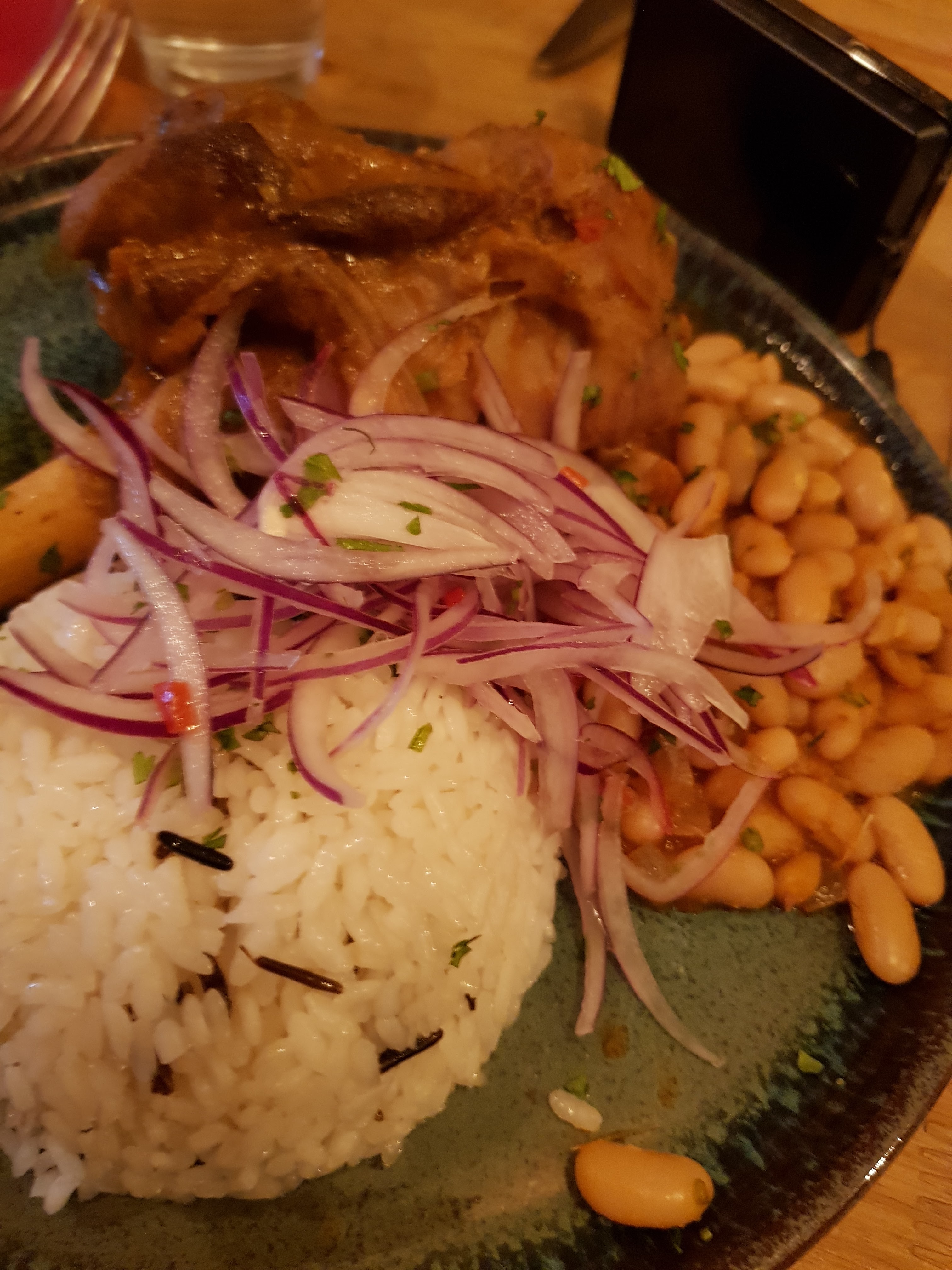 Soirée agréable au restaurant Colimba avec mon copain. En plus d'avoir des plats à la hauteur d'un grand chef et d'avoir un service agréable, on ressent bien l'Amérique du Sud autant dans les plats, la carte et l'ambiance ressentie dans le restaurant. En entrée mon copain a pris un ceviche nikkei, donc du thon mariné au citron avec les oignons rouges accompagné de mais et de comcombres et de piment, en plats moi j'ai pris un lomo saltado al wok, délicieusement fait avec du rumsteak au soja, et mon copain un hornado de sangolqui fait de jambon mariné. Et en dessert nous avons pris à partager des picarones qui sont des rings de beignets, très bons aussi. Je recommande vivement à se rendre dans ce restaurant et goûter toutes les bonnes choses qu'ils proposent et découvrir les goûts et les couleurs l'Amérique du Sud comme si on y était.