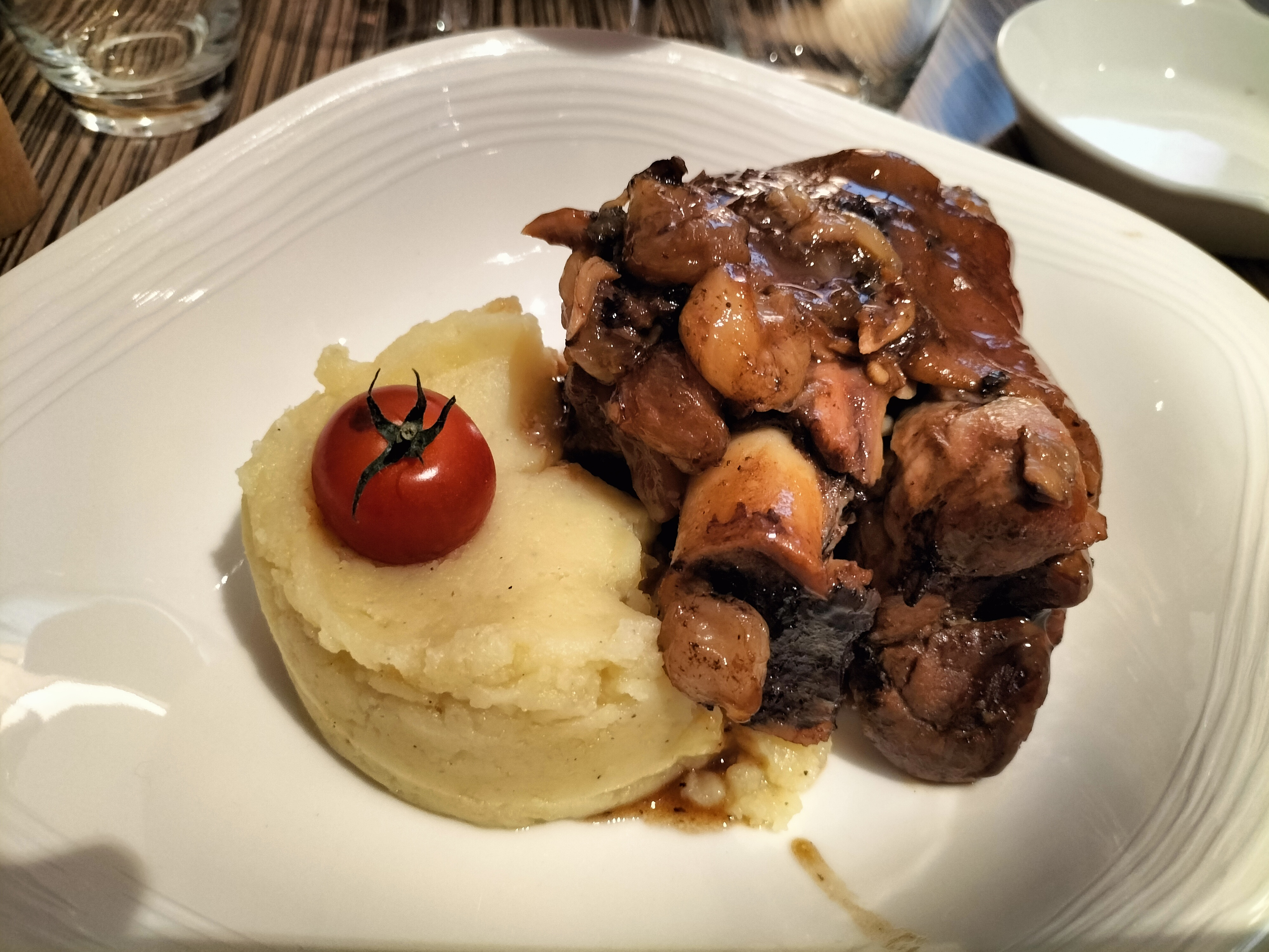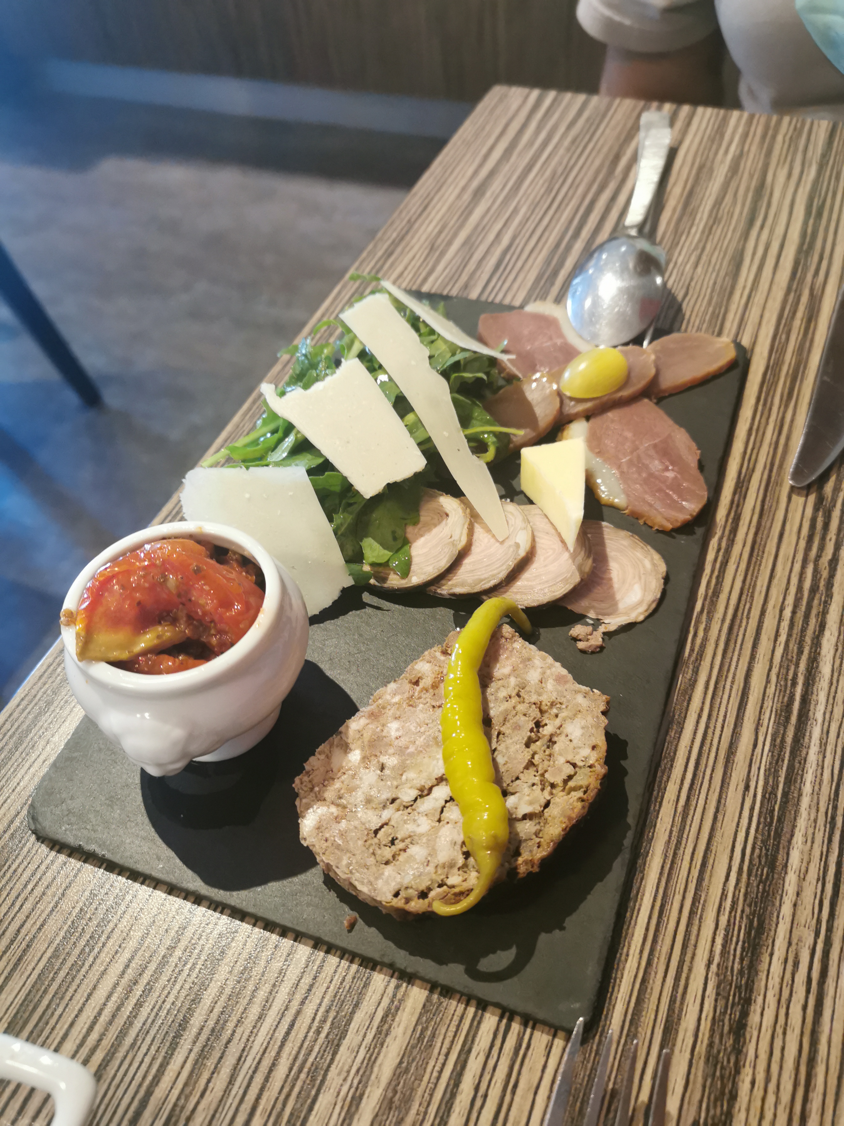 Nous nous sommes régalés avec une planche de charcuterie, le menu du jour, poulet sauce moutarde et son écrasé de pommes de terre. Dessert, sablé breton mascarpone et fraises fraîches.