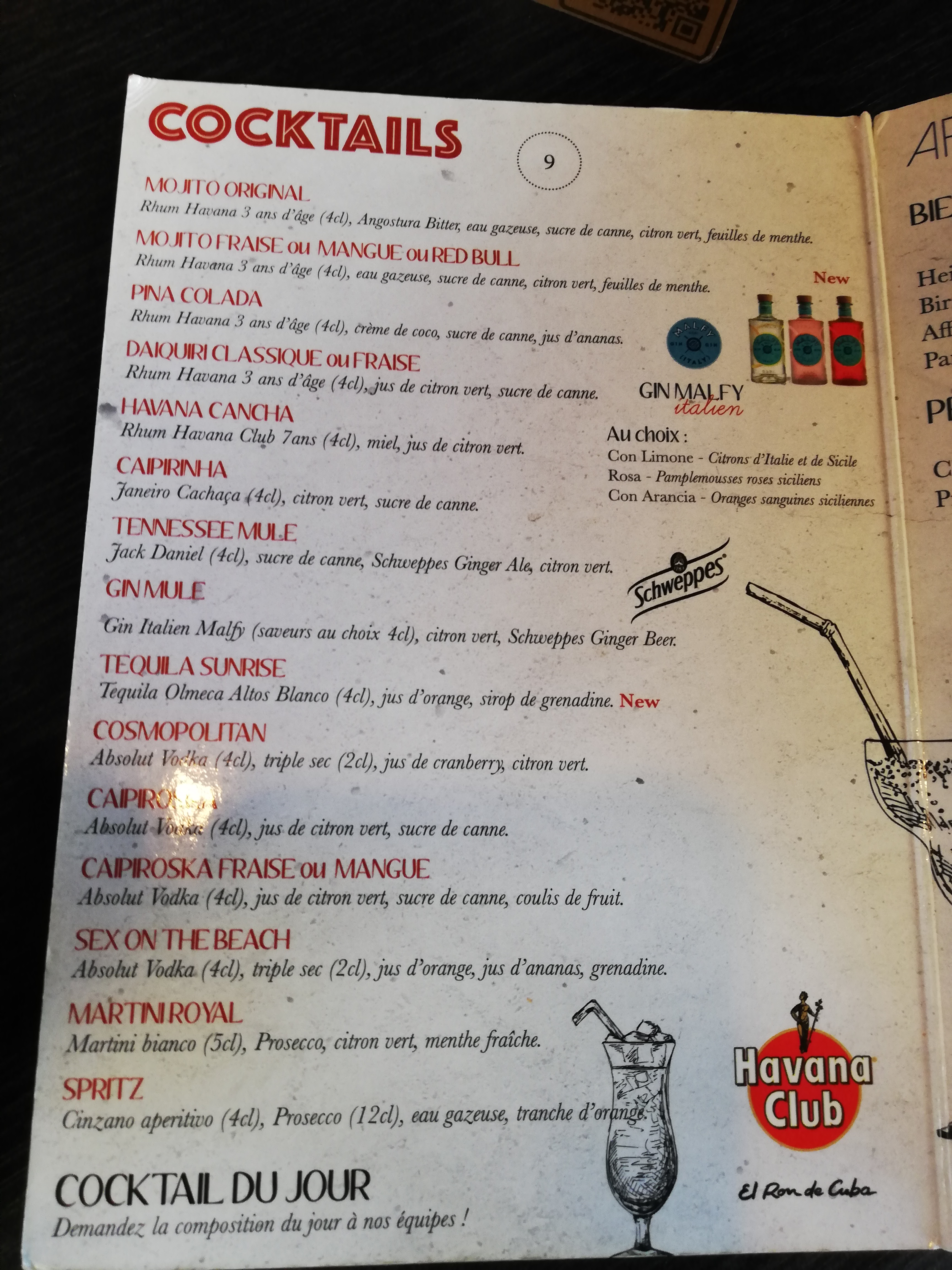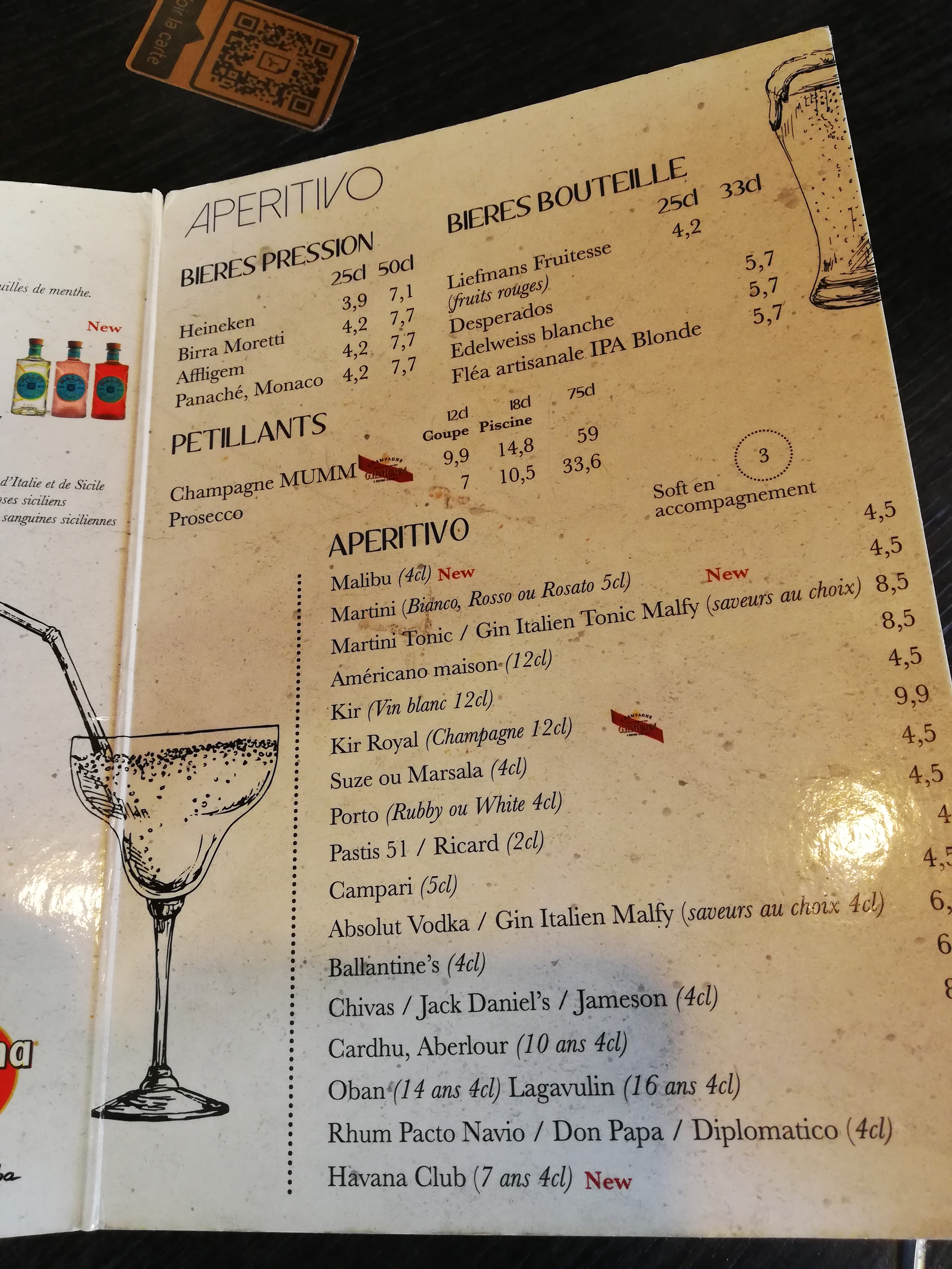 Pizza a 17/18€ pas assez cuite, les olives noires sont des olives vertes teintées, la mozzarella est caoutchouteuse.. la base tomate pas exceptionnelle. Franchement habituellement je suis pas déçu, pour le coup ça m’as un peu embêté, et la pizza m’est resté sur l’estomac toute l’après-midi. Cocktail caraïbos pour les connaisseurs a 9€. En général Soprano est un incontournable pour ma part, mais pas sûr de revenir.