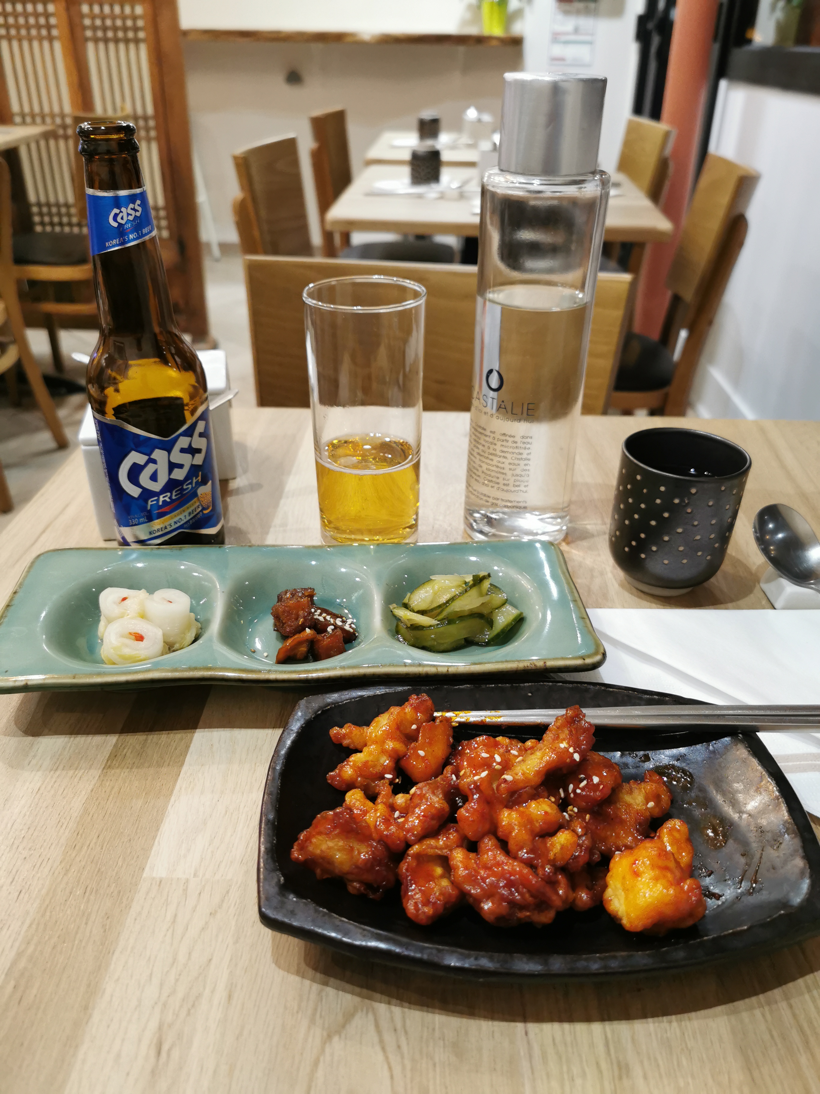 Nous avons pris de Gamja Jeon, Dak Gang Jeong et du Dak Nalgué, c'était très bon, le poulet frit est bien assaisonné et croustillant! Niveau bibimbaps, moins appréciés, niveau quantité on est plutôt raisonnable mais rien d'extravagant niveau goût, c'est du riz, de la viande, des légumes et un oeuf, tout ça pour une moyenne de 16€ c'est plutôt cher je trouve. Sinon le service était très bien, ils ont été très attentifs, on nous a resservi à maintes reprises des nouvelles carafes fraîches! Le restaurant ainsi que les toilettes sont propres.