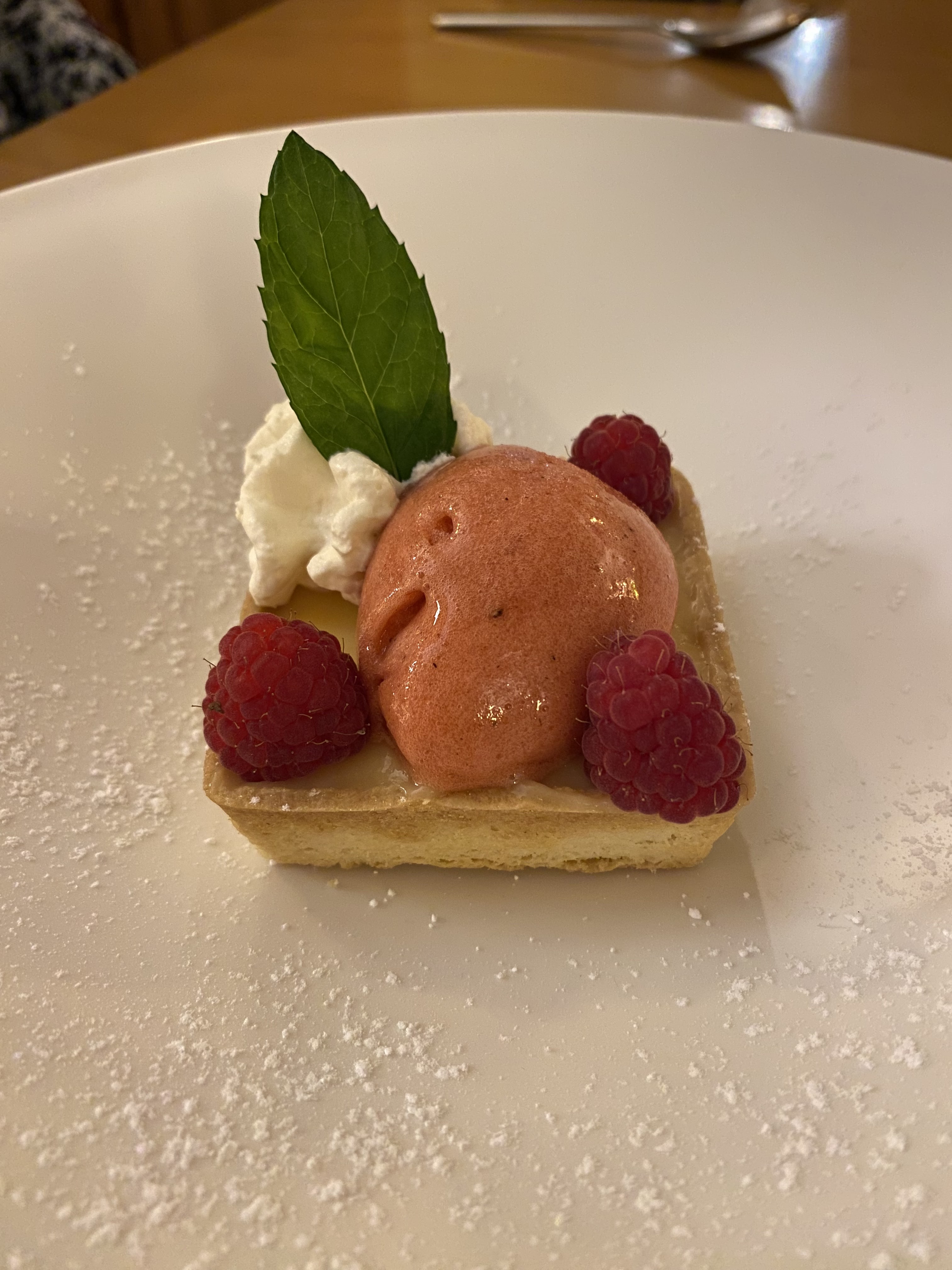La nourriture était absolument délicieuse et délicatement servie. Menu simple, facile de faire un choix. Cela vaut bien la nouvelle étoile Michelin. Ce moment aurait pu rester dans les mémoires comme tel, mais la descente ressentie par la suite, donnée par le service du personnel, a gâché notre expérience. Personnellement, comme je l'ai observé, l'attitude générale de nos hôtes faisait preuve de sang-froid, car elle manquait de chaleur et d'enthousiasme. Peut-être une anxiété de performance ?