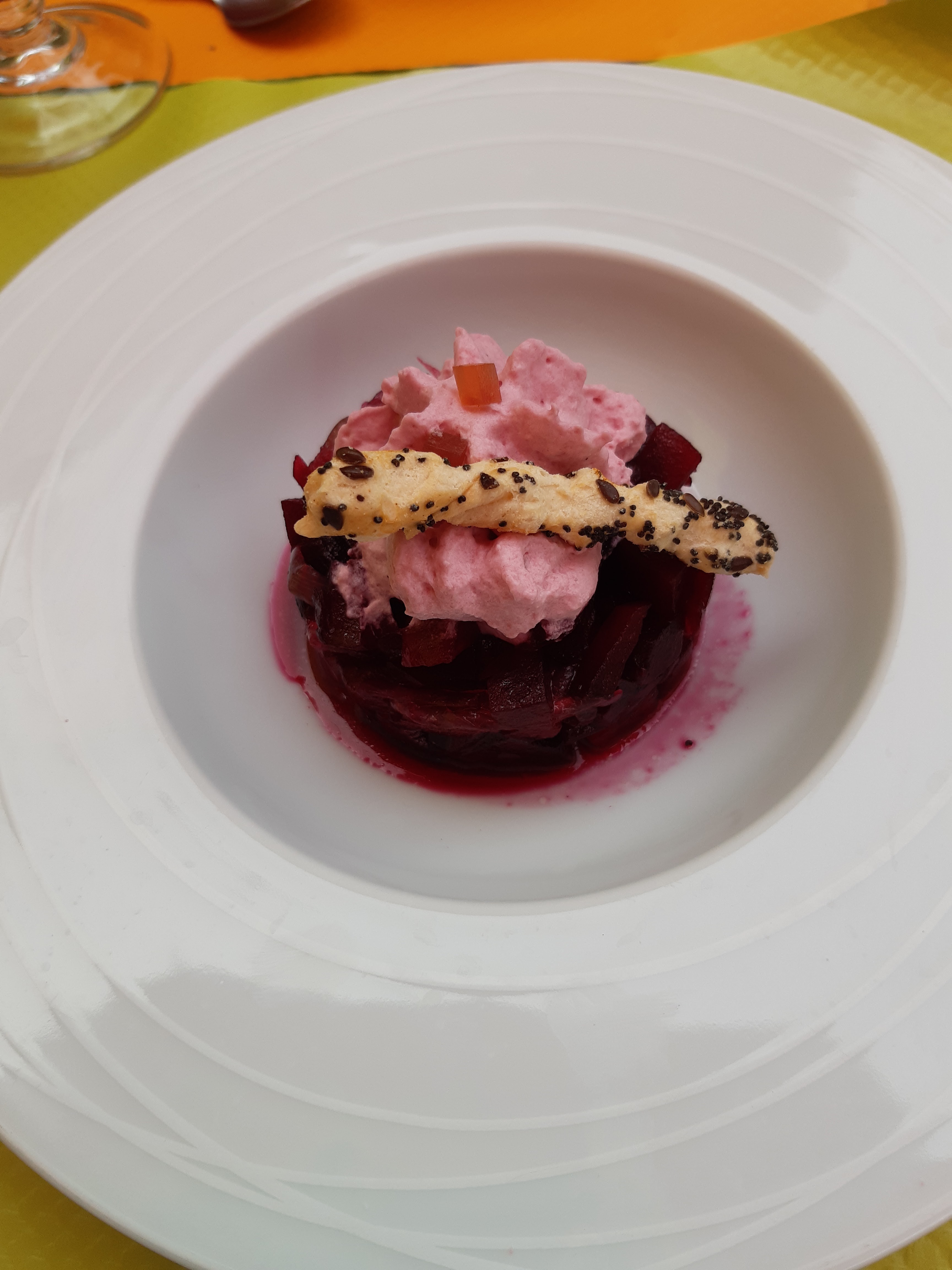 UN peu compliqué à noter...le chef est gentil, le vin excellent, l attention générale est bonne...par contre la nature des plats proposés est vraiment bof, et le choix plus que restreint...le fait d avoir peu de choix est plutôt un critère de qualité en général...mais là...on est limité sur de la betterave, de la carotte, lapin, Colin......les plats ne sont franchement pas très sexys....pas une seule grillade de boeuf..pas une seule salade...ok en entrée on a le choix entre foie gras betterave et saumon fumé. Au final les plats sont bien préparés mais prétentieux... quelques plats simples et plus conventionnels apporteraient un plus... le choix est très très restreint avec des goûts très spécifiques....à moins d'être vraiment fana de carotte....