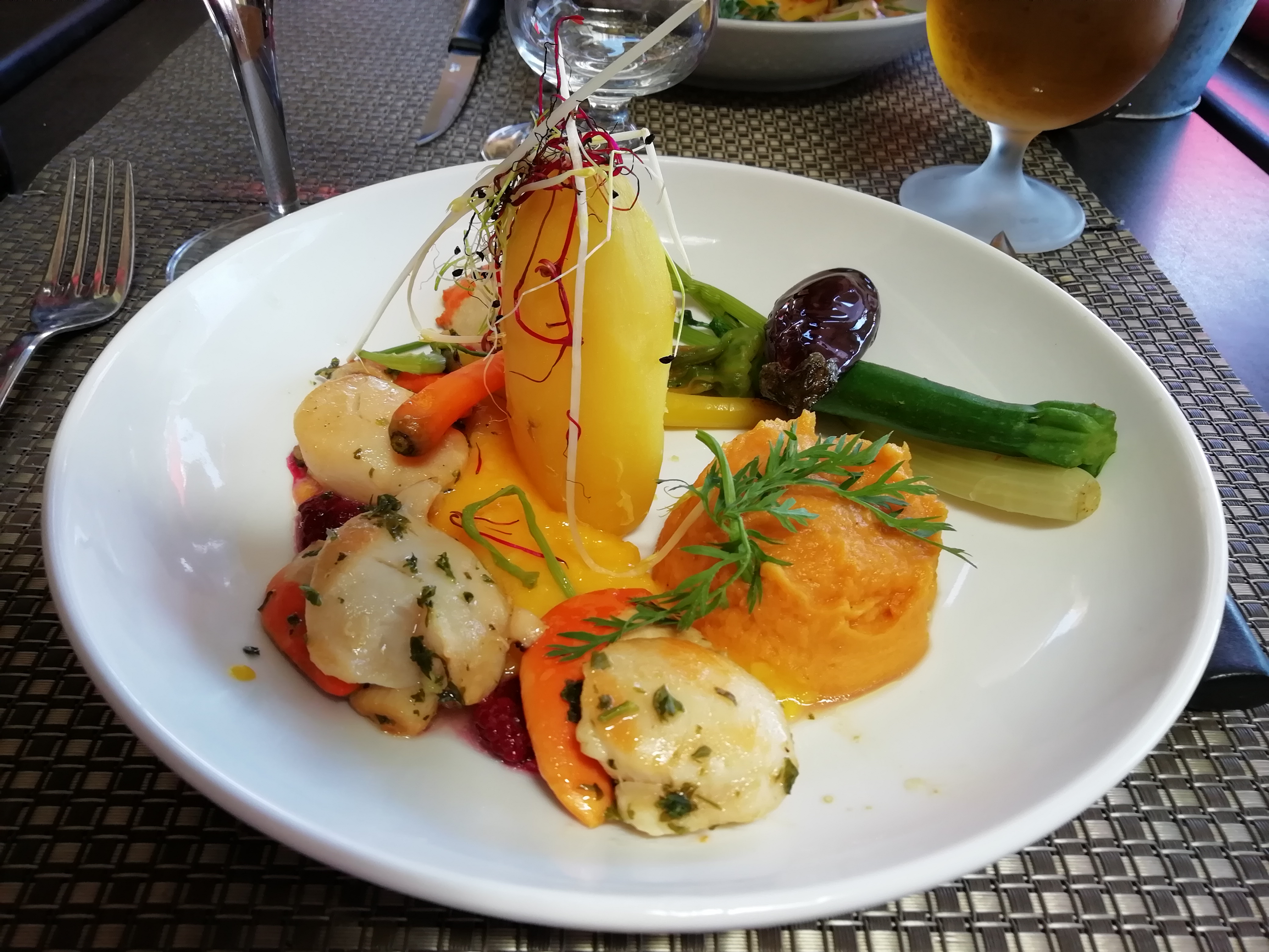Entrée ; tartare de saumon : très bon. Plat : Gratin dauphinois, légumes du soleil et poisson/gambas. Gambas très bonne, le poisson très fort en bouche, les légumes baignent dans l'huile. Bonne ambiance. Servi rapidement. Très belle vue