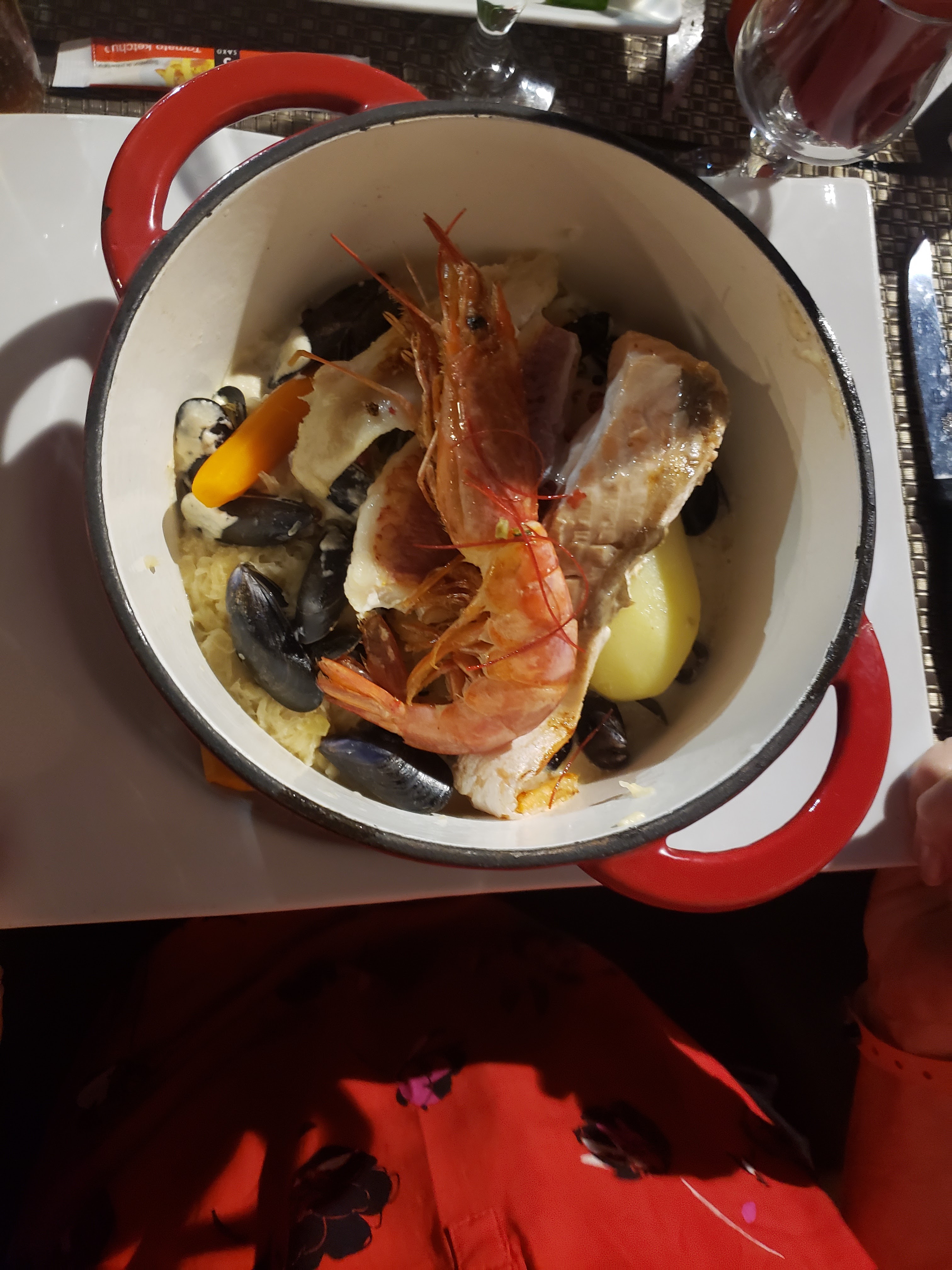 Assiette de gambas bien présentée, mais pas pratique car l'assiette est trop haute ( assiette à soupe ) pour couper les gambas l'assiette bouge dans tout les sens... Il ne faut pas avoir soif chez eux car après 3 demande pour de l'eau toujours pas servis...