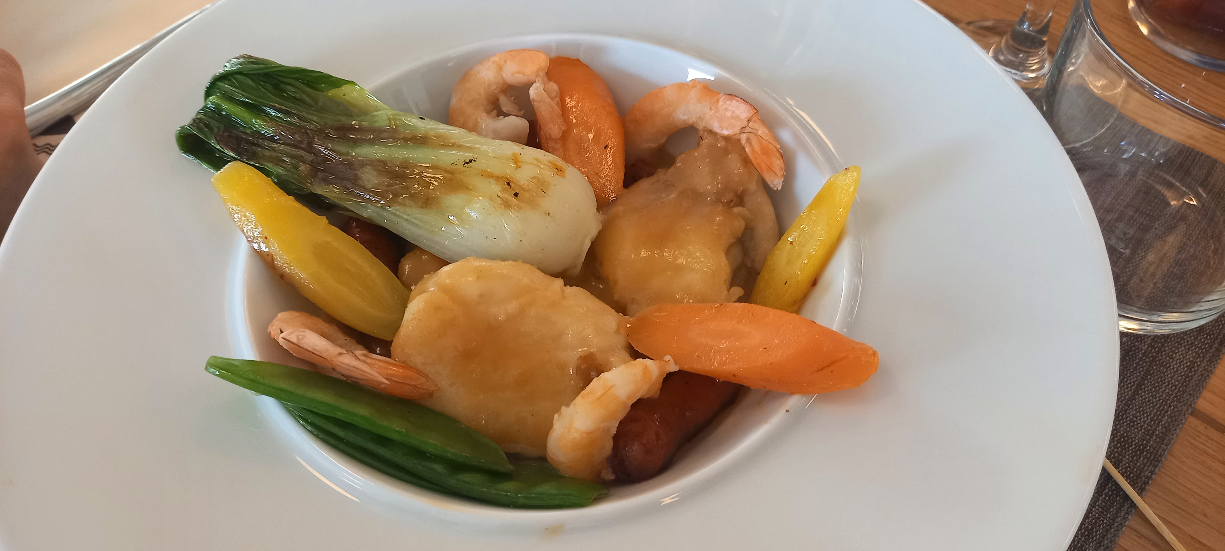 Le lieu est agréable et accueillant. La salle principale est grande mais beaucoup de convives. Ainsi l’attente a été vraiment très longue entre les plats … 3h sur place avec une petite de 6 ans qui s’impatientait. Peut être une organisation à revoir avec plus de serveurs en salle! Les crevettes étaient bonnes mais nous n’en n’attendions pas moins. J’ai pris comme une assiette Buddha bowl avec des crevettes et c’était plutôt bon. L’entrecôte était bien cuite, comme nous l’avions demandé. Les desserts, rien de fou même si nous avons pris la grande assiettes de mignardises.