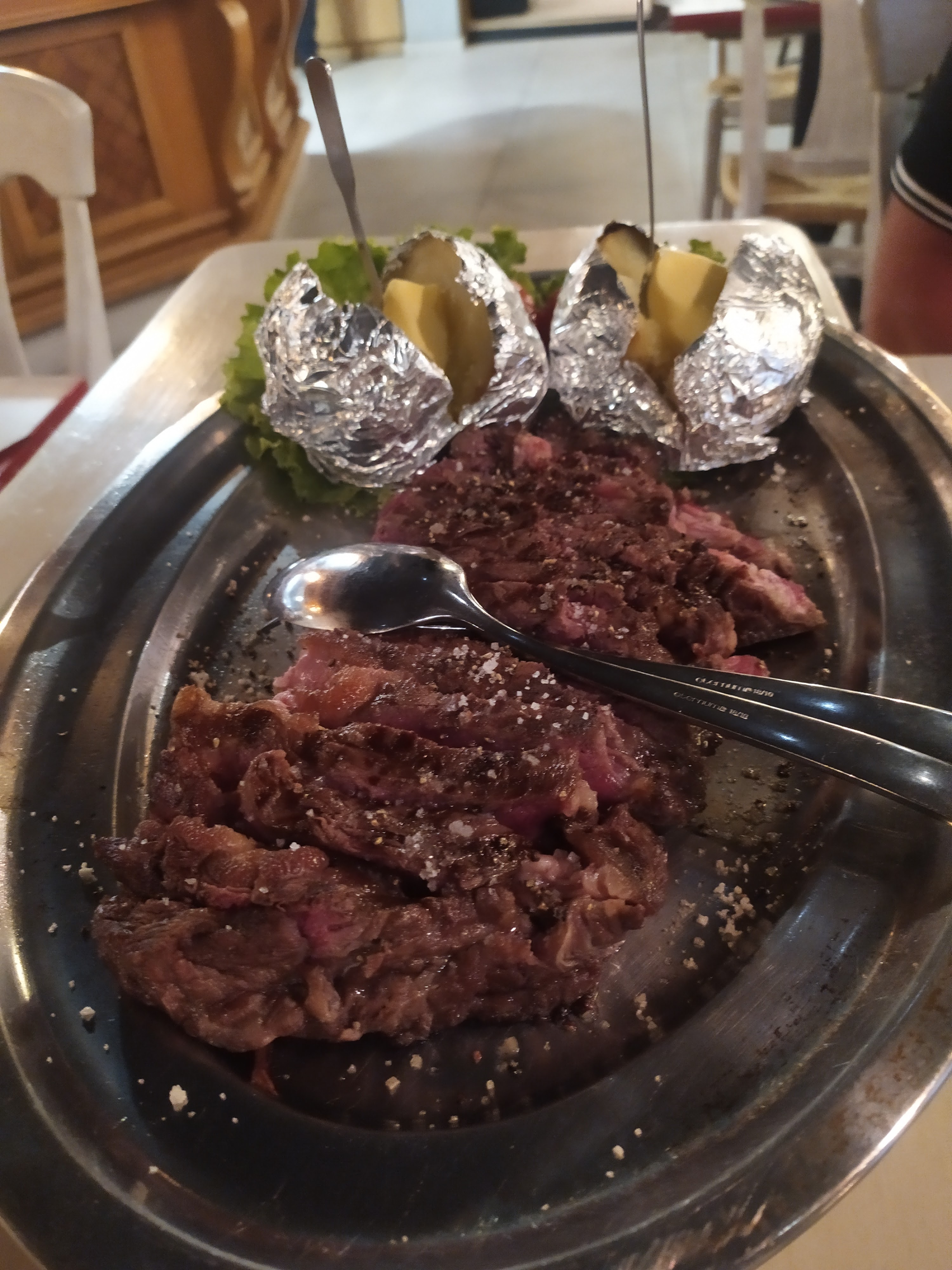 faux filet servis avec une patate une feuille de salade et une tomate cerise , c’est bon mais c’est peu.. 20 euros pour un plat qui ne m’a pas repue.. bonne adresse malgré les quantités
