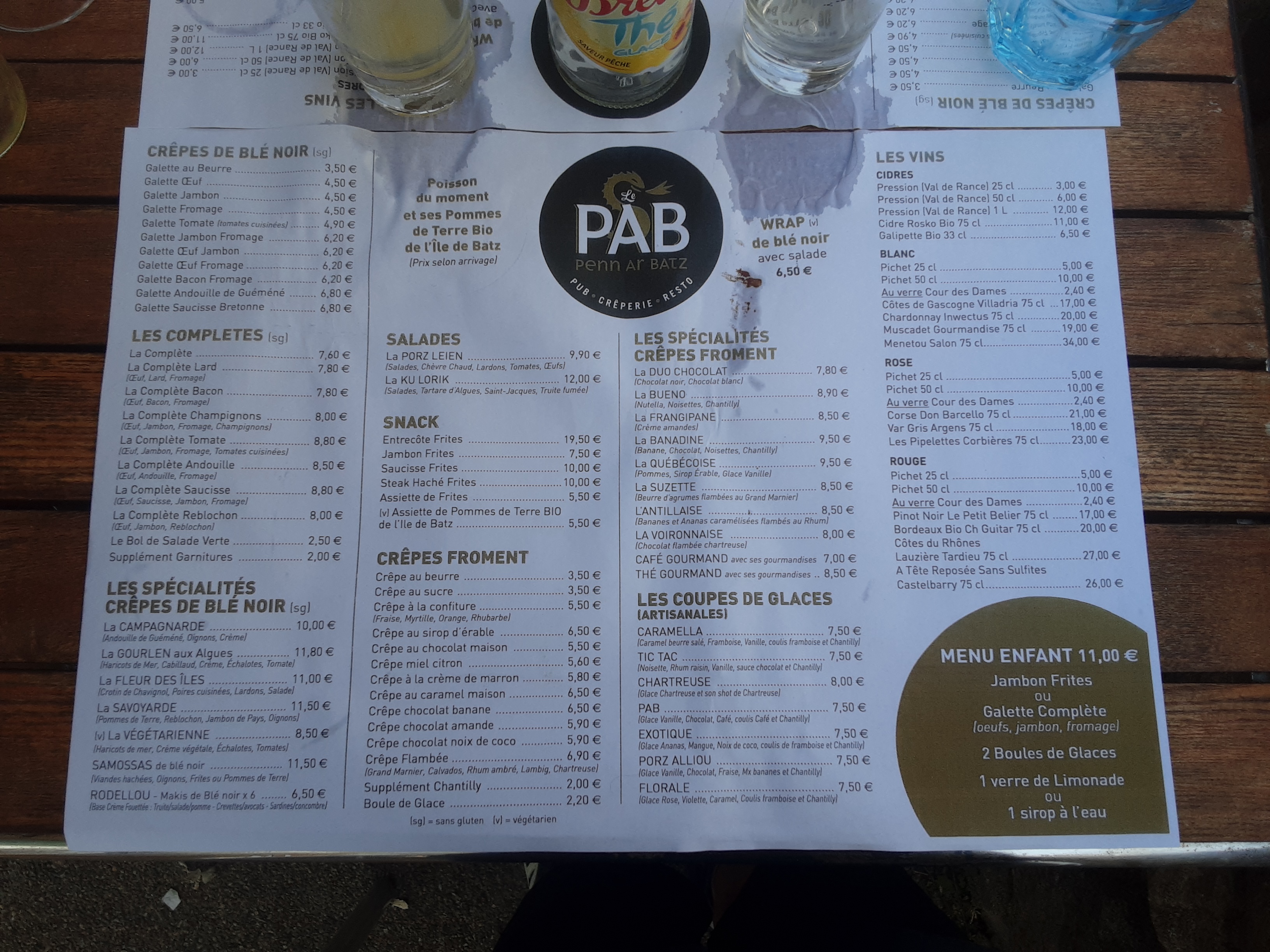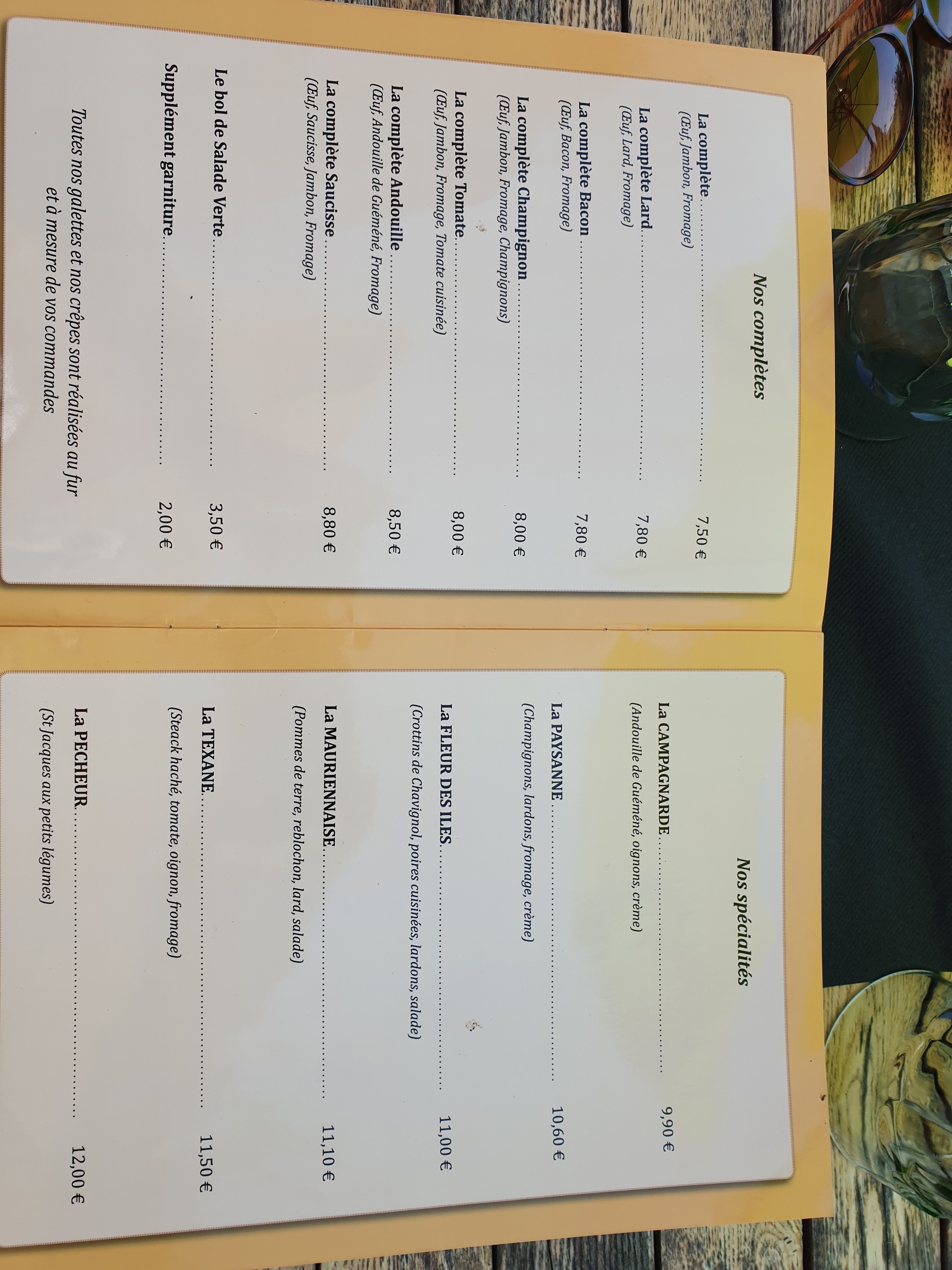 Crêperie restaurant bar établissement correct sans plus les prix sont un peu élevés c est la saison touristique. Je suis navré de voir qu au fil du temps cette merveilleuse île perd son charme au profit du mercantilisme