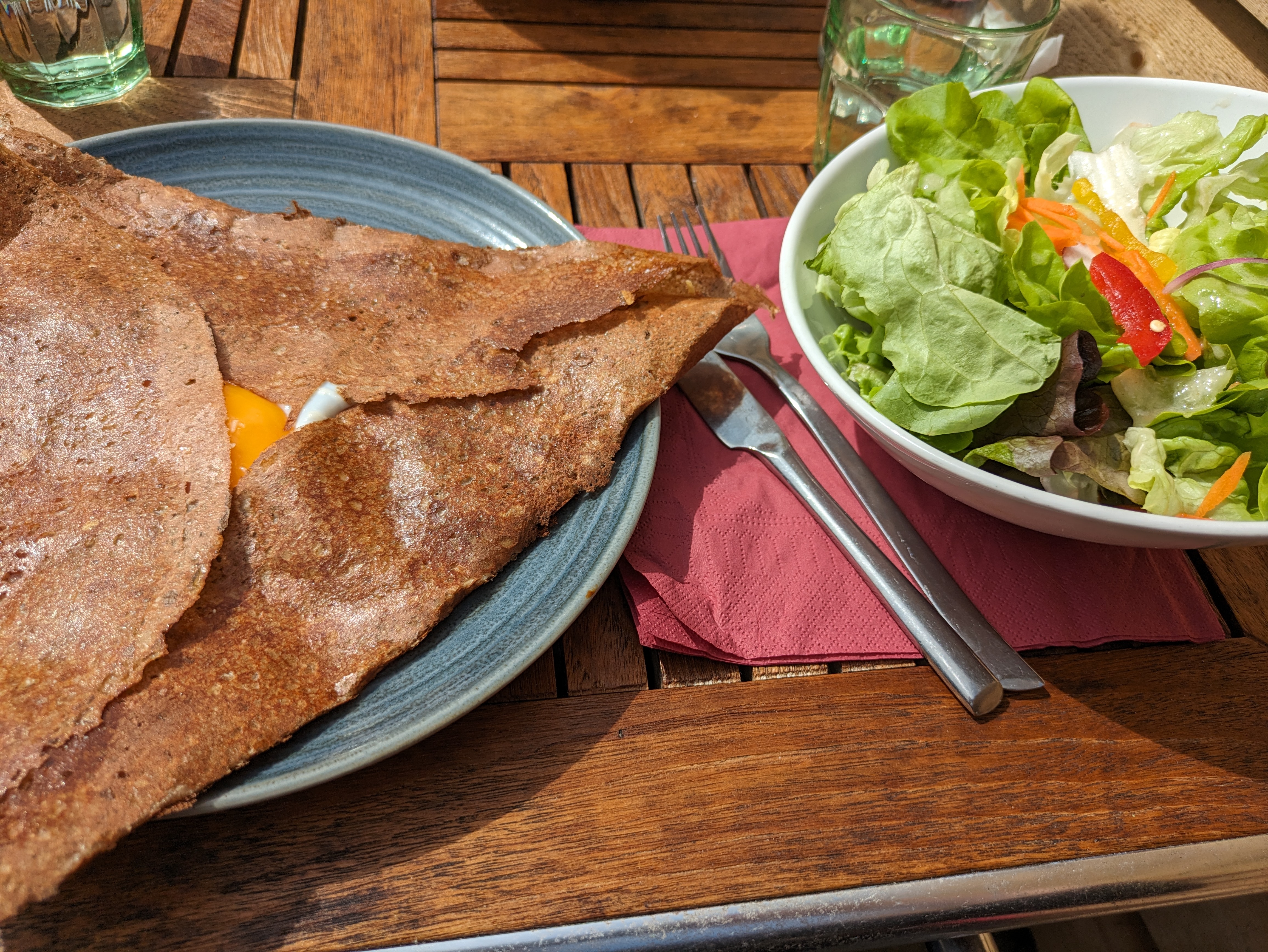 Mangé le soir, attente longue entre l aperitif et le plat, nous etions 4 Creperie sans plus. La complete normale est correcte, rien d exceptionnelle. La complete andouille est legere pour le prix... mais bonne. Gros mangeur vous prendrez 3 galettes...