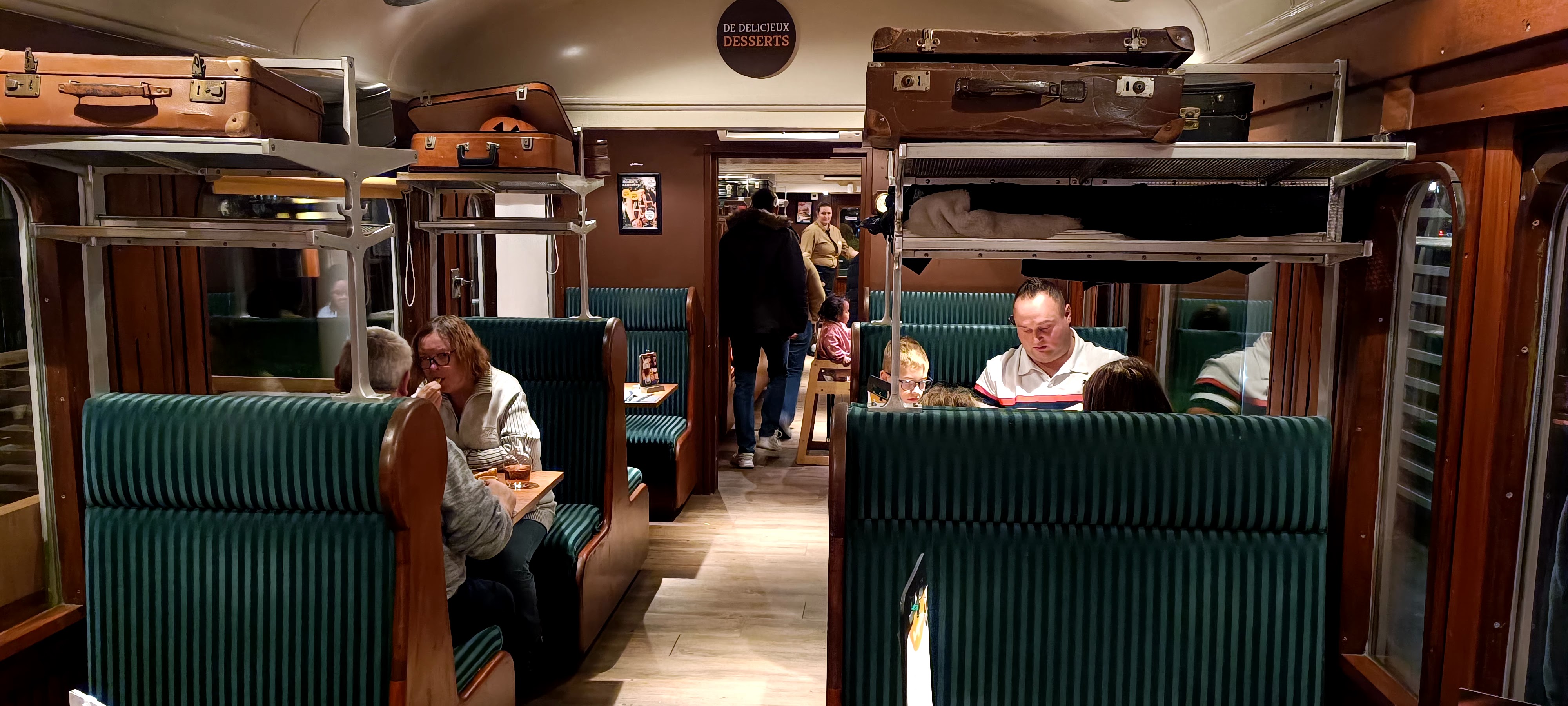 Bonjour . Je suis venue plusieurs fois . Les enfants (ado) adore le concept. Alors si vous ete placer dans le wagon c est plus calme ,plus cosy . Mais dans la grande sale sa fait cantine . Mais alors le pire c est la petite salle du font. Chaise en bois d école. On dirait une cantine . Trop de bruit . Pas d intimider. Pour le prix on demande quand même un minimum de confort et d intimider. Cordialement
