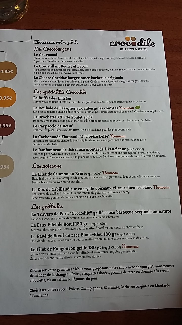 Bonjour, première fois faut que je teste le restaurant crocodile. J'ai beaucoup aimé l'ambiance où nous pouvons manger dans un train. Les serveurs sont vraiment très sympathique. J'ai testé la carbonade flamande qui était vraiment très bonne. Je trouve juste un tout petit peu cher certains prix comme de devoir ajouter 7,50 € pour un buffet à volonté en plus de votre plat qui tourne dans une tranche de 15, 20 euros.
