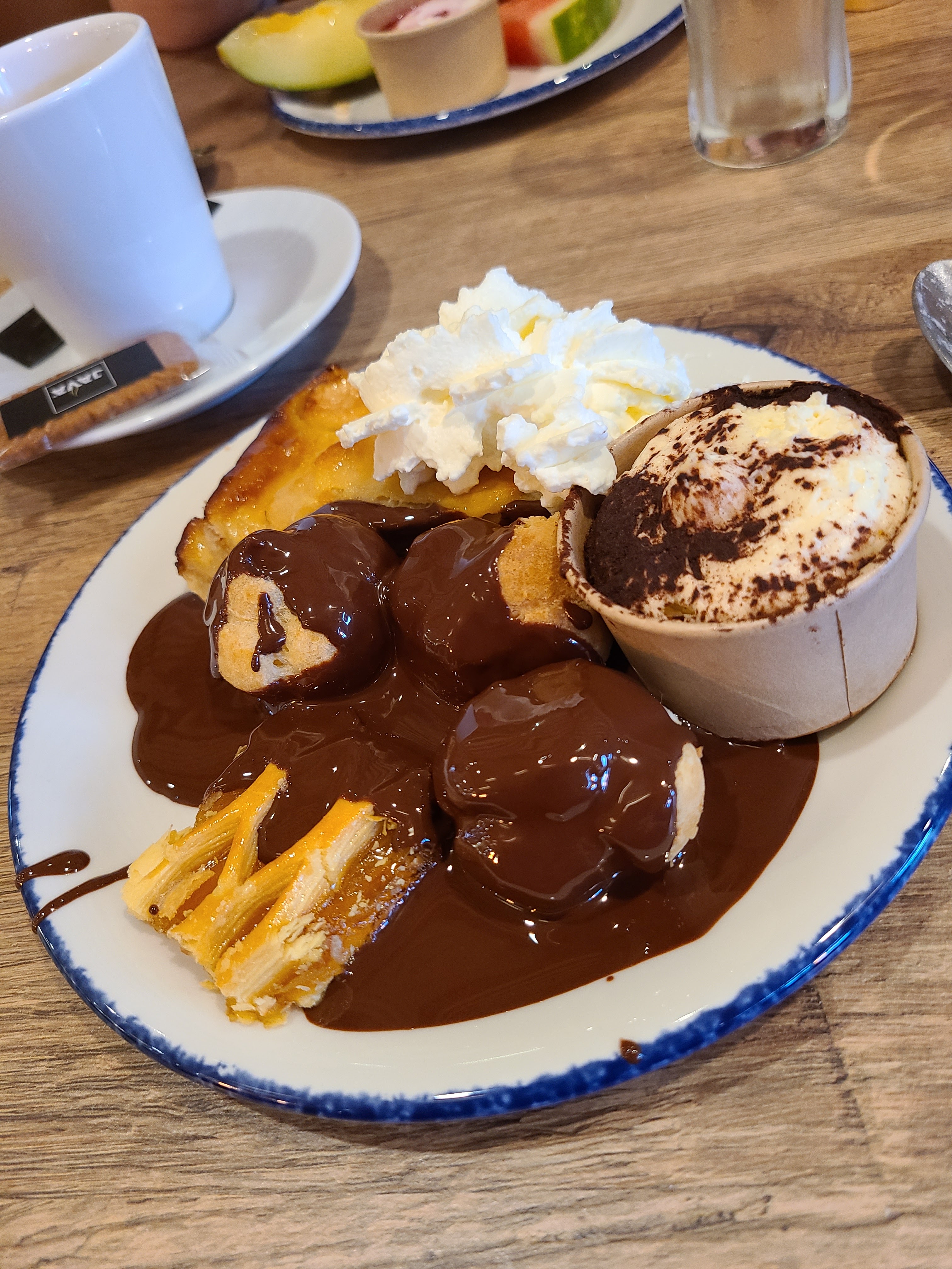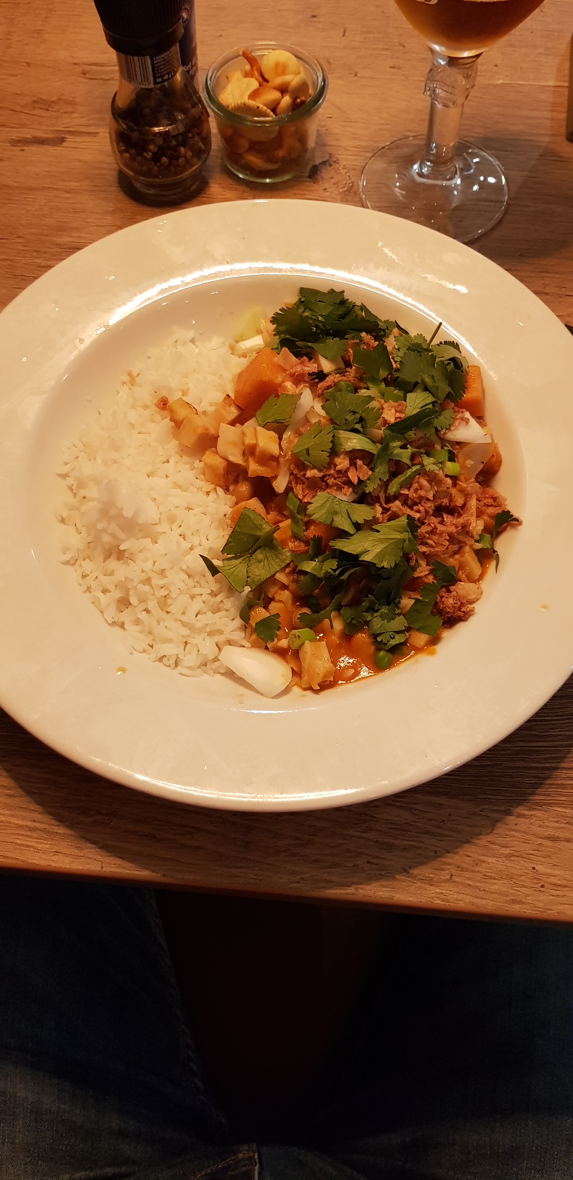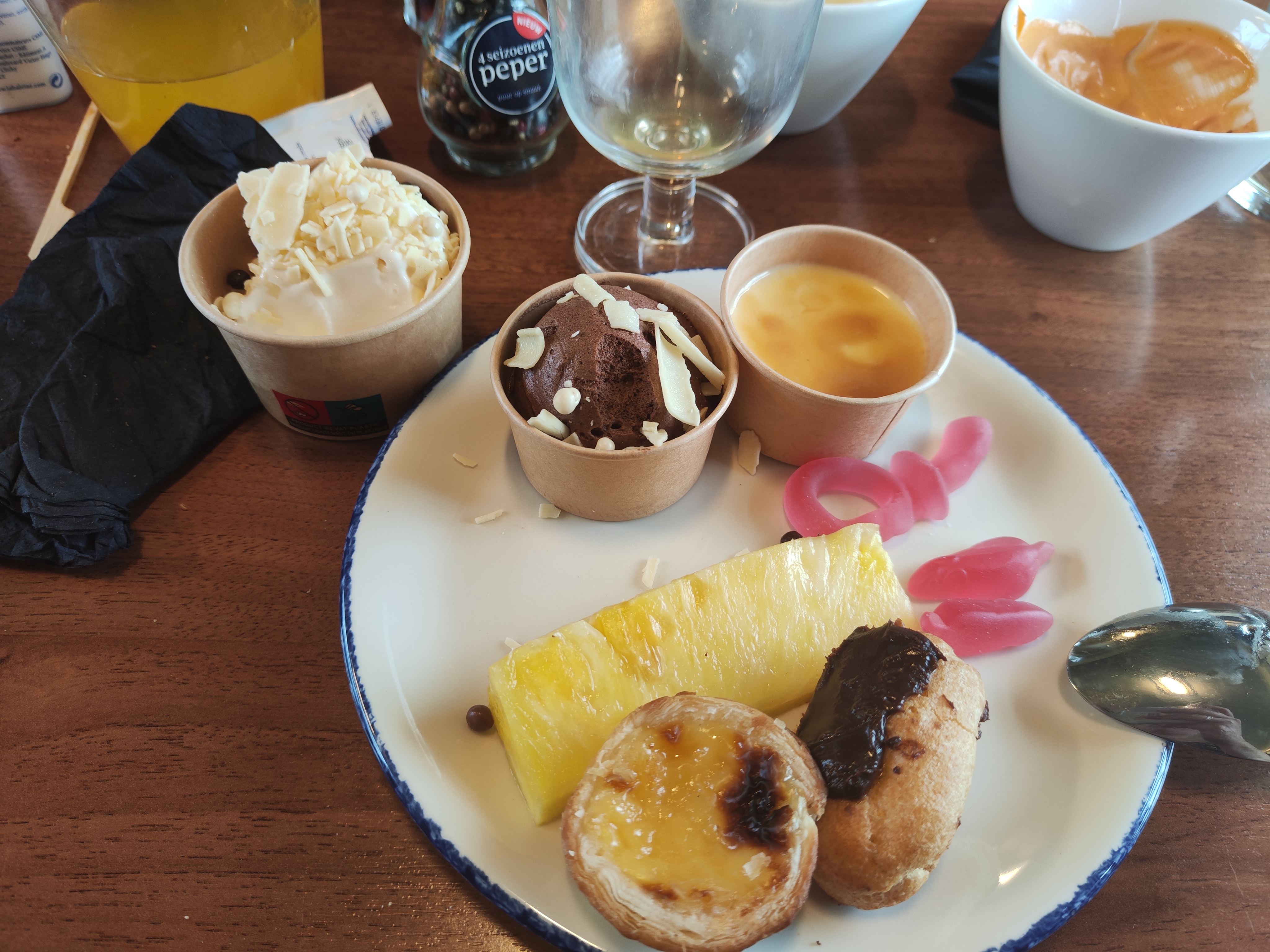 Je suis arrivé à 15h15 (je faisais une p'tite ballade pédestre quand mon estomac s'est rappelé à mon bon souvenir) j'ai été très bien accueilli, on m'a expliqué leurs systèmes plats et/ou buffets. J'ai pris en plat principal un curry oriental au poulet (tout mangé jusqu'au dernier grain de riz) et opté pour le buffet dessert. Quand vous prenez un buffet vous avez automatiquement le buffet boissons hygiéniques offert. Bien mangé moi😌