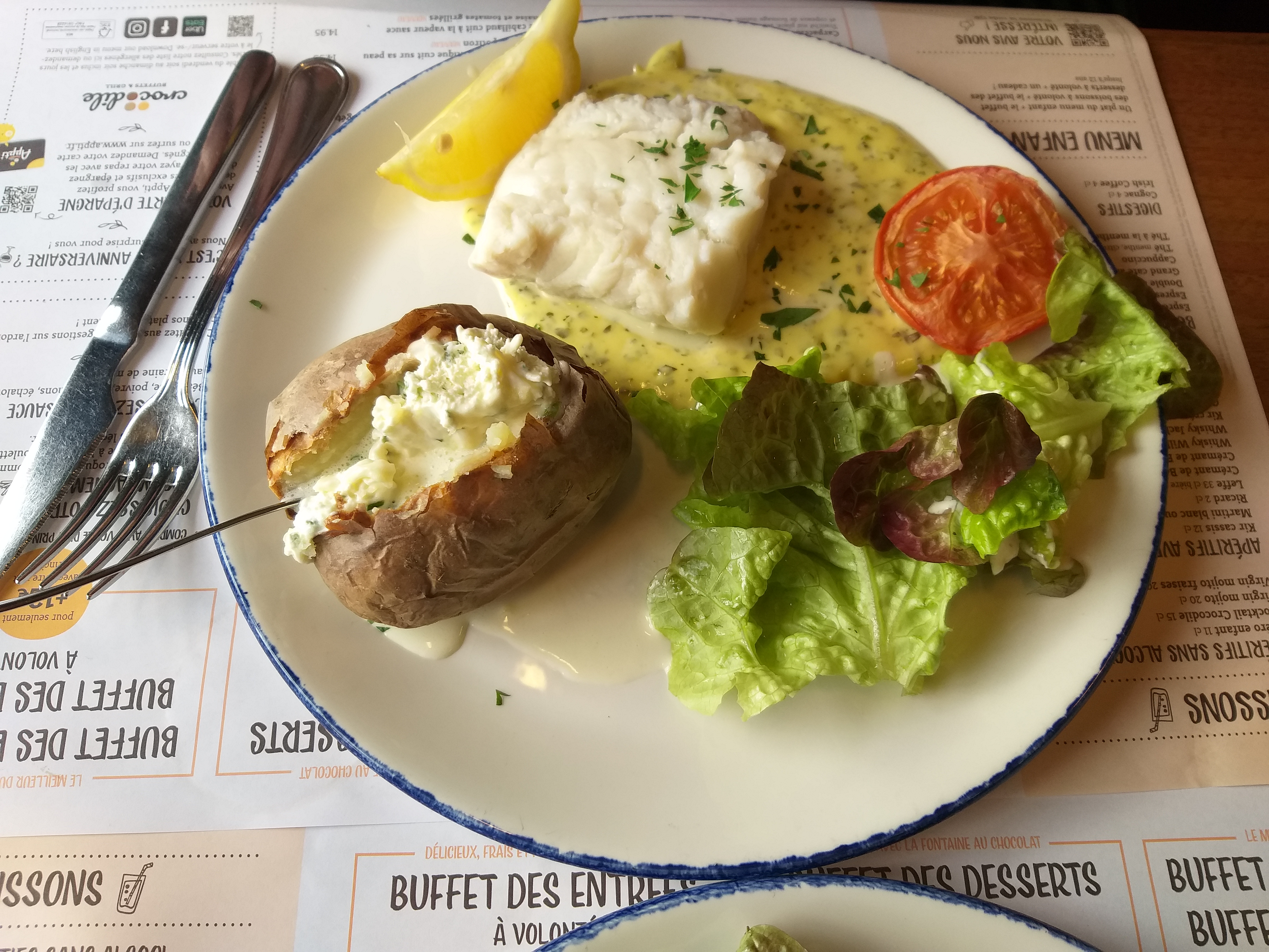Le buffet d'entrée est bien garni.le poisson était bon .La serveuse très sympa nous avons passé un très bon moment.