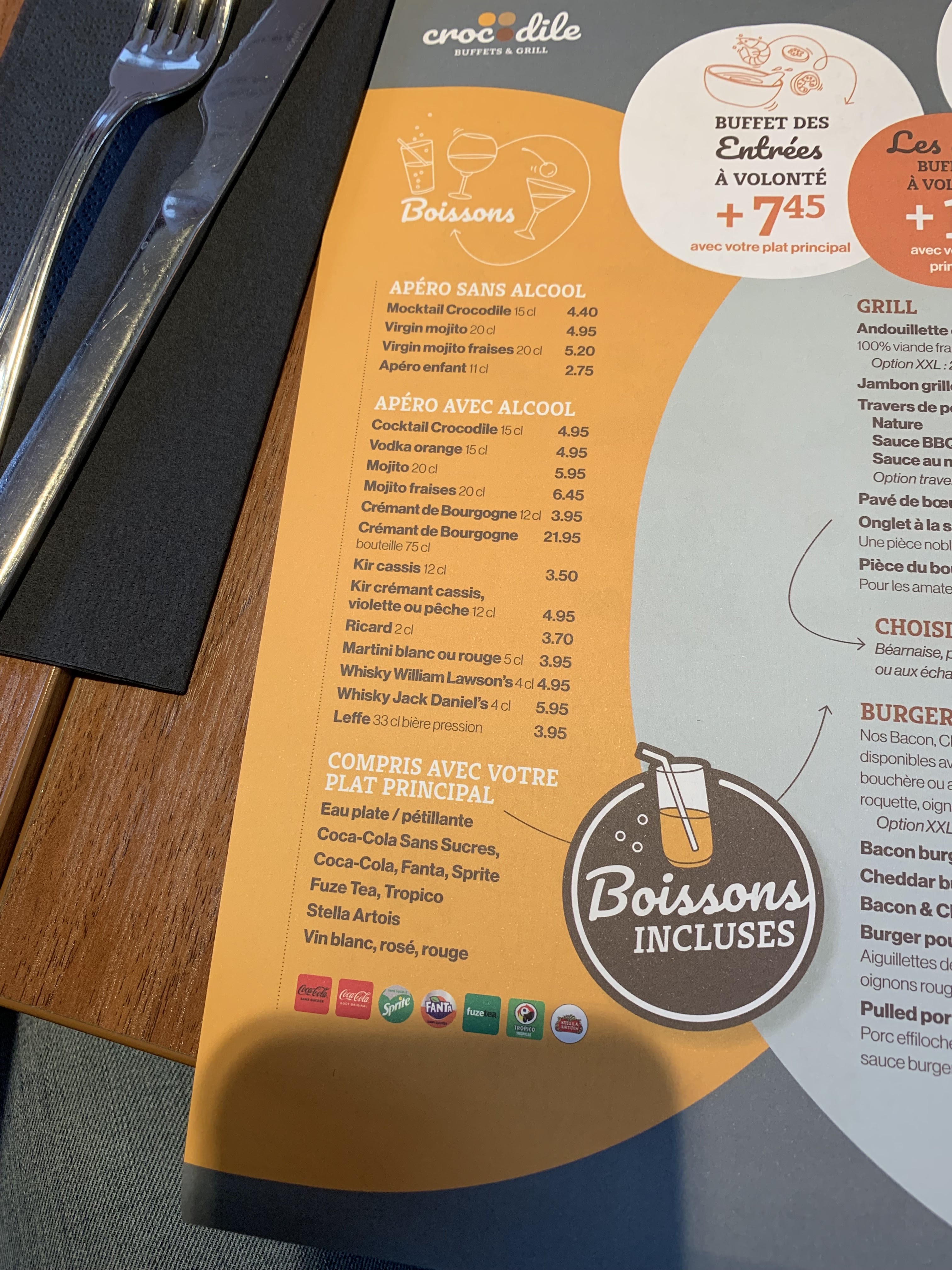Première visite pour nous ce midi, nous étions 4, et avons pris deux menus crocodile à volonté, 1 pavé de bœuf blanc bleu et un bacon cheddar burger, ainsi que les desserts, nous avons tous aimé et très très bien mangé, choix des salades assez varié, mocktail crocodile délicieux, boisson à volonté. Très bon acceuil et très bon suivi des serveurs.