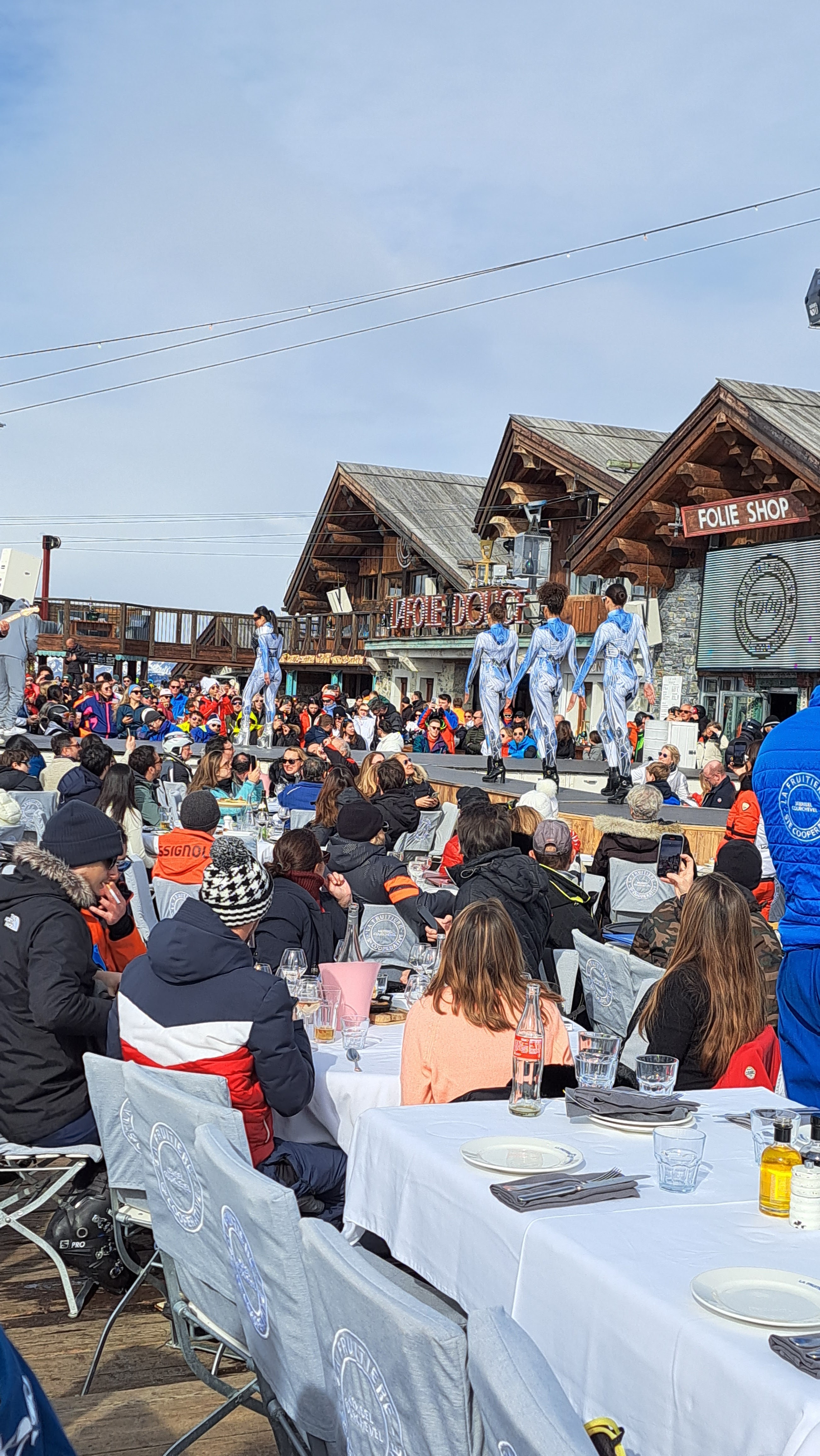 LA FOLIE DOUCE DE MERIBEL COURCHEVEL est un restaurant d'altitude aux pieds des pistes où vous pouvez profiter d'un spectacle de GRANDE QUALITÉ tout en dégustant un délicieux repas servi par une équipe jeune de serveurs et serveuses très professionnelle et sympathique ; différentes zones : restaurant intérieur, bar extérieur, restaurant extérieur, 2 shops, etc... ; après avoir passé un agréable moment dans cet endroit, c'est ravi que l'on rechauffe ses skis 🎿 🎿 pour retrouver les pistes vers la station...