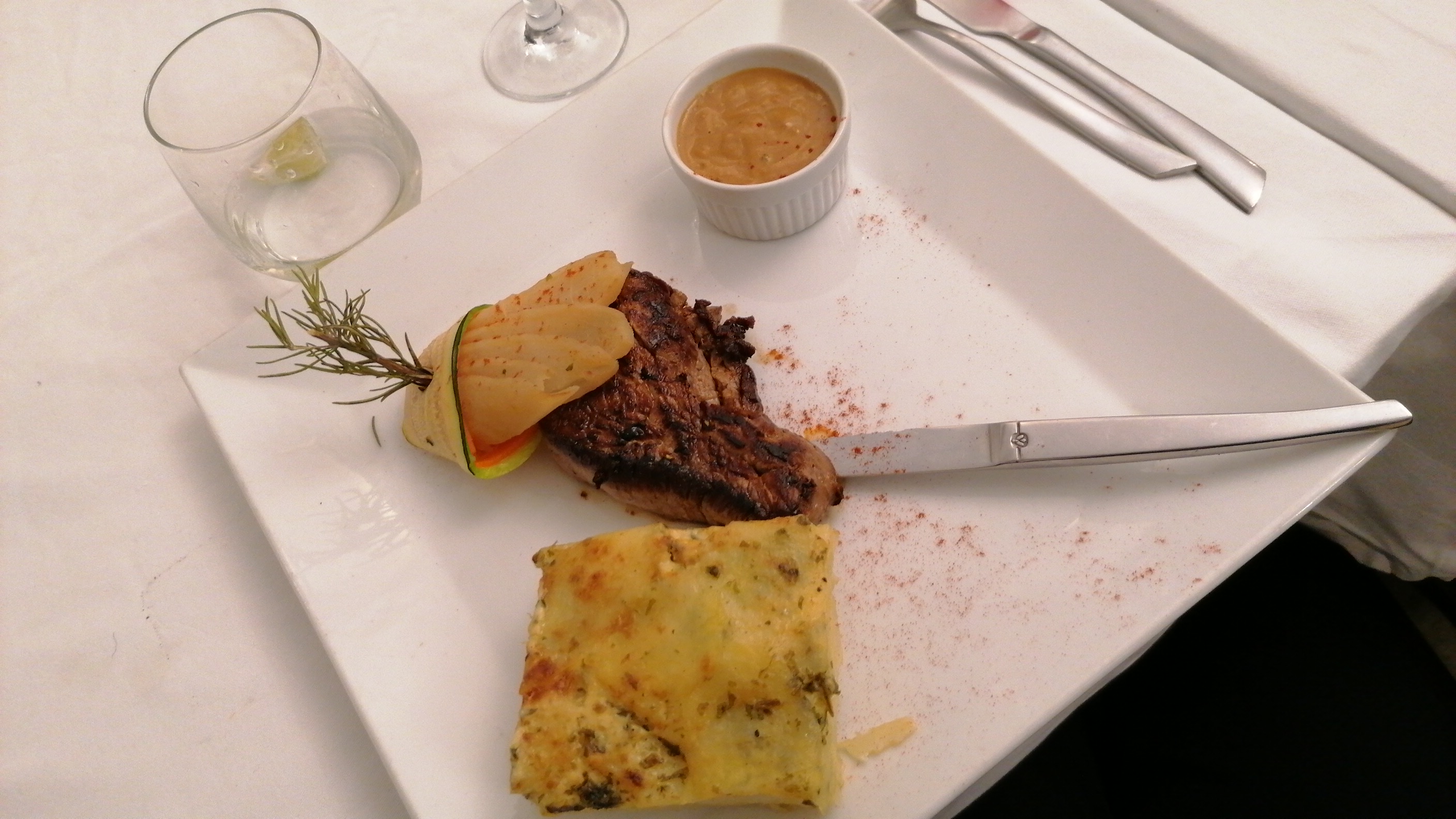 La musique va trop fort. Le DJ parle trop fort L'assiette et le menu ne correspondent pas.Une tranche de rôti de boeuf servie à la place d'un tournedos...😡😎 Plats servis au milieu des danseurs.