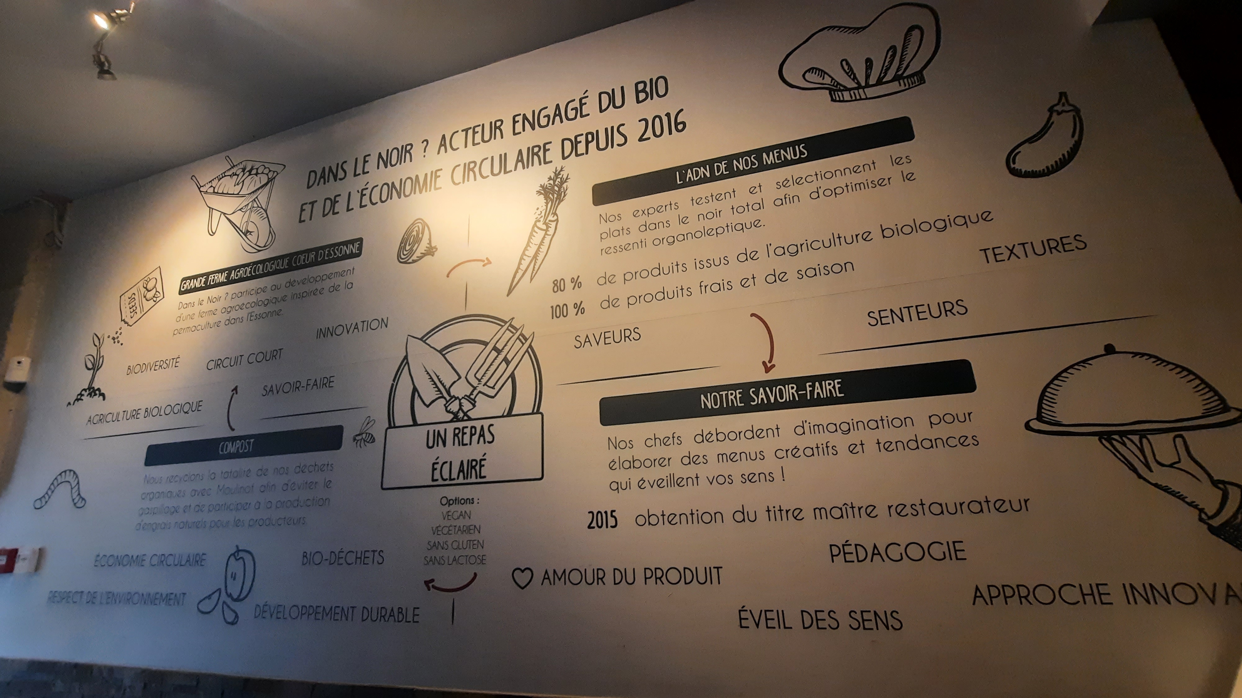En ressenti, le repas le plus long depuis celui de ma première communion Plus sérieusement, En positif : tout le monde est très gentil Pour le reste: cela semblait une bonne idée ( dans l’air du temps, inclusif et tout ça) de faire une expérience dans le noir. Mais non en fait Dès l’accueil : gros b.. tout le monde arrive en même temps ( apparemment un manque de respect des horaires par les clients) Puis la salle: plongés dans un noir absolu ( c’est la règle) mais justement cela décuple les autres sens : tellement de bruit qu’une migraine tenace s’installe, et qu’il est difficile de se parler L’impression que c’est très exigu : je touche le( la?) voisin (e) plusieurs fois, mon mari a peu de place pour ses jambes J’ai l’impression d’étouffer ( je suis un peu claustrophobe) La nourriture est quelconque , on nous a présenté avant de repartir ce que nous avons mangé, cela semblait joli. Apparemment de la truffe dans l’entrée, que nous n’avons pas trouvé ni senti ( la truffe, cela sent très fort, et nous sommes de grands amateurs) Idem pour le vin, sauf le vin servi avec le dessert, intéressant Pour conclure, une expérience décevante, qui nous a semblé très très longue ( même si ce n’était que deux heures) Nous nous attendions à un partage, à des tests sur les saveurs, à une description des plats au moins après un premier test à l’aveugle ... Rien de tout cela. Il n’y a pas d’accompagnement contrairement à ce qui est présenté ( sauf pour aider à trouver verre et couverts).Nous sommes juste « dans le noir ». Peut-être faut-il privilégier le concept d’atelier pour goûter l’expérience? Donc : expérience à faire plutôt avec des copains ( la table d’à côté a tenté de faire transiter la boule de falafel d’une assiette à l’autre, ça semblait rigolo) et non en couple En choisissant le premier prix : 85 euros avec accord met vin par personne , c’est un peu cher payé. Nous payons un concept et non un bon repas. A éviter si vous êtes claustrophobe, si vous êtes fin gourmet et/ou considérez que la cuisine passe également par les yeux Se priver d’un sens pour mieux utiliser les autres, pourquoi pas, mais pas dans ces conditions.