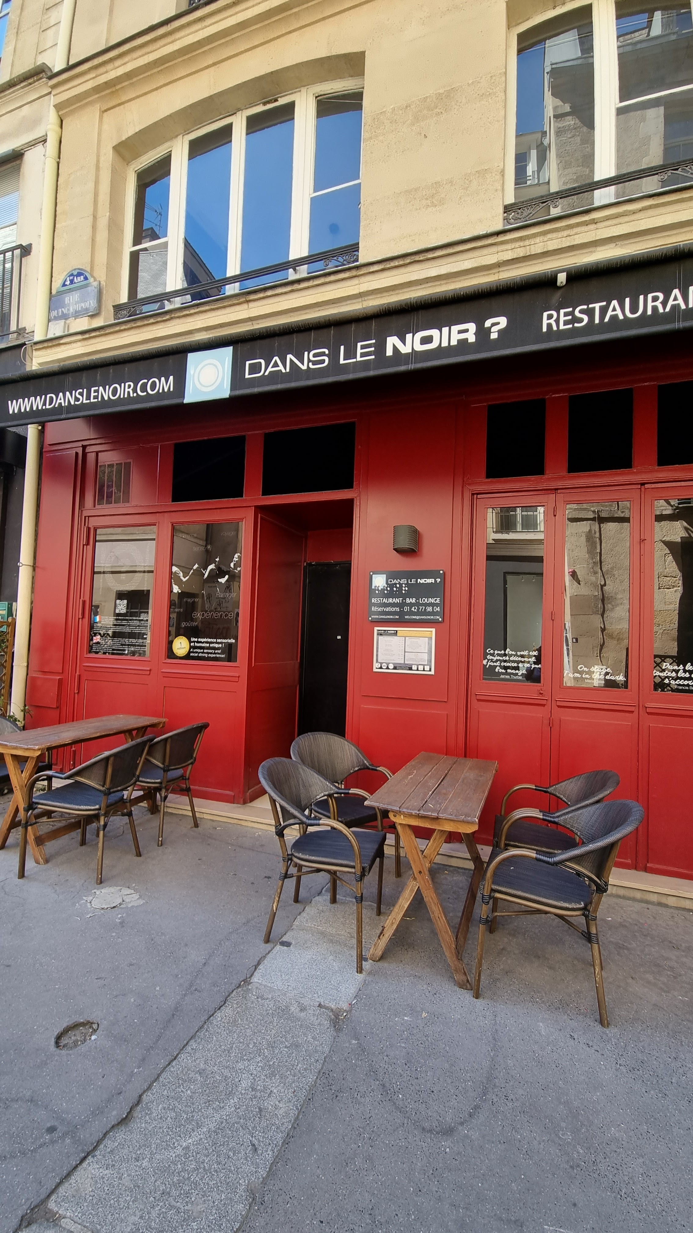 Voici toutes les informations sur le Restaurant français Restaurant Dans le Noir ? Paris qui ce trouve au 51 R. Quincampoix, 75004 Paris (75). Sur cette fiche vous trouverez les photos, l'adresse, les horaires d'ouverture, le numero de téléphone et les avis clients.Vous pouvez églement rédiger un avis si vous le souhaitez en bas de page.