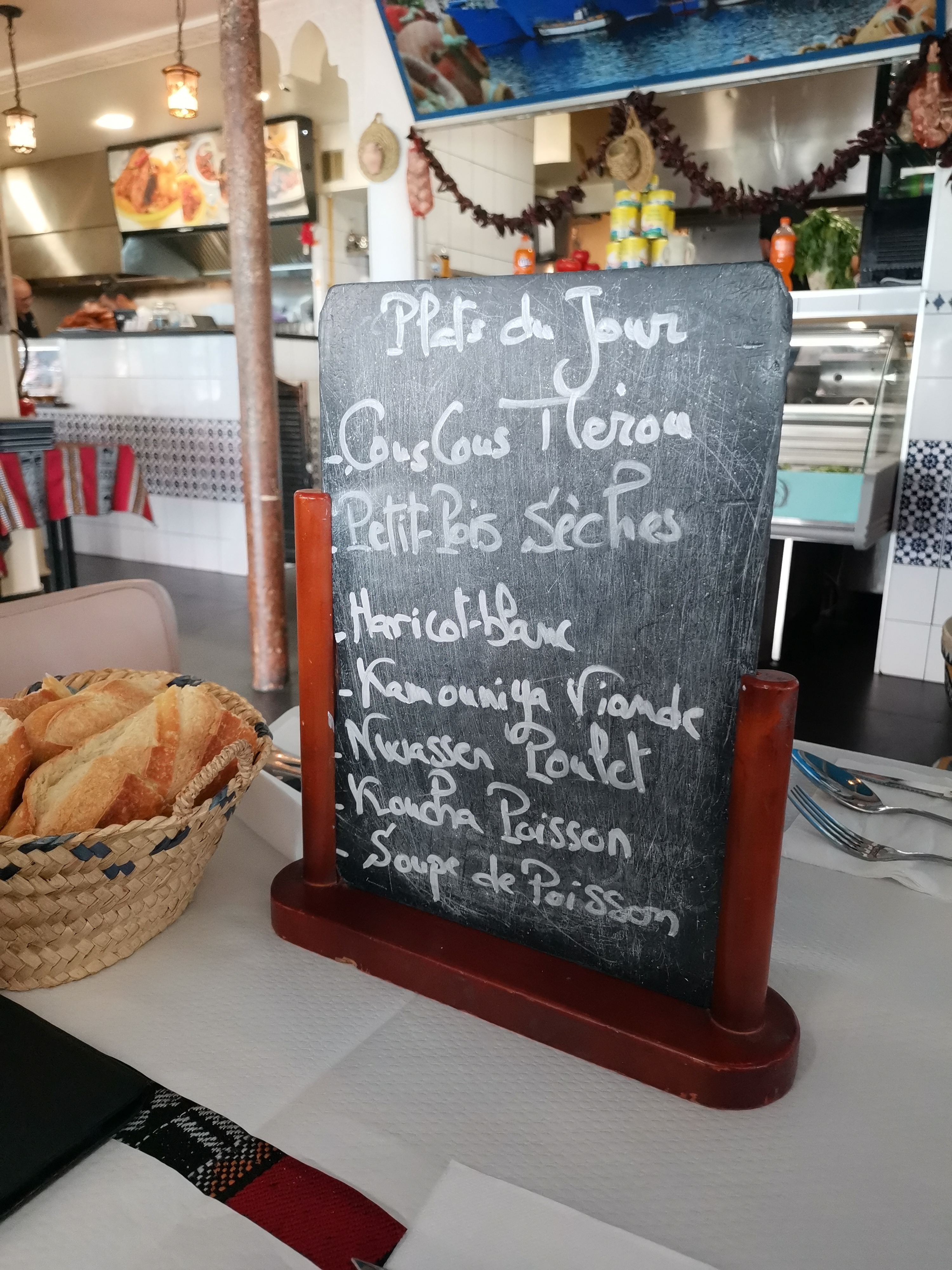 Premier couscous au poisson et c'était bon et bien servi, je recommande. Couscous au mérou donc très bien. Points négatifs: -Le pain servi, franchement c'était du pain de qualité très basse, j'ai pas le souvenir d'avoir mangé dans un restau qui sert le pain le moins chère du carrefour du coin, c'était surprenant pour être gentil. - Les accessoires pour faire le ménage (balaies, serpillères...) sont laissé dans la salle proche des tables à manger. ça ne se fait pas, ce genre des trucs doivent rangés proprement dans un cagibi. Mais surtout pas laissé trainer dans la salle à la vue des clients en train de manger. A part si il y a derrière cela une volonté de faire profiter d'une vue, pour le moins singulière, aux clients en train de manger un couscous. Mais personnellement je n'adhère pas trop. Bon courage!