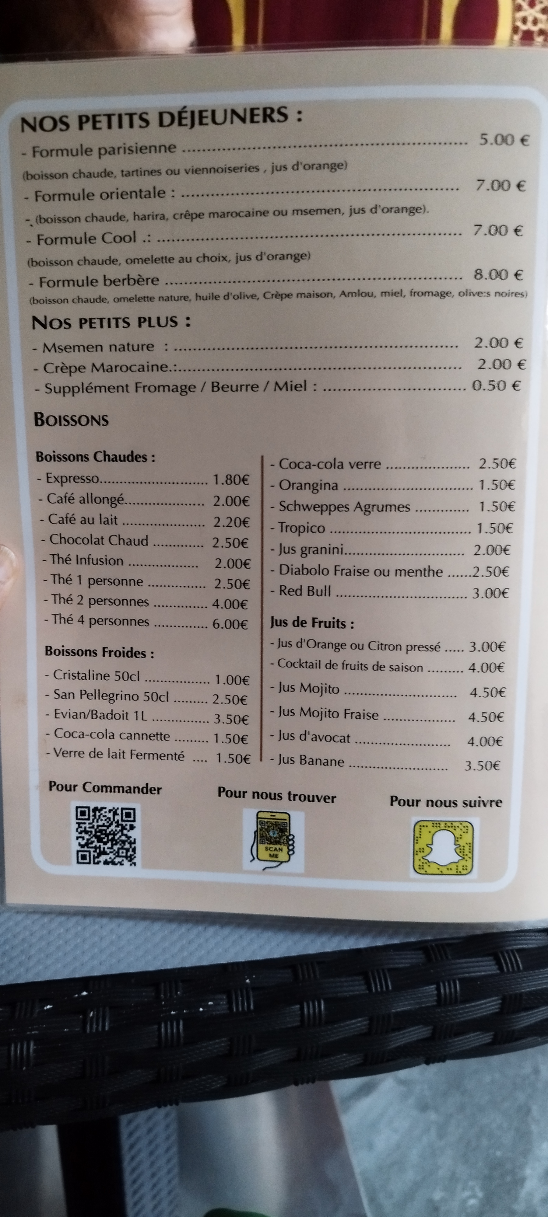 Le restaurant est agréable , personnel également mais petite déception sur les portions des tajines surtout ( à peine 150g de viande et 2 pruneaux ) surtout pour le prix payé Dommage pour les sandwiches que ce n’est pas du pain artisanal marocain car ça aurait fait toute la différence au niveau du four que de la baguette basique