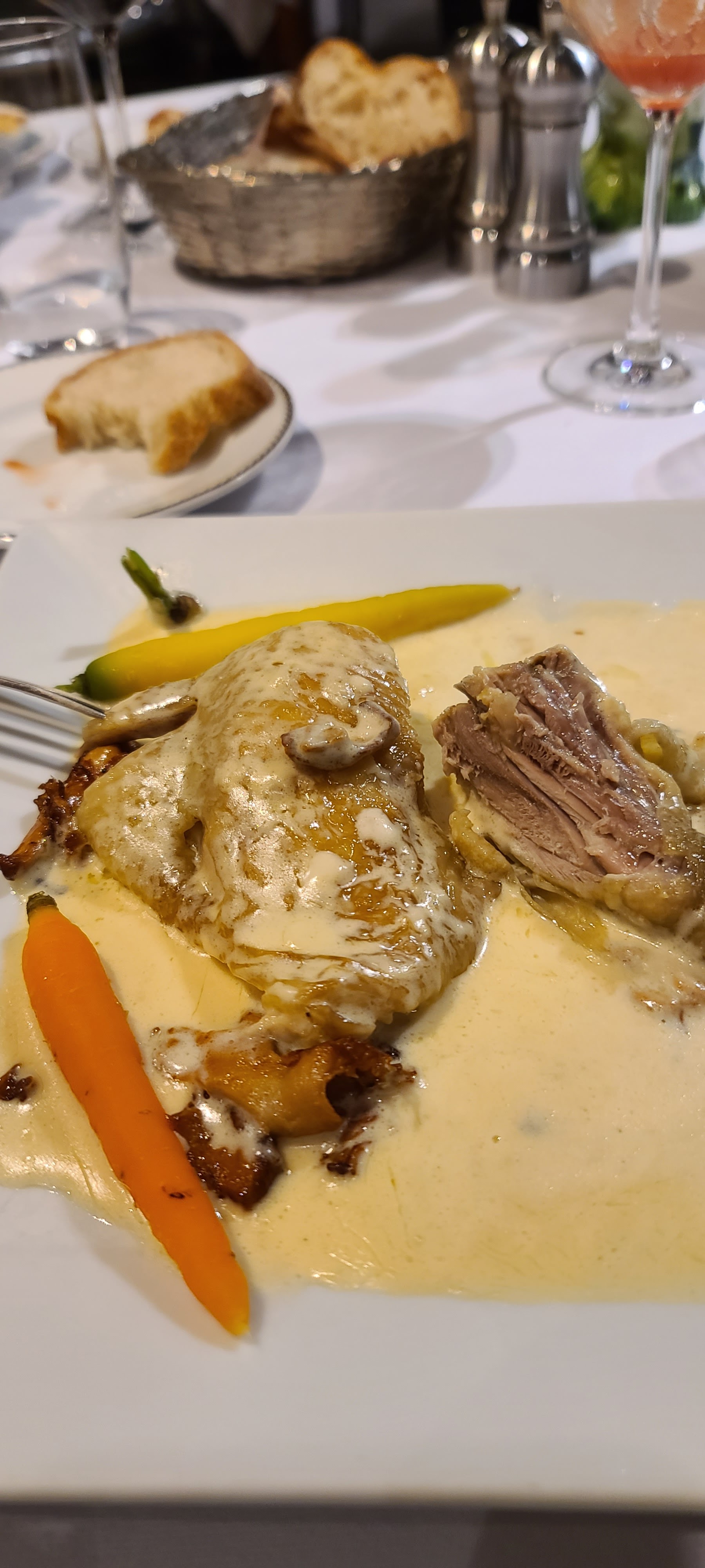 Un poulet de Bresse avec sa crème. Hum un délice. Ainsi que tout le reste. Assiette généreuse. Services sympathique nous sommes à l'aise. Restaurant de caractère très agréable. Je recommande.