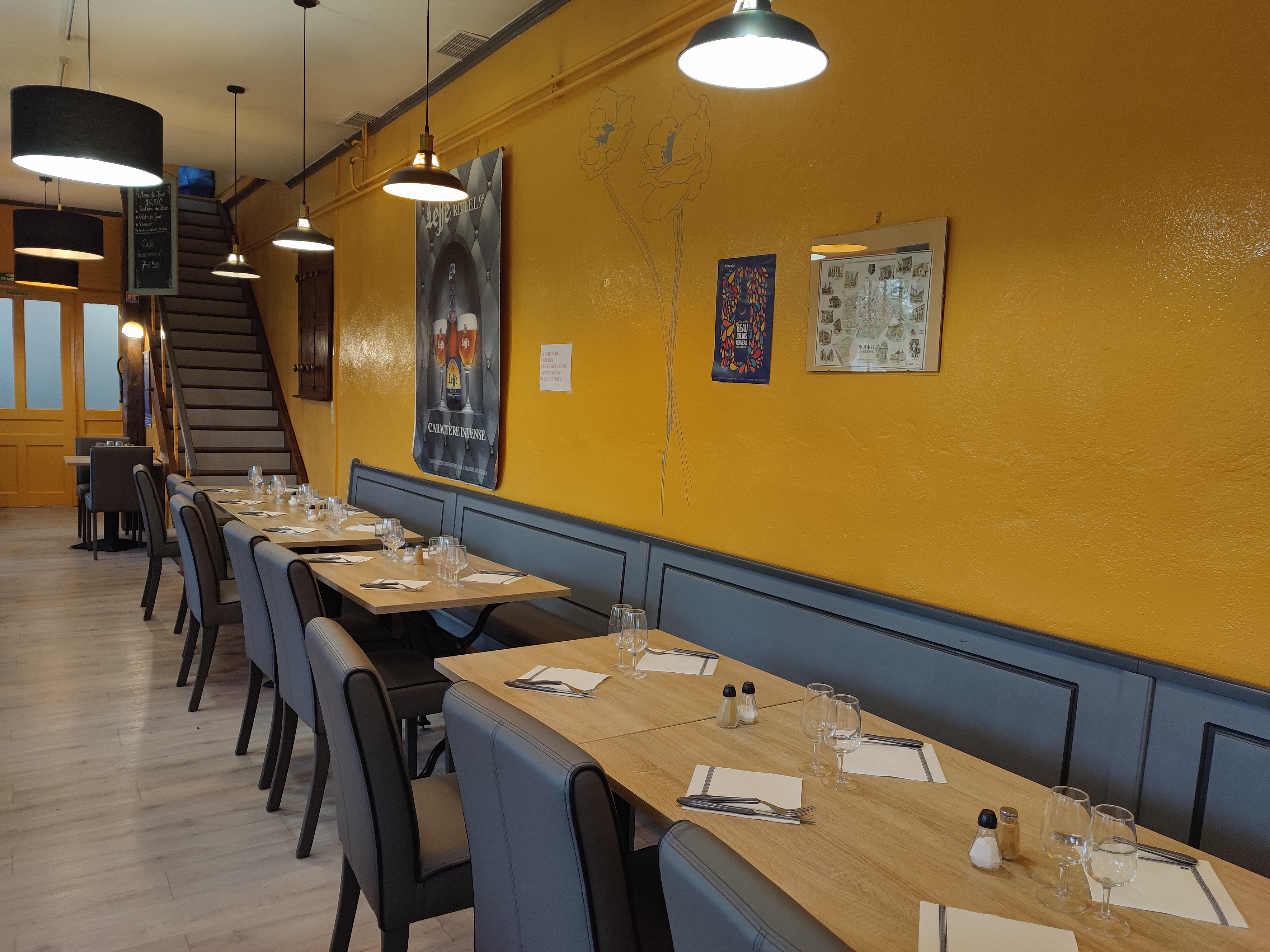 Je suis bien déçu de ce restaurant. Un service très long, la qualité des produits n'est pas vraiment là (ex: tartare de bœuf, je me retrouve avec de la viande haché...). Le jeune serveur est agréable mais le propriétaire a besoin de retrouver le sourire et la bonne humeur. De plus, je suis outré car nous avons retrouvé un gros bout de verre dans l assiette, qui a été retrouvé une fois le morceau dans la bouche. Heureusement plus de peur que de mal. Les accidents ça arrivent à tout le monde. Mais le geste commercial n'y ait même pas, il était très difficile pour le patron de l'effectuer. Étant de la région, si vous voulez déguster des bons plats traditionnels, allez faire le tour dans d'autres restaurants de bourg en Bresse et alentours ça vaut plus le coup. Vous serez sûr de vous faire plaisir. Celui ci n'est qu'un restaurant de touriste avec une carte à rallonge et peu de remises en questions.
