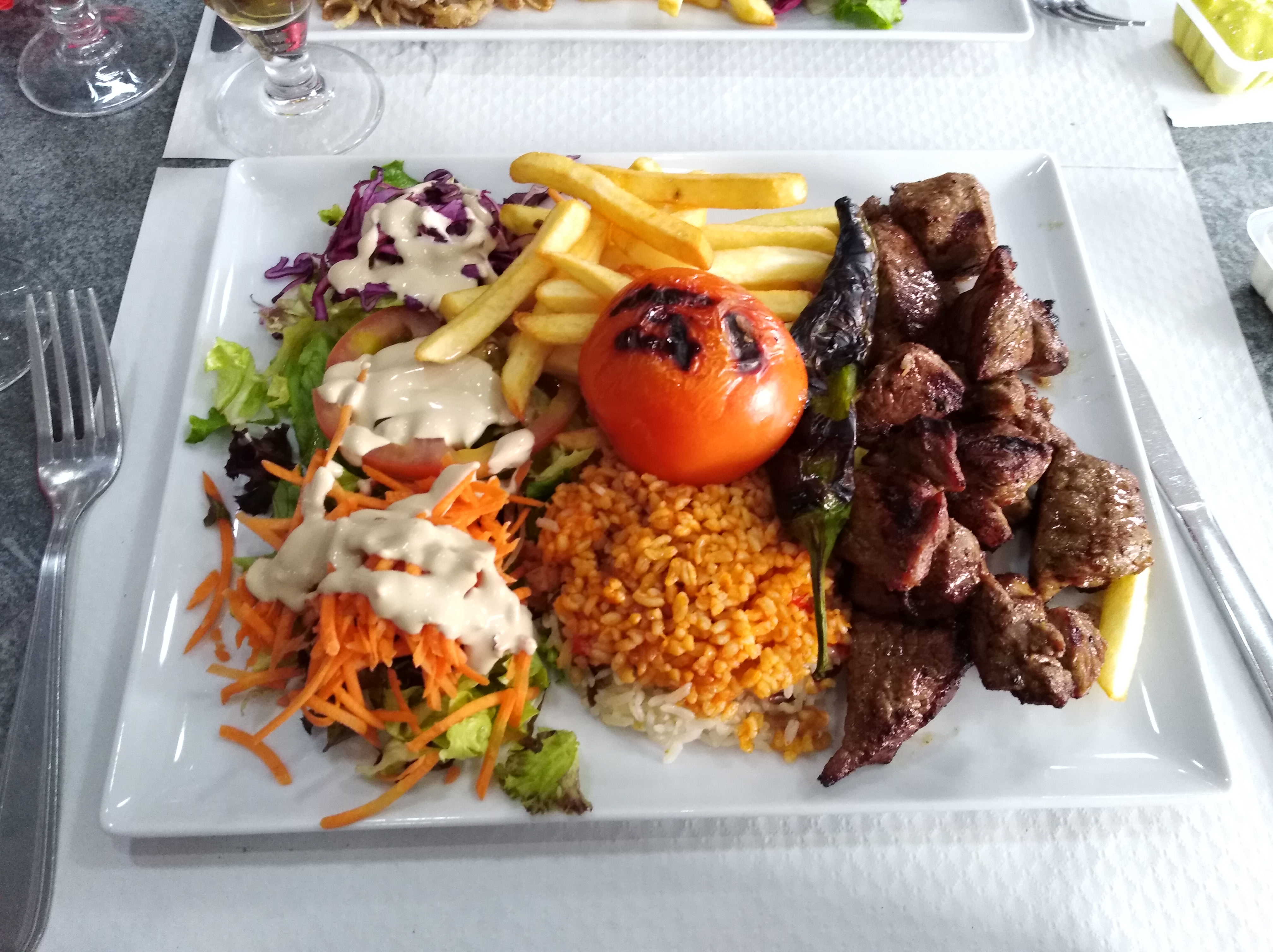 La viande est frais c’est une bonne chose! J’ai commandé une assiette ont m’a pas demander si je voulais des frites bulgur ou du blé. Ou si je voulais la salade ou autre .. les serveuse etais fatigué un peu du a le travaille normal . C’est que j’ai adoré elle m’ont ramené une carave d’eau + ma boisson avec un verre au top bon courage je a vous