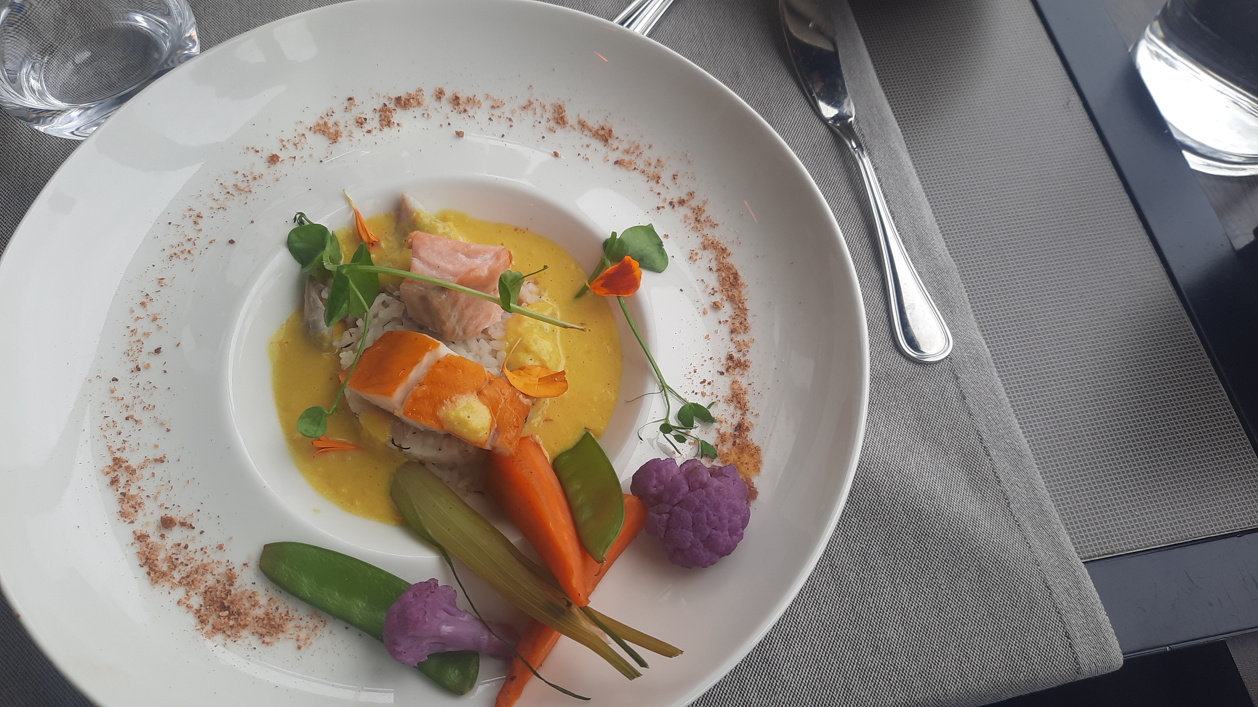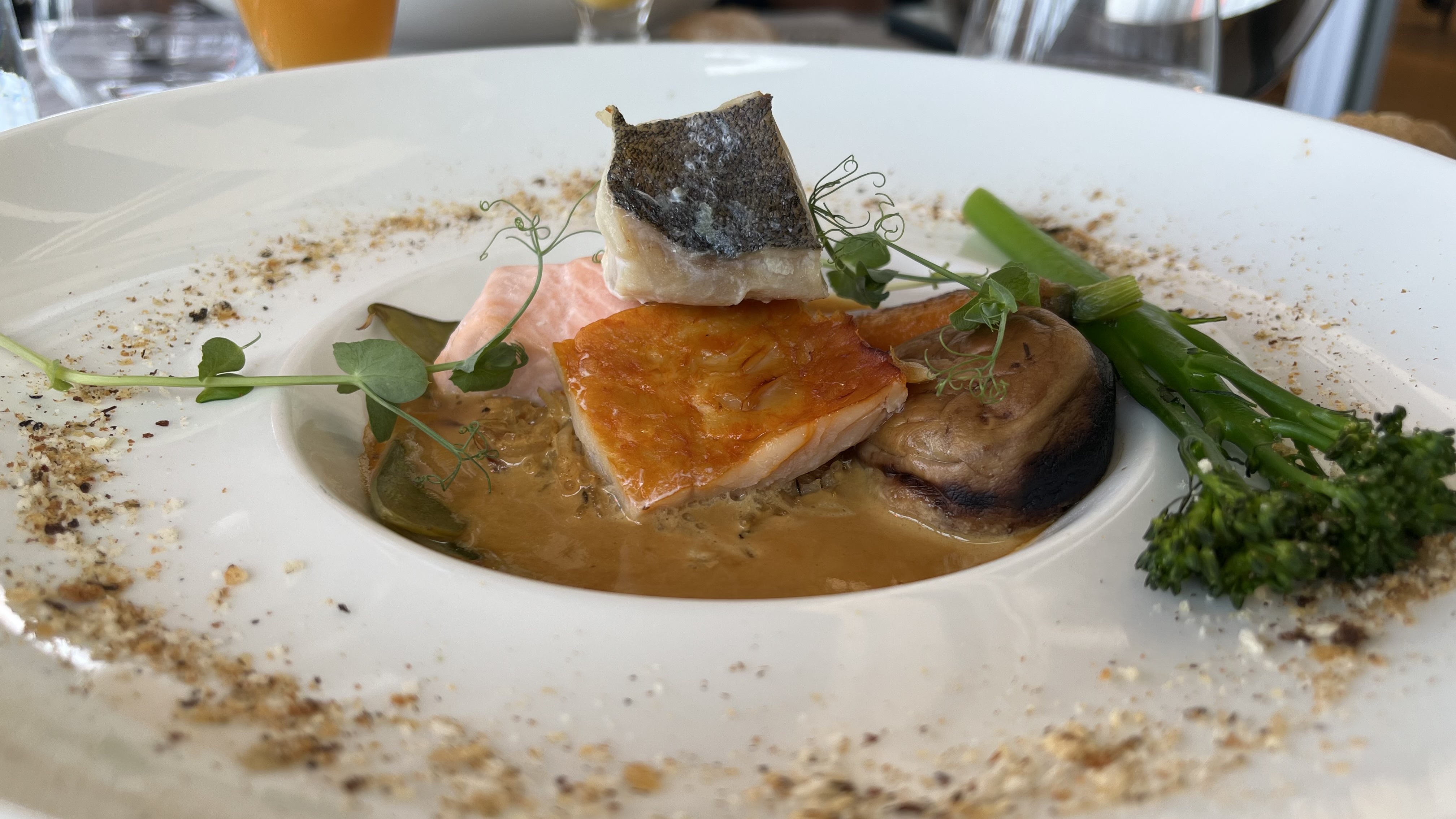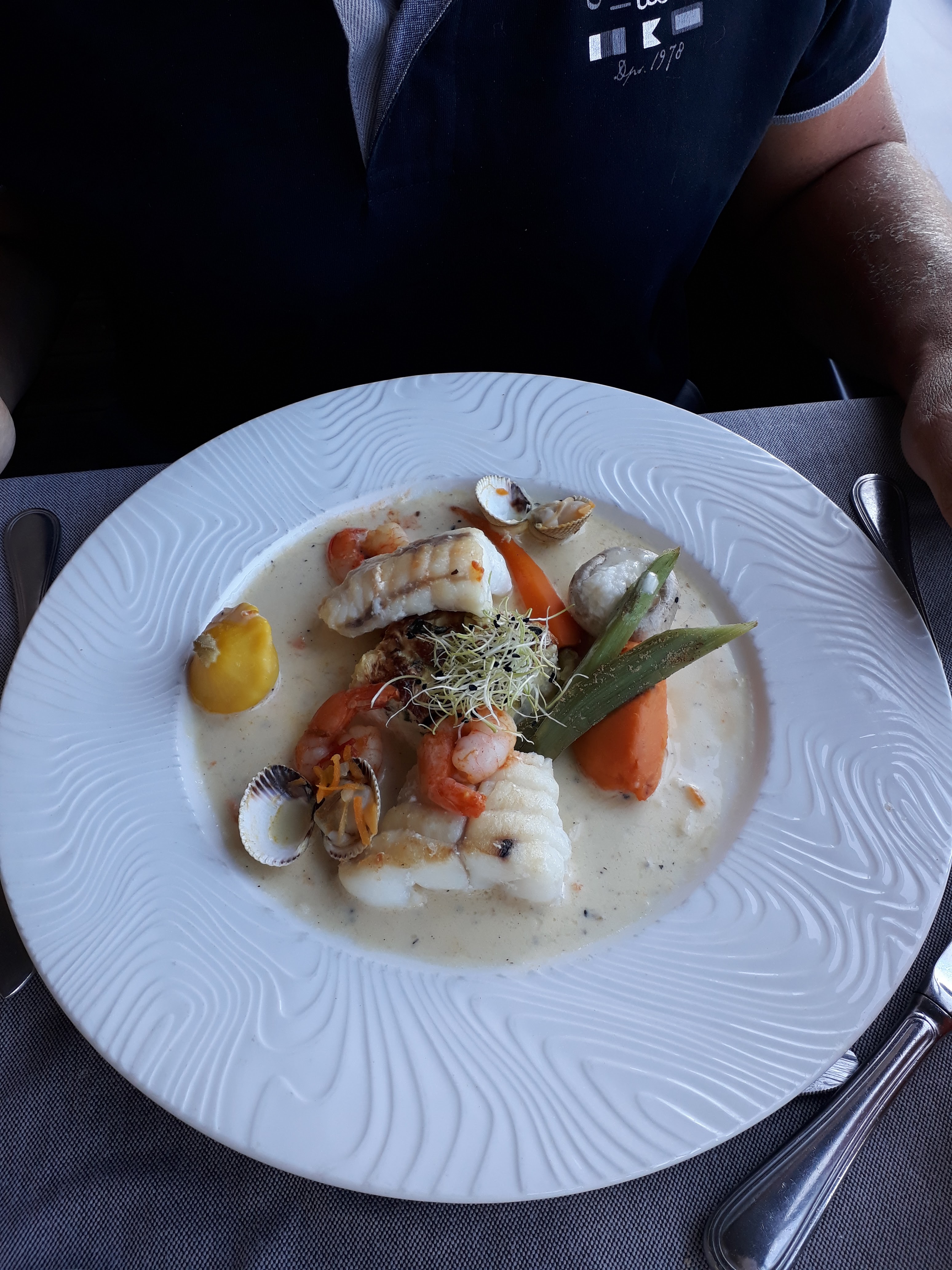 Nous avons eu la chance d'avoir une table prêt de la fenêtre et avons pu admirer le paysage, la vue mer. La cuisine est bonne, assez classique dans les saveurs, très joliement présenté. Le service presque trop rapide, même pas le temps de finir la dernière bouchée que l'assiette est enlevée... Mais tout le monde est aimable.