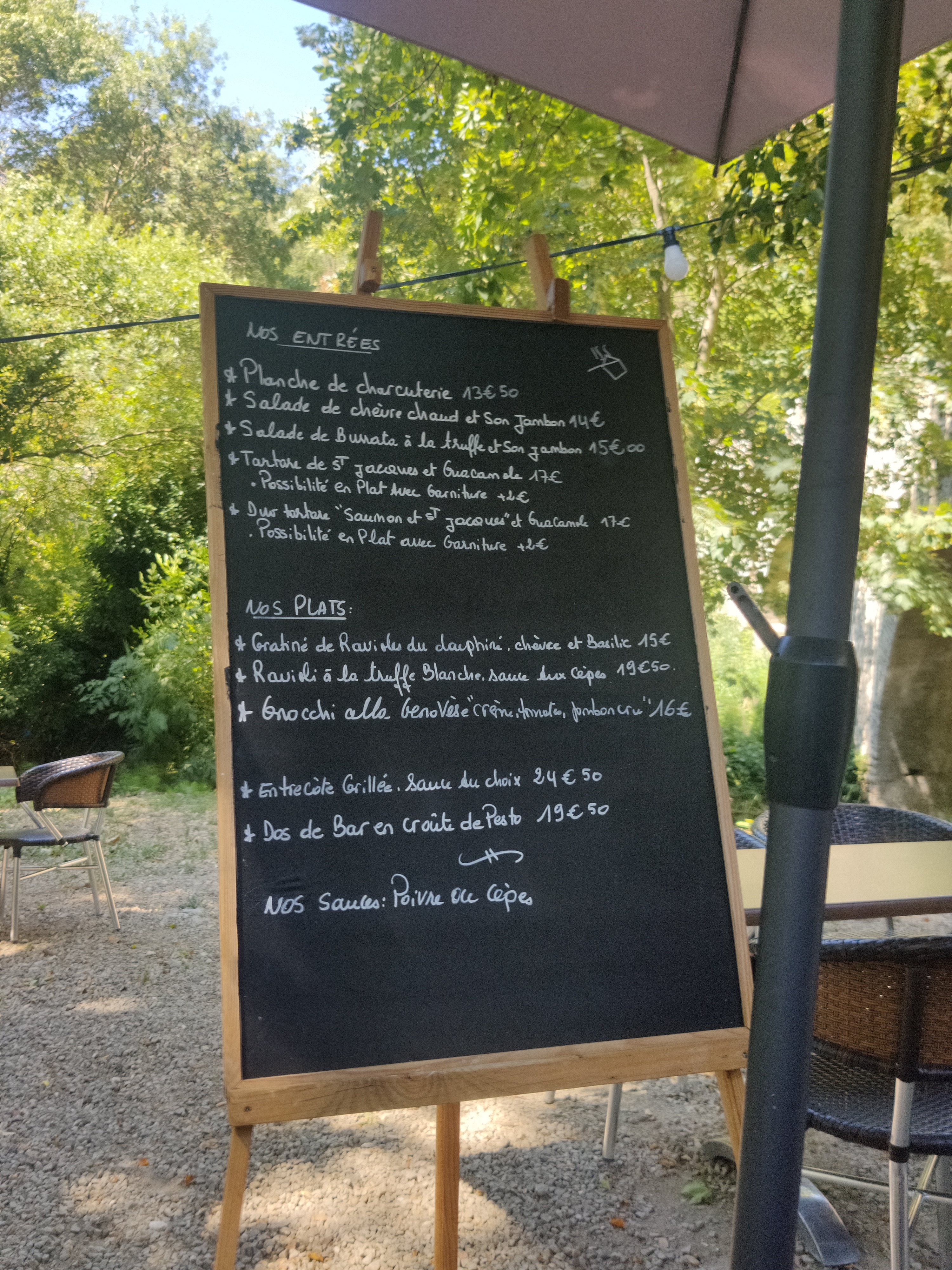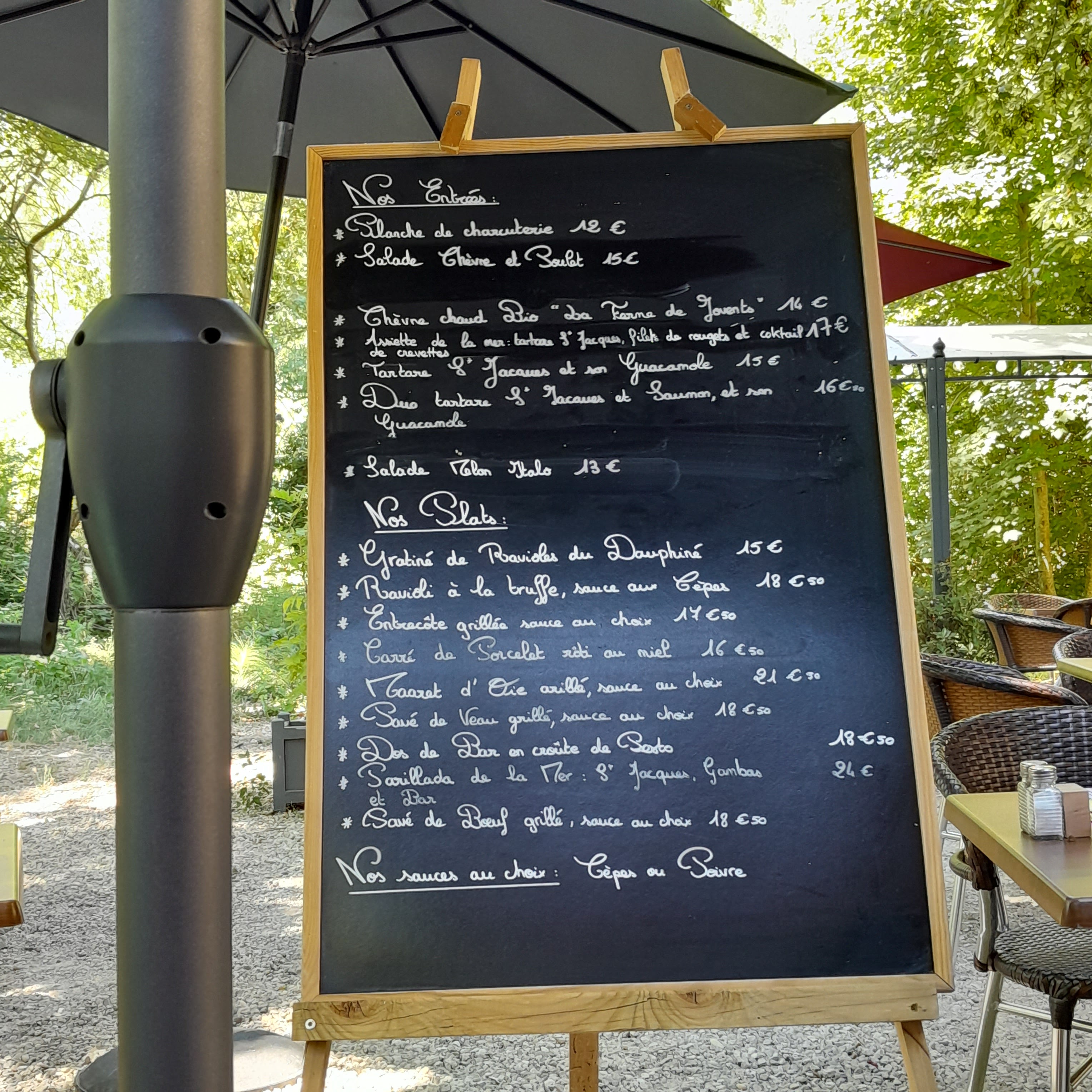 Cadre très agréable sous les arbres, facile pour se garer, personnel très gentil et en plus c est EXCELLENT!!!!