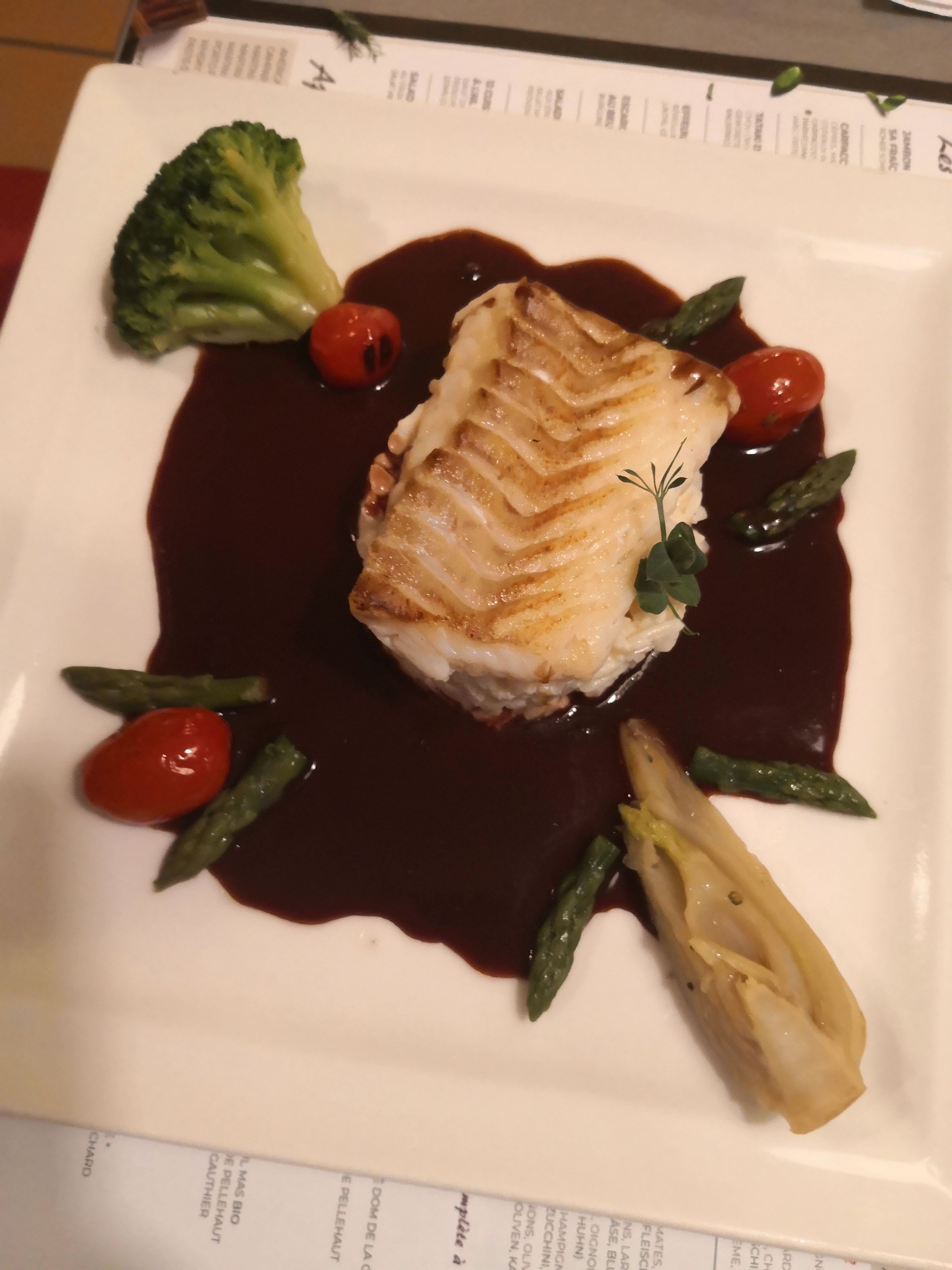 À mon avis, la nourriture était très bonne. J'ai eu une salade de poire, de noix et de roquefort en entrée et du bar, découpé à table, en plat principal. Je ne voulais pas de dessert. Un menu coûte 36 €, que vous pouvez composer à partir du menu. Nous nous sommes assis en terrasse. Souvent complet, alors réservez à l'avance.
